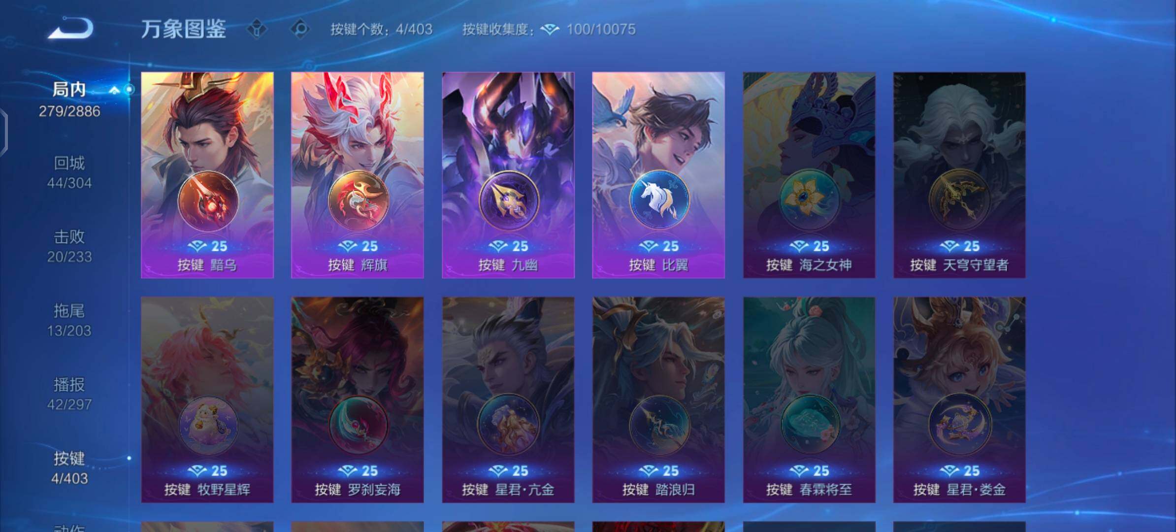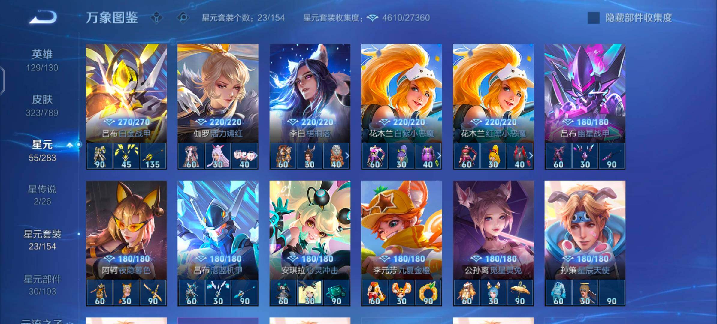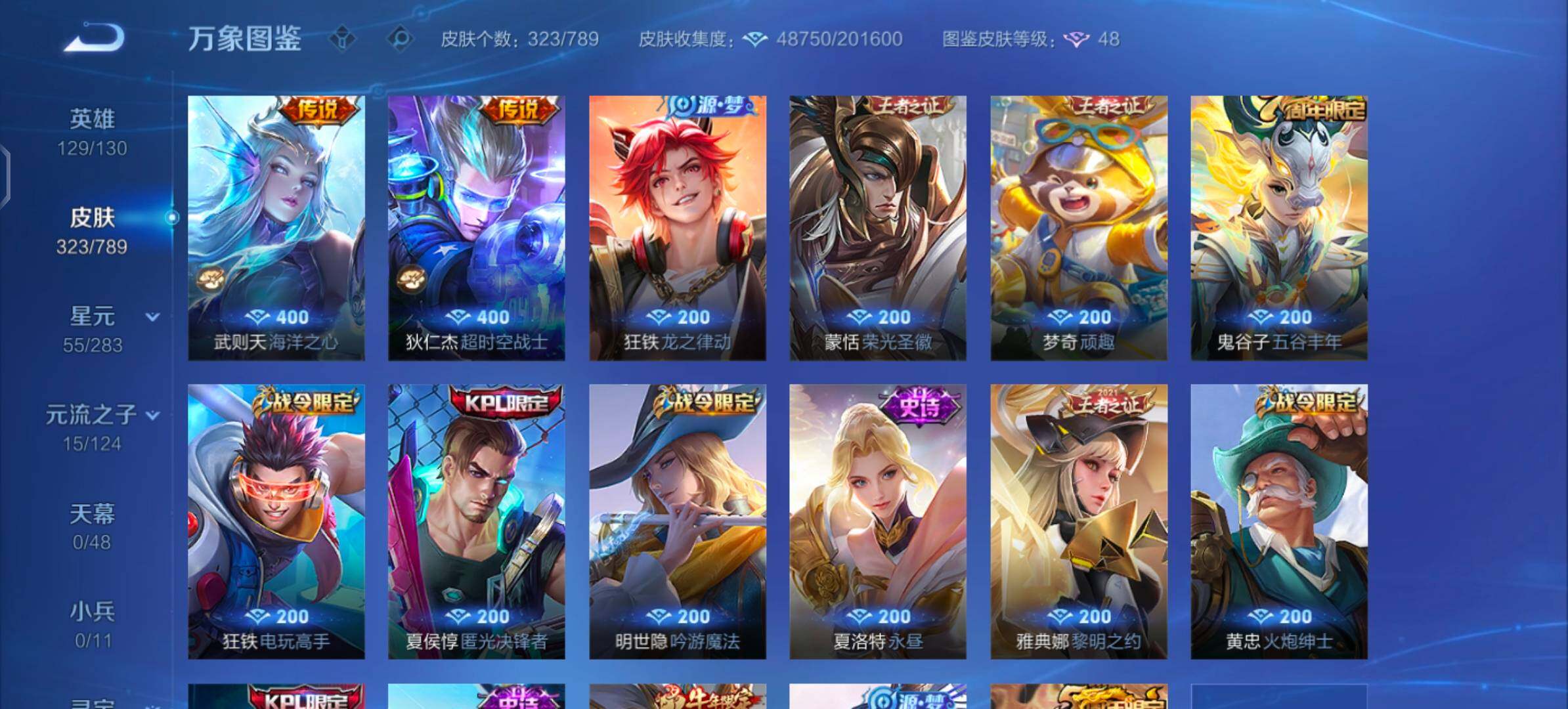 【史诗皮肤】:狂铁龙之律动,蒙恬荣光圣徽,梦奇顽趣,鬼谷子五谷丰年,狂铁电玩高手,夏侯惇匿光决锋者,明世隐吟游魔法,夏洛特永昼,雅典娜黎明之约,黄忠火炮绅士,镜匿光追影者,杨戬天秀启明,吕布御风骁将,云中君纤云弄巧,裴擒虎李小龙,百里玄策原初追逐者,蒙犽狂想玩偶喵,马可波罗暗影游猎,黄忠烈魂,赵云龙胆,橘右京修罗,上官婉儿梁祝,兰陵王驯魔猎人,公孙离无限星赏官,狄仁杰鹰眼统帅,鲁班七号狮舞东方,裴擒虎天狼狩猎者,伽罗箭羽风息,花木兰瑞麟志,苏烈玄武志,孙悟空大圣娶亲,露娜一生所爱,干将莫邪冰霜恋舞曲,百里守约朱雀志,铠青龙志,大乔猫狗日记,孙策猫狗日记,嬴政白昼王子,蔡文姬奇迹圣诞,东皇太一逐梦之光,杨玉环遇见飞天,阿轲节奏热浪,白起星夜王子,程咬金功夫厨神,李元芳逐浪之夏,公孙离蜜橘之夏,刘禅天才门将,哪吒逐梦之翼,裴擒虎梅西,蔡文姬舞动绿茵,铠曙光守护者,百里守约特工魅影,花木兰青春决赛季,庄周云端筑梦师,后羿辉光之辰,安琪拉心灵骇客,雅典娜冰冠公主,亚瑟心灵战警,诸葛亮黄金分割率,兰陵王暗隐猎兽者,小乔缤纷独角兽,夏侯惇乘风破浪,韩信逐梦之影,刘邦德古拉伯爵,花木兰水晶猎龙者,赵云引擎之心,孙悟空至尊宝,王昭君凤凰于飞,貂蝉逐梦之音,关羽冰锋战神,虞姬霸王别姬,项羽霸王别姬,韩信白龙吟,张飞乱世虎臣,妲己热情桑巴,安琪拉魔法小厨娘,吕布末日机甲,李白千年之狐,曹操幽灵船长,刘禅绅士熊喵,吕布圣诞狂欢,墨子金属风暴,墨子龙骑士,妲己女仆咖啡,妲己魅力维加斯,嬴政摇滚巨星,嬴政暗夜贵公子,孙尚香水果甜心,孙尚香蔷薇恋人,宫本武藏鬼剑武藏,廉颇地狱岩魂,狄仁杰魔术师,王昭君偶像歌手,甄姬冰雪圆舞曲,貂蝉圣诞恋歌,赵云未来纪元,赵云皇家上将,阿轲暗夜猫娘,露娜紫霞仙子