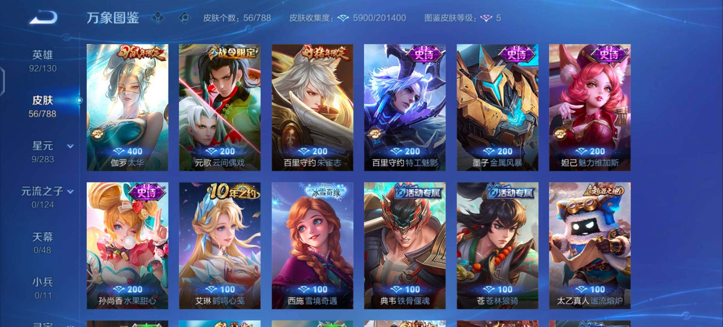 【史诗皮肤】:元歌云间偶戏,狄仁杰鹰眼统帅,百里守约朱雀志,百里守约特工魅影,墨子金属风暴,妲己魅力维加斯,孙尚香水果甜心