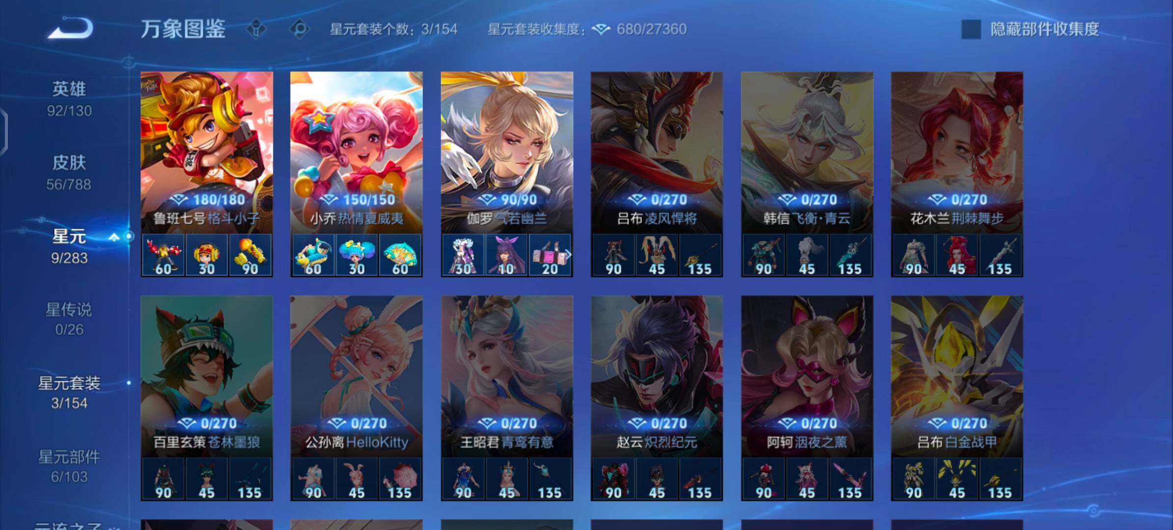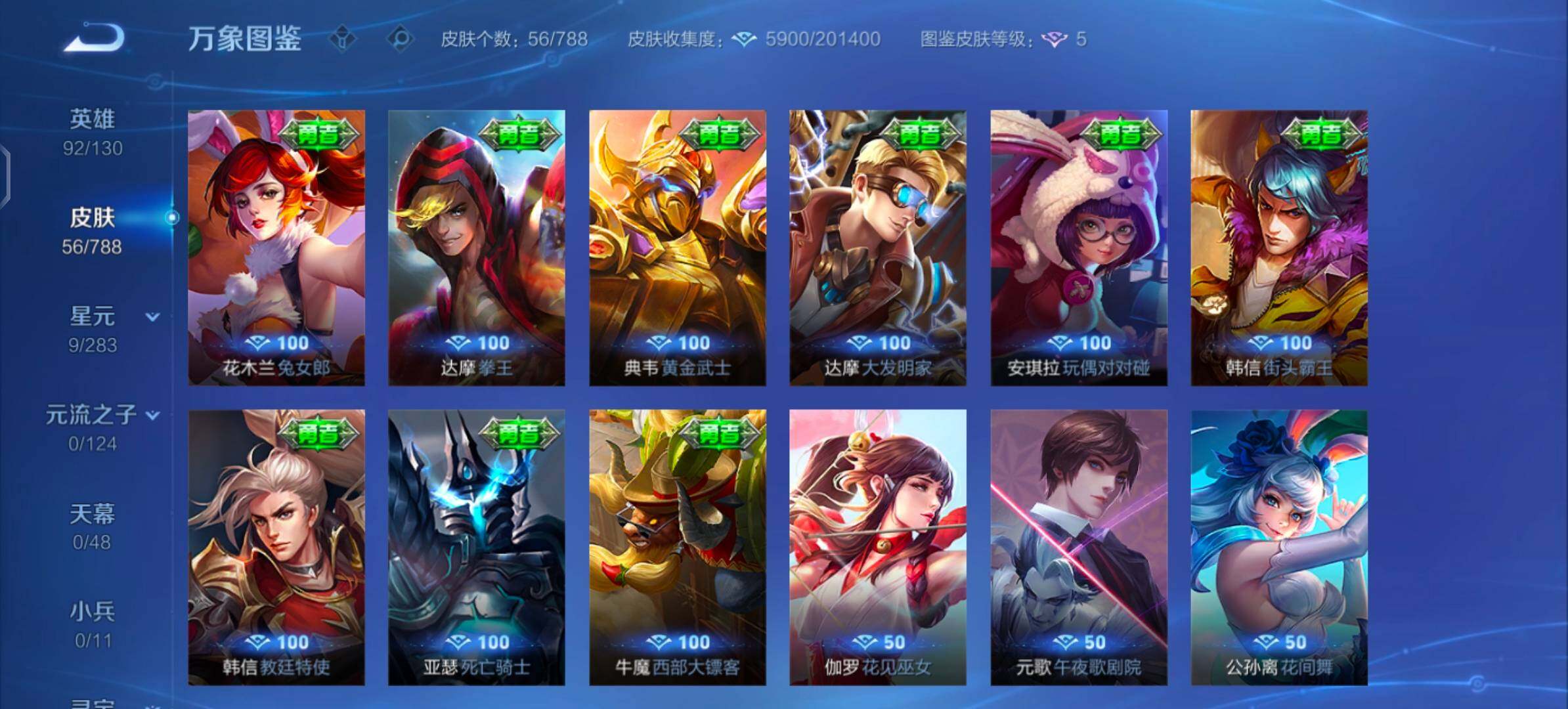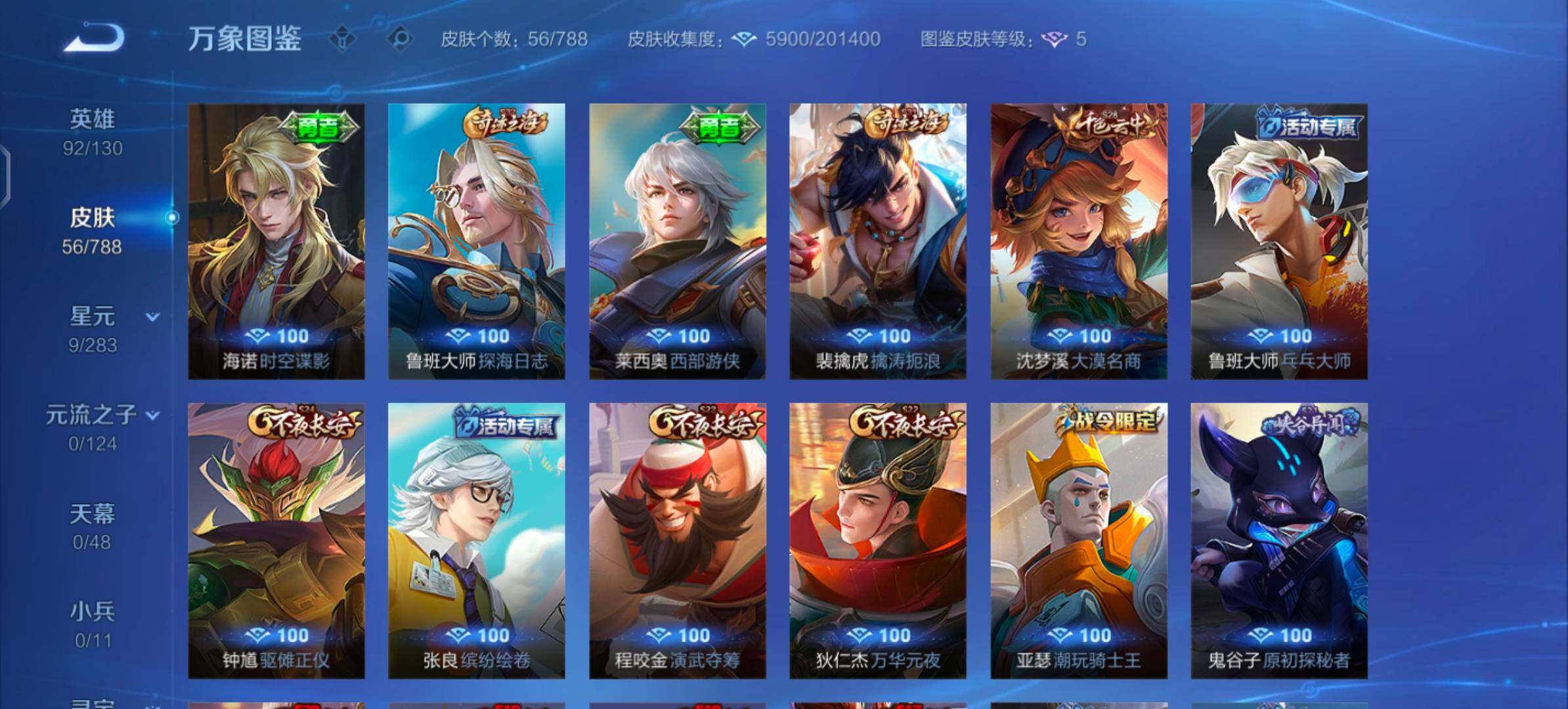 【其他皮肤】:艾琳鹤鸣心笺,西施雪境奇遇,典韦铁骨偃魂,太乙真人谧流熔炉,苍苍林狼骑,海诺时空谍影,鲁班大师探海日志,莱西奥西部游侠,裴擒虎擒涛扼浪,沈梦溪大漠名商,鲁班大师乓乓大师,钟馗驱傩正仪,张良缤纷绘卷,程咬金演武夺筹,亚瑟潮玩骑士王,狄仁杰万华元夜,鬼谷子原初探秘者,老夫子醍醐杖,明世隐疑决卦,弈星混沌棋,夏侯惇朔风刀,姜子牙炽热元素使,孙膑归虚梦演,盾山御銮,苏烈坚韧之力,孙尚香沉稳之力,老夫子功夫老勺,狄仁杰阴阳师,宫本武藏万象初新,花木兰兔女郎,达摩拳王,亚瑟死亡骑士,典韦黄金武士,安琪拉玩偶对对碰,牛魔西部大镖客,达摩大发明家,韩信街头霸王,韩信教廷特使,伽罗花见巫女,元歌午夜歌剧院,公孙离花间舞,女娲尼罗河女神,苏烈爱与和平,百里守约绝影神枪,东皇太一东海龙王,黄忠芝加哥教父,诸葛亮星航指挥官,哪吒三太子