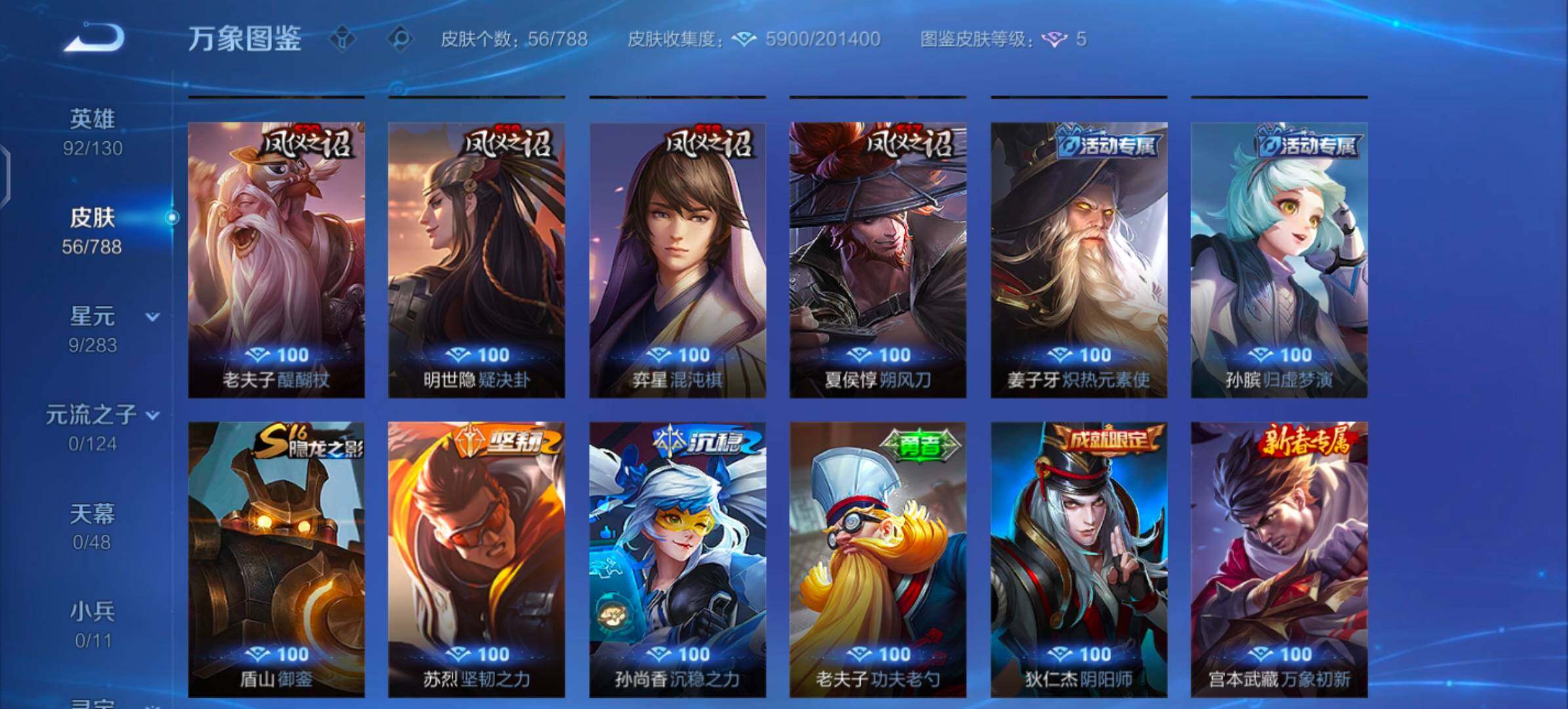 【赛季限定】:盾山御銮,夏侯惇朔风刀,弈星混沌棋,明世隐疑决卦,老夫子醍醐杖,鬼谷子原初探秘者,狄仁杰万华元夜,程咬金演武夺筹,钟馗驱傩正仪,沈梦溪大漠名商,裴擒虎擒涛扼浪,鲁班大师探海日志,太乙真人谧流熔炉
