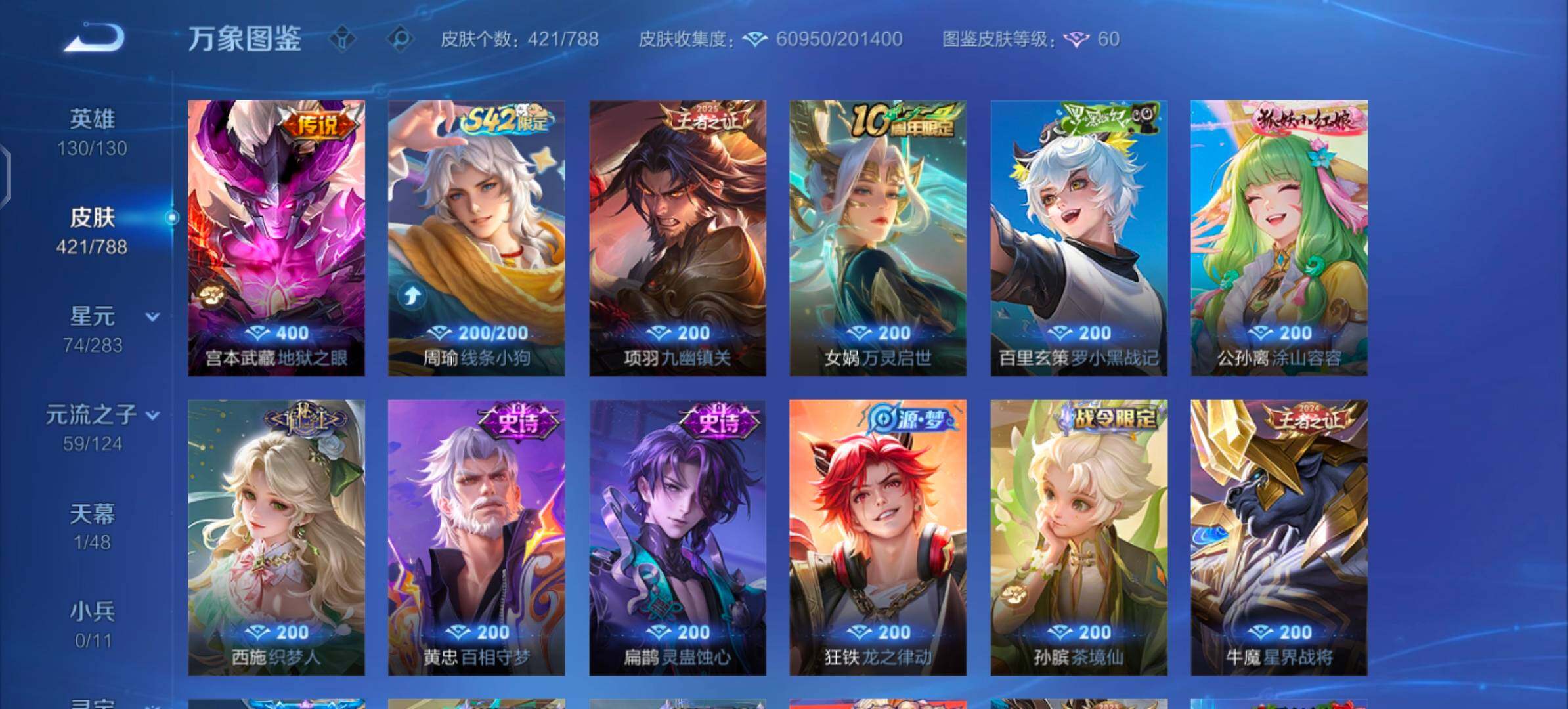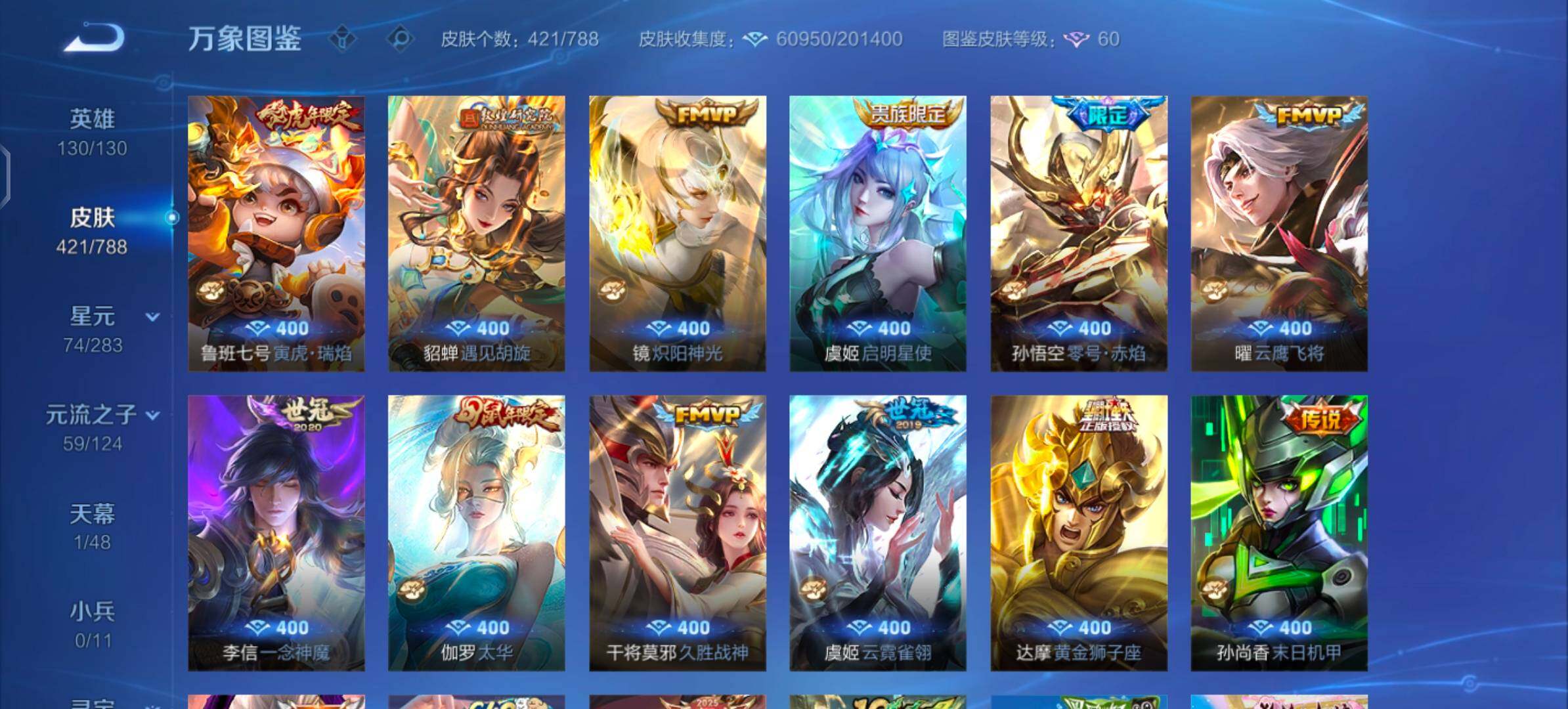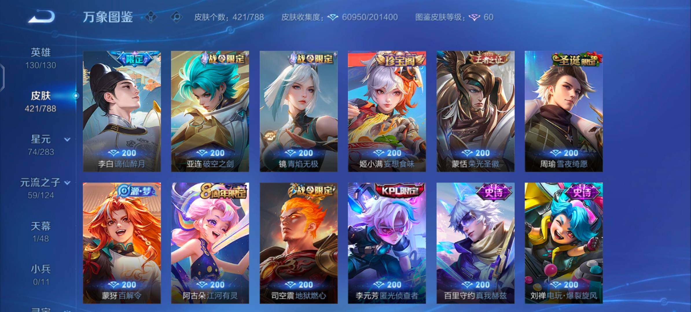【史诗皮肤】:周瑜线条小狗,项羽九幽镇关,女娲万灵启世,百里玄策罗小黑战记,公孙离涂山容容,西施织梦人,黄忠百相守梦,扁鹊灵蛊蚀心,狂铁龙之律动,孙膑茶境仙,牛魔星界战将,李白谪仙醉月,亚连破空之剑,镜青焰无极,姬小满妄想食味,蒙恬荣光圣徽,周瑜雪夜绮愿,蒙犽百解令,阿古朵江河有灵,司空震地狱燃心,李元芳匿光侦查者,百里守约真我赫兹,刘禅电玩爆裂旋风,暃星界游侠,梦奇顽趣,元歌无心,鬼谷子五谷丰年,妲己时之奇旅,钟无艳超时空战士,狂铁电玩高手,高渐离天秀音浪,夏侯惇匿光决锋者,明世隐吟游魔法,澜赏金猎手,夏洛特永昼,哪吒雪上飞焰,韩信傲雪梅枪,甄姬女儿国国王,雅典娜黎明之约,黄忠火炮绅士,镜匿光追影者,嫦娥拒霜思,司马懿暗渊魔法,庄周高山流水,孙悟空孙行者,安琪拉时之奇旅,钟馗乐园奇幻夜,沈梦溪月团寄思,干将莫邪真爱魔法,杨戬天秀启明,伽罗天狼溯光者,老夫子航海奇遇记,蒙犽龙鼓争鸣,百里玄策热力回旋,西施诗语江南,米莱狄胡桃异想国,元歌云间偶戏,云中君纤云弄巧,裴擒虎李小龙,百里玄策原初追逐者,蒙犽狂想玩偶喵,马可波罗暗影游猎,上官婉儿天狼绘梦者,黄忠烈魂,马超神威,橘右京修罗,阿轲迷踪丽影,不知火舞魅语,韩信飞衡,上官婉儿梁祝,兰陵王驯魔猎人,公孙离无限星赏官,狄仁杰鹰眼统帅,鲁班七号狮舞东方,伽罗箭羽风息,苏烈玄武志,百里守约朱雀志,铠青龙志,大乔猫狗日记,孙策猫狗日记,嬴政白昼王子,杨玉环遇见飞天,阿轲节奏热浪,白起星夜王子,程咬金功夫厨神,李元芳逐浪之夏,刘禅天才门将,蔡文姬舞动绿茵,铠曙光守护者,百里守约特工魅影,安琪拉心灵骇客,雅典娜冰冠公主,亚瑟心灵战警,甄姬游园惊梦,诸葛亮黄金分割率,兰陵王暗隐猎兽者,小乔缤纷独角兽,夏侯惇乘风破浪,刘邦德古拉伯爵,花木兰水晶猎龙者,孙悟空至尊宝,张飞乱世虎臣,吕布末日机甲,李白千年之狐,曹操幽灵船长,刘禅绅士熊喵,吕布圣诞狂欢,墨子金属风暴,墨子龙骑士,妲己女仆咖啡,妲己魅力维加斯,嬴政摇滚巨星,嬴政暗夜贵公子,嬴政优雅恋人,孙尚香水果甜心,孙尚香蔷薇恋人,宫本武藏鬼剑武藏,廉颇地狱岩魂,狄仁杰魔术师,王昭君偶像歌手,甄姬冰雪圆舞曲,貂蝉圣诞恋歌,赵云未来纪元,赵云皇家上将,露娜紫霞仙子,项羽苍穹之光,鲁班七号电玩小子
