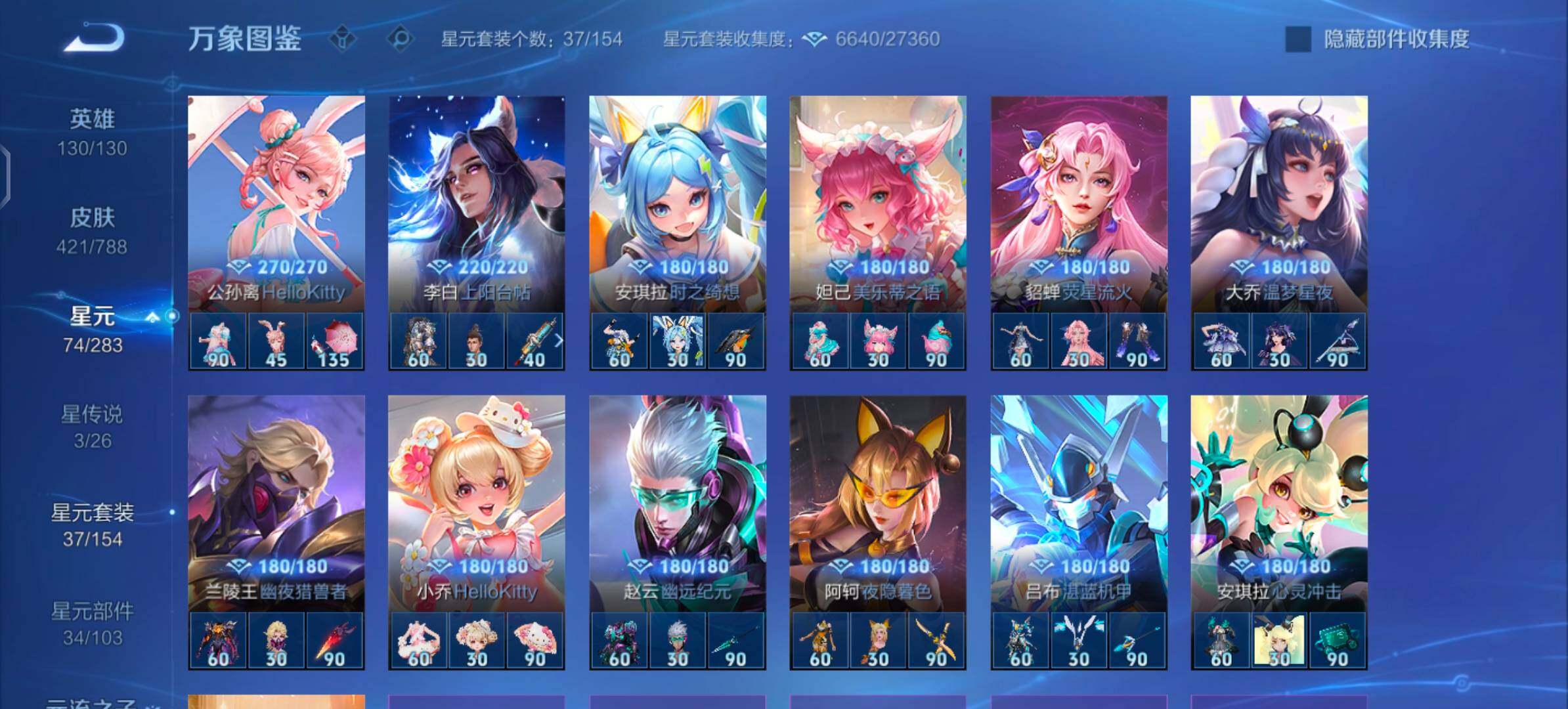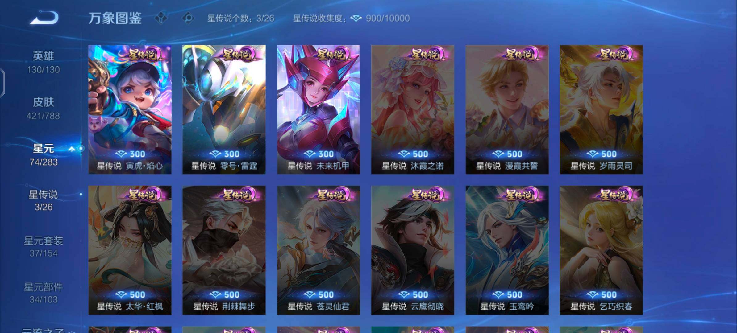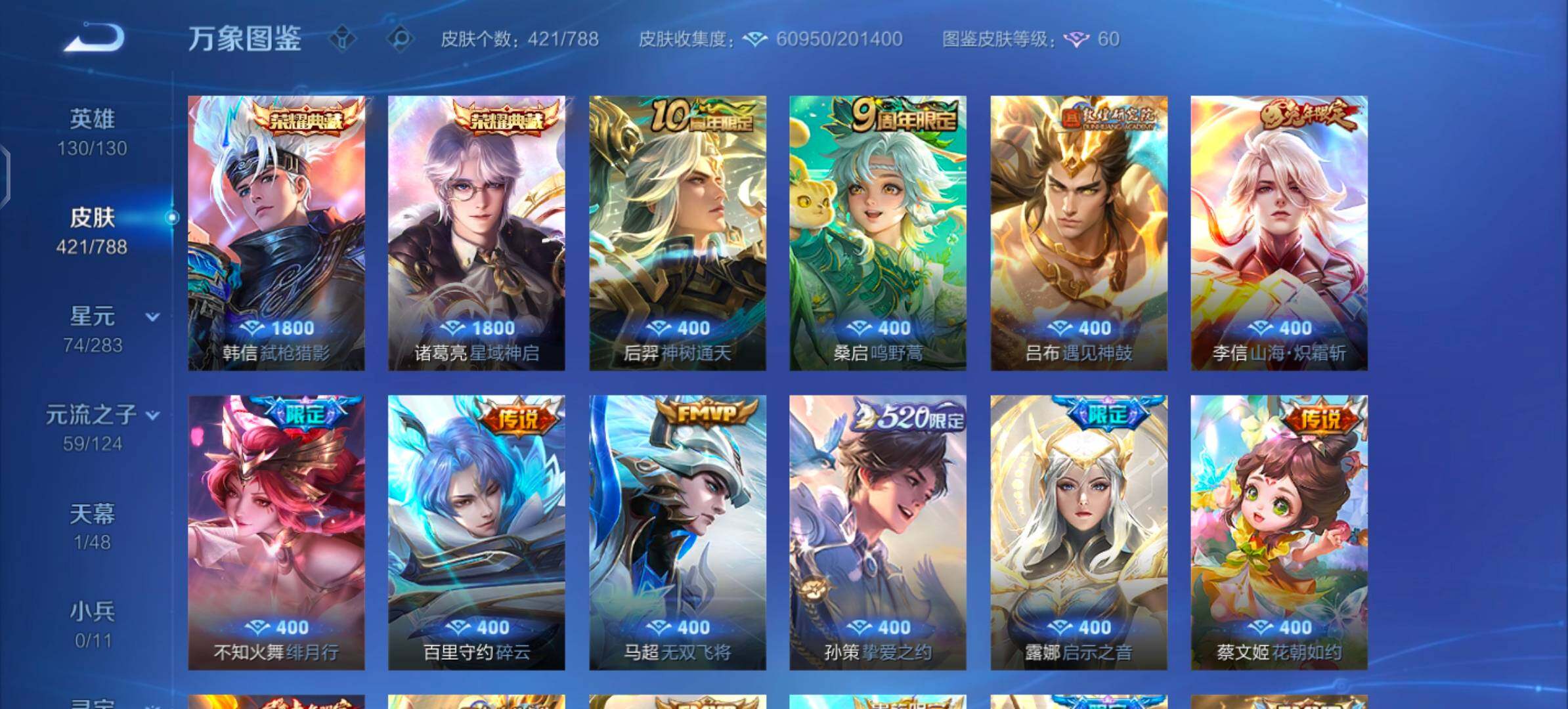 【史诗皮肤】:周瑜线条小狗,项羽九幽镇关,女娲万灵启世,百里玄策罗小黑战记,公孙离涂山容容,西施织梦人,黄忠百相守梦,扁鹊灵蛊蚀心,狂铁龙之律动,孙膑茶境仙,牛魔星界战将,李白谪仙醉月,亚连破空之剑,镜青焰无极,姬小满妄想食味,蒙恬荣光圣徽,周瑜雪夜绮愿,蒙犽百解令,阿古朵江河有灵,司空震地狱燃心,李元芳匿光侦查者,百里守约真我赫兹,刘禅电玩爆裂旋风,暃星界游侠,梦奇顽趣,元歌无心,鬼谷子五谷丰年,妲己时之奇旅,钟无艳超时空战士,狂铁电玩高手,高渐离天秀音浪,夏侯惇匿光决锋者,明世隐吟游魔法,澜赏金猎手,夏洛特永昼,哪吒雪上飞焰,韩信傲雪梅枪,甄姬女儿国国王,雅典娜黎明之约,黄忠火炮绅士,镜匿光追影者,嫦娥拒霜思,司马懿暗渊魔法,庄周高山流水,孙悟空孙行者,安琪拉时之奇旅,钟馗乐园奇幻夜,沈梦溪月团寄思,干将莫邪真爱魔法,杨戬天秀启明,伽罗天狼溯光者,老夫子航海奇遇记,蒙犽龙鼓争鸣,百里玄策热力回旋,西施诗语江南,米莱狄胡桃异想国,元歌云间偶戏,云中君纤云弄巧,裴擒虎李小龙,百里玄策原初追逐者,蒙犽狂想玩偶喵,马可波罗暗影游猎,上官婉儿天狼绘梦者,黄忠烈魂,马超神威,橘右京修罗,阿轲迷踪丽影,不知火舞魅语,韩信飞衡,上官婉儿梁祝,兰陵王驯魔猎人,公孙离无限星赏官,狄仁杰鹰眼统帅,鲁班七号狮舞东方,伽罗箭羽风息,苏烈玄武志,百里守约朱雀志,铠青龙志,大乔猫狗日记,孙策猫狗日记,嬴政白昼王子,杨玉环遇见飞天,阿轲节奏热浪,白起星夜王子,程咬金功夫厨神,李元芳逐浪之夏,刘禅天才门将,蔡文姬舞动绿茵,铠曙光守护者,百里守约特工魅影,安琪拉心灵骇客,雅典娜冰冠公主,亚瑟心灵战警,甄姬游园惊梦,诸葛亮黄金分割率,兰陵王暗隐猎兽者,小乔缤纷独角兽,夏侯惇乘风破浪,刘邦德古拉伯爵,花木兰水晶猎龙者,孙悟空至尊宝,张飞乱世虎臣,吕布末日机甲,李白千年之狐,曹操幽灵船长,刘禅绅士熊喵,吕布圣诞狂欢,墨子金属风暴,墨子龙骑士,妲己女仆咖啡,妲己魅力维加斯,嬴政摇滚巨星,嬴政暗夜贵公子,嬴政优雅恋人,孙尚香水果甜心,孙尚香蔷薇恋人,宫本武藏鬼剑武藏,廉颇地狱岩魂,狄仁杰魔术师,王昭君偶像歌手,甄姬冰雪圆舞曲,貂蝉圣诞恋歌,赵云未来纪元,赵云皇家上将,露娜紫霞仙子,项羽苍穹之光,鲁班七号电玩小子