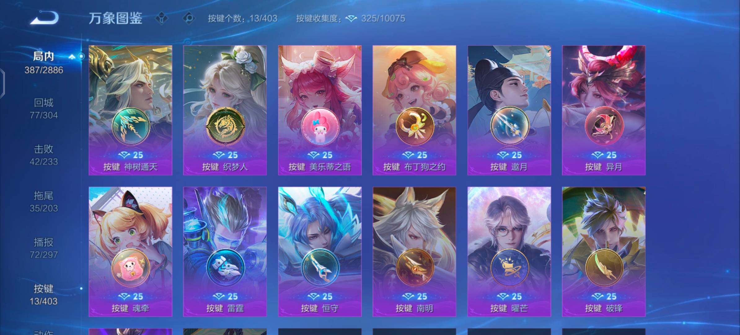 【其他皮肤】:兰陵王雾影缉谜,鲁班七号班班快跑,妲己线条小狗,桑启线条小狗,鬼谷子谜偶窥秘,虞姬溯影追猎,蚩奼极光幻客,曹操逐霄之志,艾琳鹤鸣心笺,孙权径山谋武,张良罗小黑战记,亚瑟荣光之誓,哪吒罗小黑战记,鬼谷子克喵,莱西奥踏浪烽翎,空空儿戏梦巡演,庄周锦麟游梦,云中君云械蓝图,甄姬逆浪荇歌,姬小满小满鸭,露娜命运加冕,阿古朵布丁狗之约,张良灵野札记,小乔秘证寻踪,苏烈春野闲踪,钟馗虚灵犬护,刘备浪漫序章,戈娅玫蓝誓约,少司缘灵卦秘语,姜子牙星梦巡礼,西施雪境奇遇,影魅影绮裳,马超访茗客,典韦铁骨偃魂,太乙真人谧流熔炉,苍苍林狼骑,干将莫邪雾都夜雨,米莱狄怪诞之夜,东皇太一噬灭天穹,盘古敬我三分,孙悟空神迹守卫,周瑜熔金海岸,姜子牙天穹之誓,貂蝉长夏之忆,刘备异域游侠,大司命暗都幽影,项羽苍威无极,程咬金群星魔术团,刘邦剑破天穹,沈梦溪龙舞盛年,亚瑟鸿运当头,廉颇功夫炙烤,朵莉亚金色潮汐,嫦娥漠中幻影,海诺时空谍影,鬼谷子天穹祈灯,程咬金暖冬絮语,后羿完美运算,兰陵王幻夜行动,亚连破局者,海月王牌新星,张良古海寻踪,艾琳流音漫舞,李元芳妄想特派,姬小满零食大作战,鲁班大师探海日志,莱西奥西部游侠,太乙真人劲辣红锅,裴擒虎擒涛扼浪,赵怀真太极少年,牛魔牛运亨通,猪八戒潮玩探月行,海月幻泉雾影,嫦娥暖冬兔眠,桑启海盐诗旅,戈娅危途狂花,刘备潮玩造梦师,李元芳云中旅人,甄姬落雪兰心,蒙恬蔚蓝守将,沈梦溪大漠名商,王昭君午后时光,米莱狄契约魔法,刘禅唤灵魔甲,兰陵王金庭之子,白起夜都怪侠,刘邦虎啸剑宗,程咬金无双福将,芈月幻夜卜梦,达摩沙漠行僧,马可波罗潮玩牛仔,妲己紫罗兰之誓,典韦铁甲之心,后羿圣弓游侠,苏烈千军破阵,鲁班大师乓乓大师,墨子神迹守卫,钟馗驱傩正仪,盘古重装意志,张良缤纷绘卷,程咬金演武夺筹,达摩星际陆战队,杨戬次元傲视,刘禅秘密基地,亚瑟潮玩骑士王,狄仁杰万华元夜,雅典娜单词大作战,鬼谷子原初探秘者,狂铁特工战影,猪八戒西部大镖客,老夫子醍醐杖,盾山圆桌骑士,刘邦夺宝奇兵,明世隐疑决卦,鲁班七号黑桃队长,哪吒次元突破,弈星混沌棋,夏侯惇朔风刀,姜子牙炽热元素使,沈梦溪鲨炮海盗猫,高渐离玩趣恶龙,孙膑归虚梦演,盾山御銮,钟馗神迹守卫,吕布野性能量,小乔丁香结,牛魔御旌,庄周奇妙博物学,张良幽兰居士,明世隐虹云星官,吕布猎兽之王,米莱狄御霄,项羽科学大爆炸,大乔守护之力,苏烈坚韧之力,狂铁御狮,鬼谷子幻乐之宴,李白敏锐之力,诸葛亮掌控之力,典韦穷奇,孙尚香沉稳之力,老夫子功夫老勺,狂铁命运角斗场,芈月重明,曹操烛龙,宫本武藏霸王丸,太乙真人饕餮,钟无艳海滩丽影,白起狰,墨子进击墨子号,虞姬凯尔特女王,关羽龙腾万里,扁鹊炼金王,刘备汉昭烈帝,孙膑妖精王,刘备纽约教父,庄周蜃楼王,狄仁杰阴阳师,后羿阿尔法小队,宫本武藏万象初新,刘备万事如意,甄姬花好人间,张飞五福同心,花木兰兔女郎,达摩拳王,亚瑟死亡骑士,典韦黄金武士,妲己少女阿狸,姜子牙时尚教父,孙膑天使之翼,安琪拉玩偶对对碰,宫本武藏未来纪元,扁鹊救世之瞳,扁鹊化身博士,武则天东方不败,牛魔西部大镖客,白起白色死神,程咬金爱与正义,程咬金星际陆战队,芈月红桃皇后,赵云忍炎影,赵云白执事,达摩大发明家,阿轲爱心护理,阿轲致命风华,露娜哥特玫瑰,韩信街头霸王,韩信教廷特使,项羽海滩派对,桑启画中游,暃碧珀绯影,金蝉前尘,云缨赤焰之缨,司空震启蛰,澜孤猎,阿古朵熊喵少女,蒙恬秩序猎龙将,镜冰刃幻境,蒙犽归虚梦演,鲁班大师归虚梦演,西施归虚梦演,马超幸存者,曜归虚梦演,云中君荷鲁斯之眼,瑶森,盘古创世神祝,猪八戒年年有余,嫦娥露花倒影,上官婉儿修竹墨客,李信灼热之刃,沈梦溪棒球奇才,伽罗花见巫女,盾山极冰防御线,司马懿魇语军师,孙策海之征途,元歌午夜歌剧院,米莱狄精准探案法,弈星踏雪寻梅,裴擒虎街头旋风,杨玉环霓裳曲,明世隐占星师,女娲尼罗河女神,梦奇美梦成真,苏烈爱与和平,百里玄策威尼斯狂欢,百里守约绝影神枪,铠龙域领主,鬼谷子阿摩司公爵,干将莫邪第七人偶,东皇太一东海龙王,大乔伊势巫女,黄忠芝加哥教父,诸葛亮星航指挥官,哪吒三太子,太乙真人圆桌骑士,杨戬埃及法老,苍维京掠夺者,马可波罗激情绿茵,雅典娜战争女神,夏侯惇战争骑士,蔡文姬蔷薇王座,关羽天启骑士,虞姬加勒比小姐,刘邦圣殿之光,李元芳特种部队,钟馗地府判官,李白范海辛,兰陵王隐刃,刘禅英喵野望,后羿精灵王,周瑜海军大将,孙悟空西部大镖客,孙膑未来旅行,小乔万圣前夜,张良一千零一夜,曹操超能战警,曹操死神来了,狄仁杰锦衣卫,王昭君精灵公主,老夫子潮流仙人,花木兰剑舞者,貂蝉异域舞娘,钟无艳生化警戒,露娜绯红之刃,项羽帝国元帅,高渐离金属狂潮,鲁班七号木偶奇遇记,鲁班七号福禄兄弟