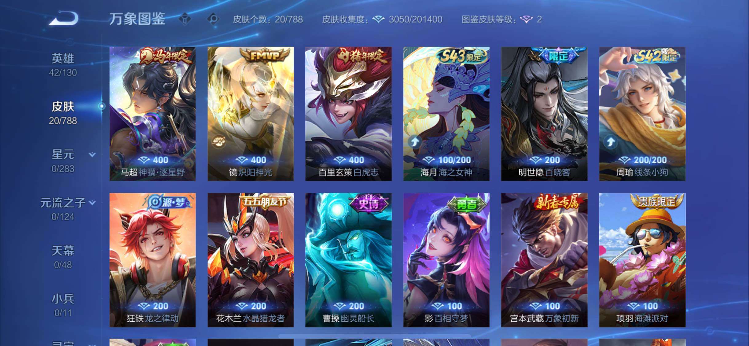 【史诗皮肤】:明世隐百晓客,周瑜线条小狗,狂铁龙之律动,花木兰水晶猎龙者,曹操幽灵船长