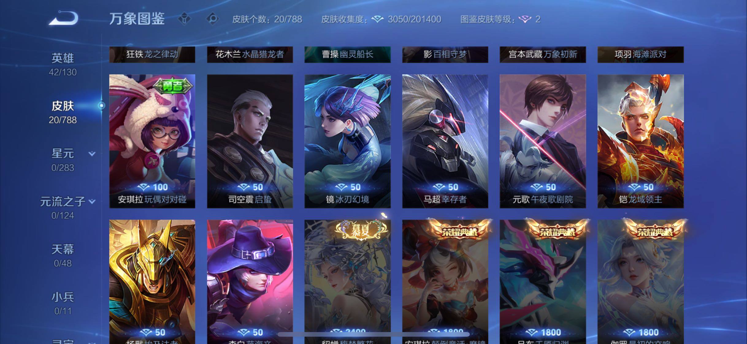 【其他皮肤】:影百相守梦,宫本武藏万象初新,安琪拉玩偶对对碰,项羽海滩派对,司空震启蛰,镜冰刃幻境,马超幸存者,元歌午夜歌剧院,铠龙域领主,杨戬埃及法老,李白范海辛