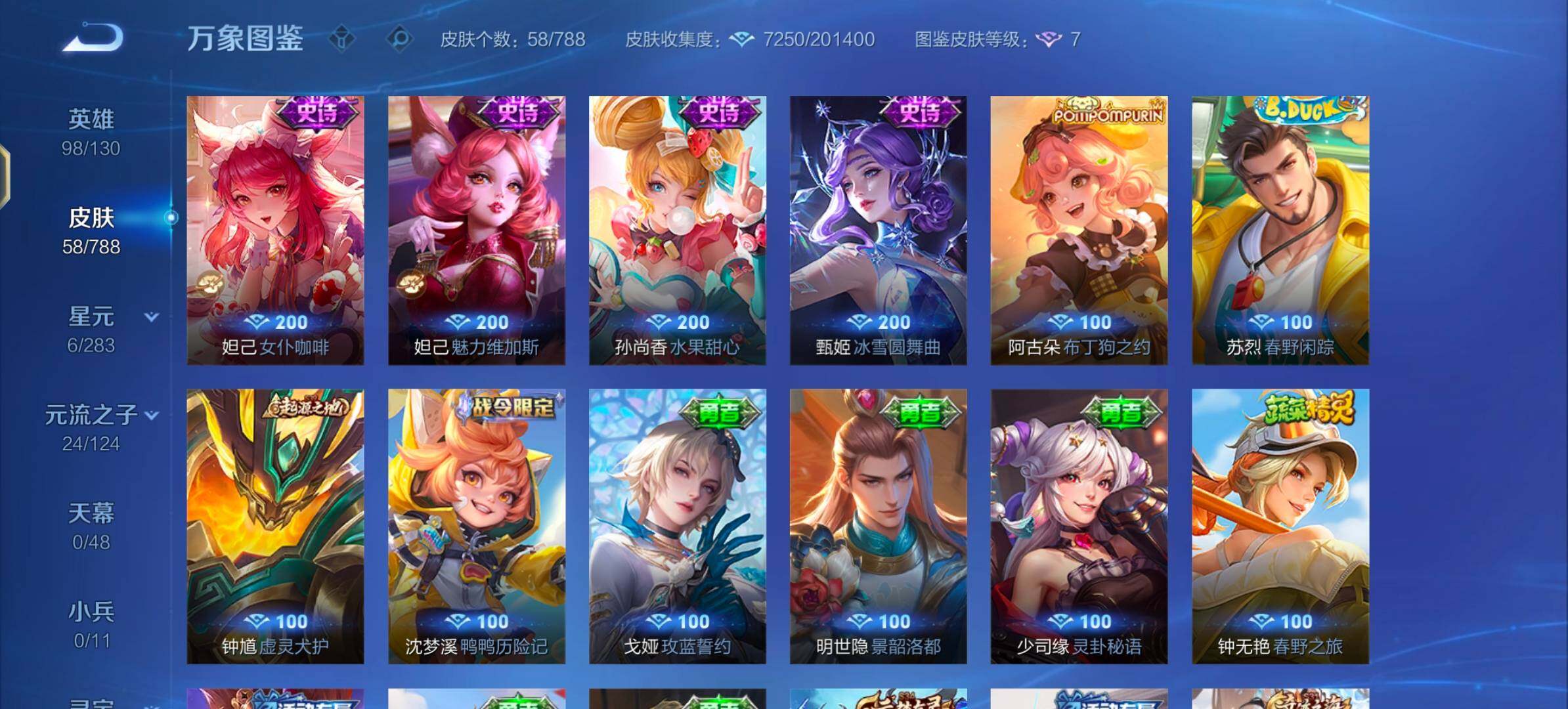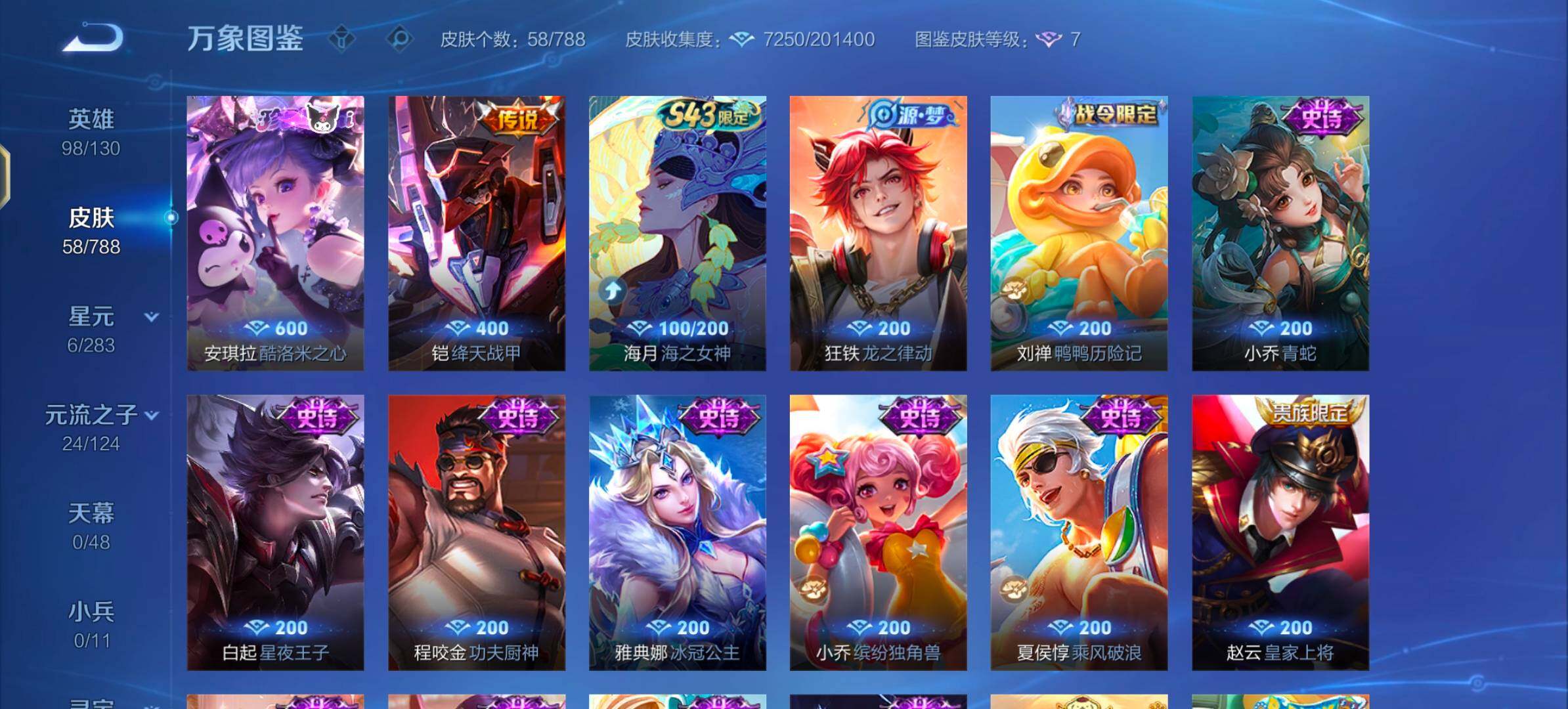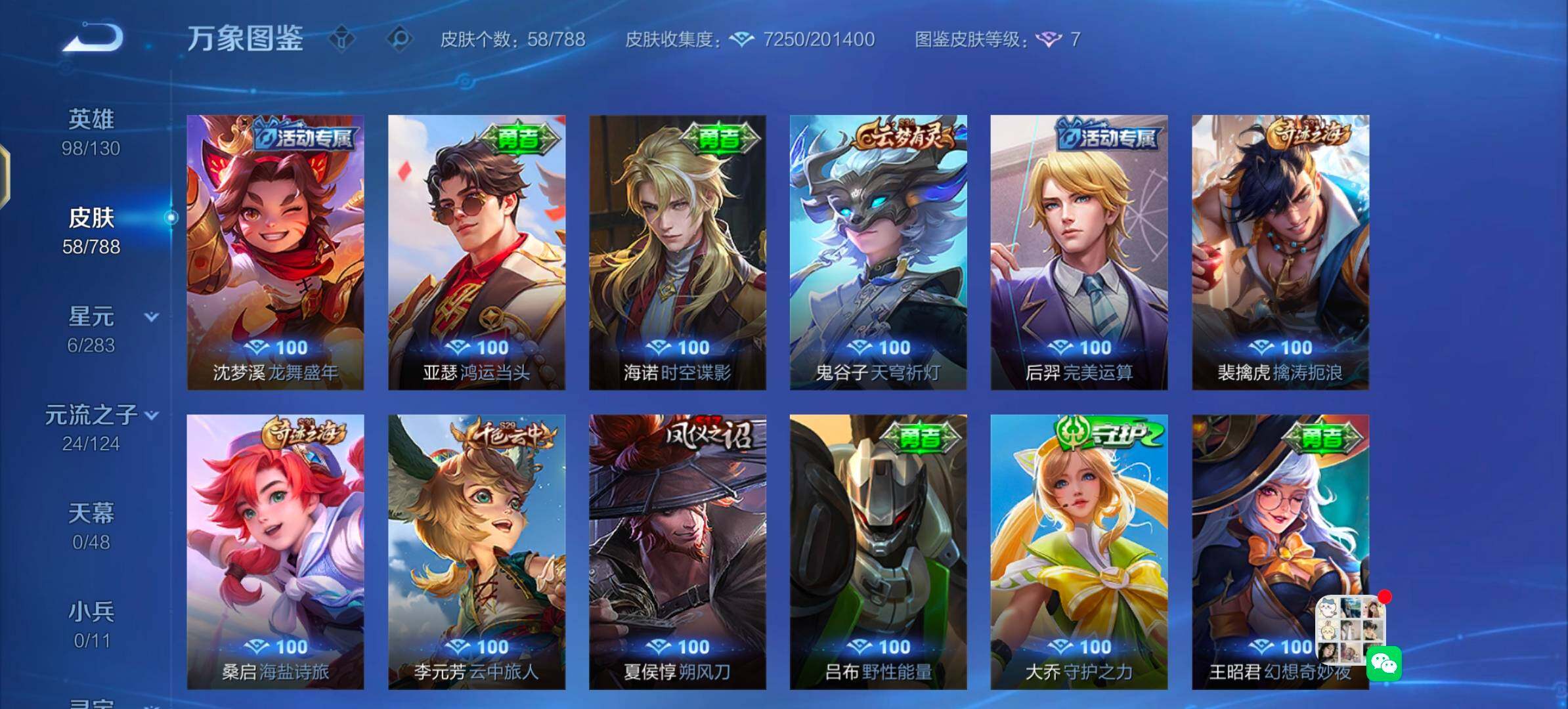 【其他皮肤】:阿古朵布丁狗之约,苏烈春野闲踪,沈梦溪鸭鸭历险记,钟馗虚灵犬护,戈娅玫蓝誓约,明世隐景韶洛都,少司缘灵卦秘语,钟无艳春野之旅,沈梦溪龙舞盛年,亚瑟鸿运当头,海诺时空谍影,鬼谷子天穹祈灯,后羿完美运算,裴擒虎擒涛扼浪,桑启海盐诗旅,李元芳云中旅人,夏侯惇朔风刀,吕布野性能量,大乔守护之力,王昭君幻想奇妙夜,狄仁杰阴阳师,刘备万事如意,张飞五福同心,亚瑟死亡骑士,典韦黄金武士,安琪拉玩偶对对碰,赵云忍炎影,达摩大发明家,阿轲爱心护理,项羽海滩派对,瑶森,李信灼热之刃,孙策海之征途,铠龙域领主,干将莫邪第七人偶,大乔伊势巫女,刘邦圣殿之光,李元芳特种部队,后羿精灵王,孙悟空西部大镖客,鲁班七号福禄兄弟