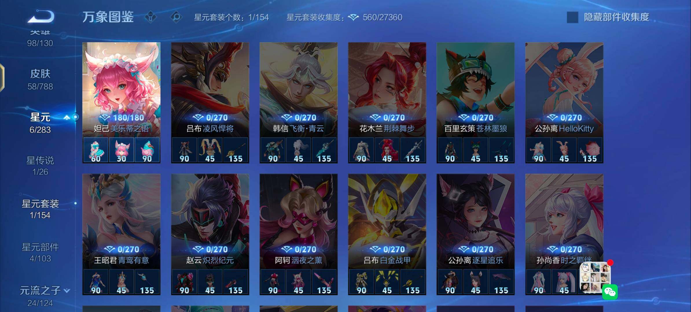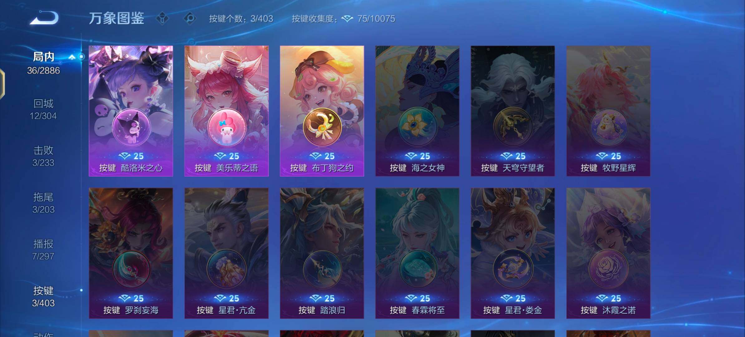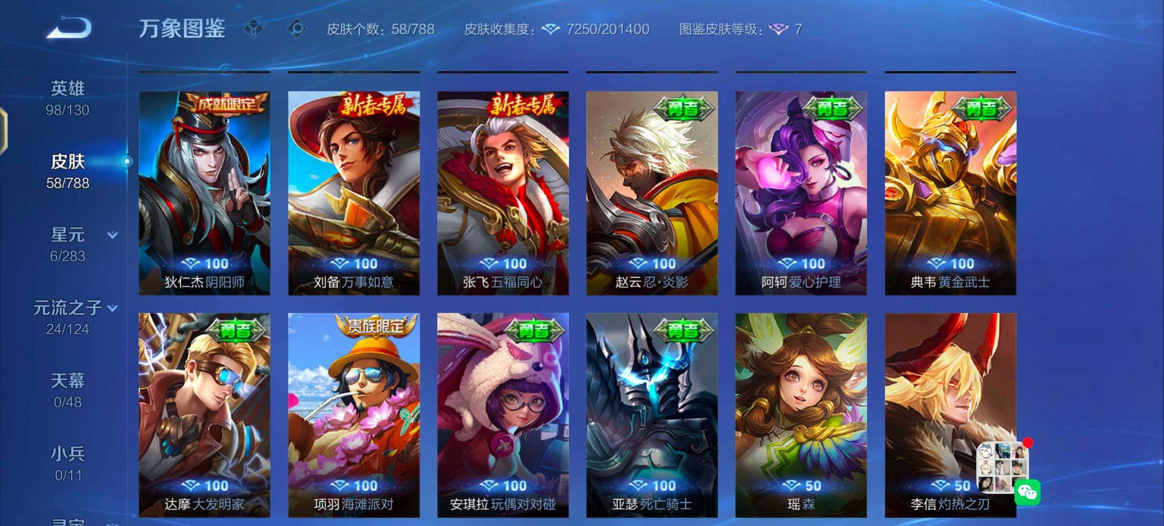 【其他皮肤】:阿古朵布丁狗之约,苏烈春野闲踪,沈梦溪鸭鸭历险记,钟馗虚灵犬护,戈娅玫蓝誓约,明世隐景韶洛都,少司缘灵卦秘语,钟无艳春野之旅,沈梦溪龙舞盛年,亚瑟鸿运当头,海诺时空谍影,鬼谷子天穹祈灯,后羿完美运算,裴擒虎擒涛扼浪,桑启海盐诗旅,李元芳云中旅人,夏侯惇朔风刀,吕布野性能量,大乔守护之力,王昭君幻想奇妙夜,狄仁杰阴阳师,刘备万事如意,张飞五福同心,亚瑟死亡骑士,典韦黄金武士,安琪拉玩偶对对碰,赵云忍炎影,达摩大发明家,阿轲爱心护理,项羽海滩派对,瑶森,李信灼热之刃,孙策海之征途,铠龙域领主,干将莫邪第七人偶,大乔伊势巫女,刘邦圣殿之光,李元芳特种部队,后羿精灵王,孙悟空西部大镖客,鲁班七号福禄兄弟