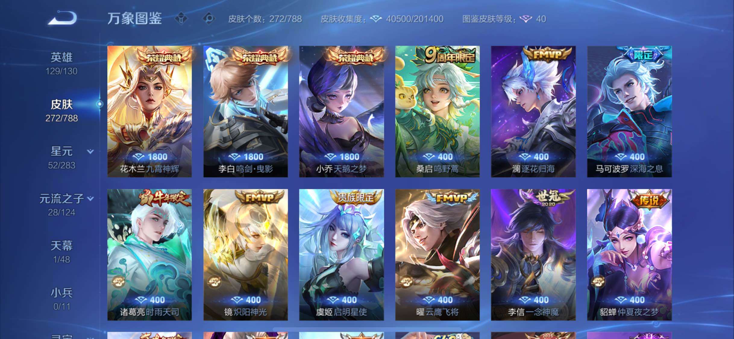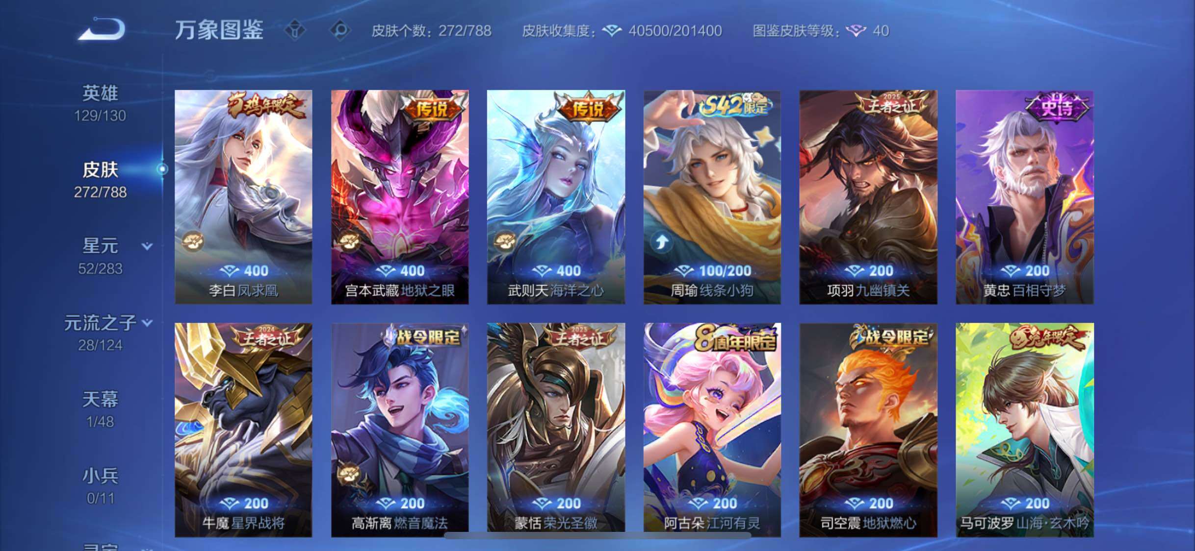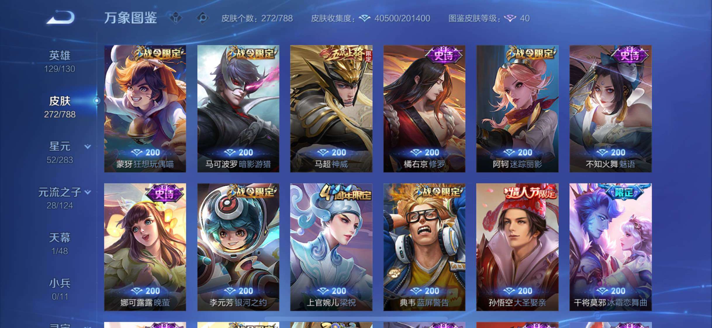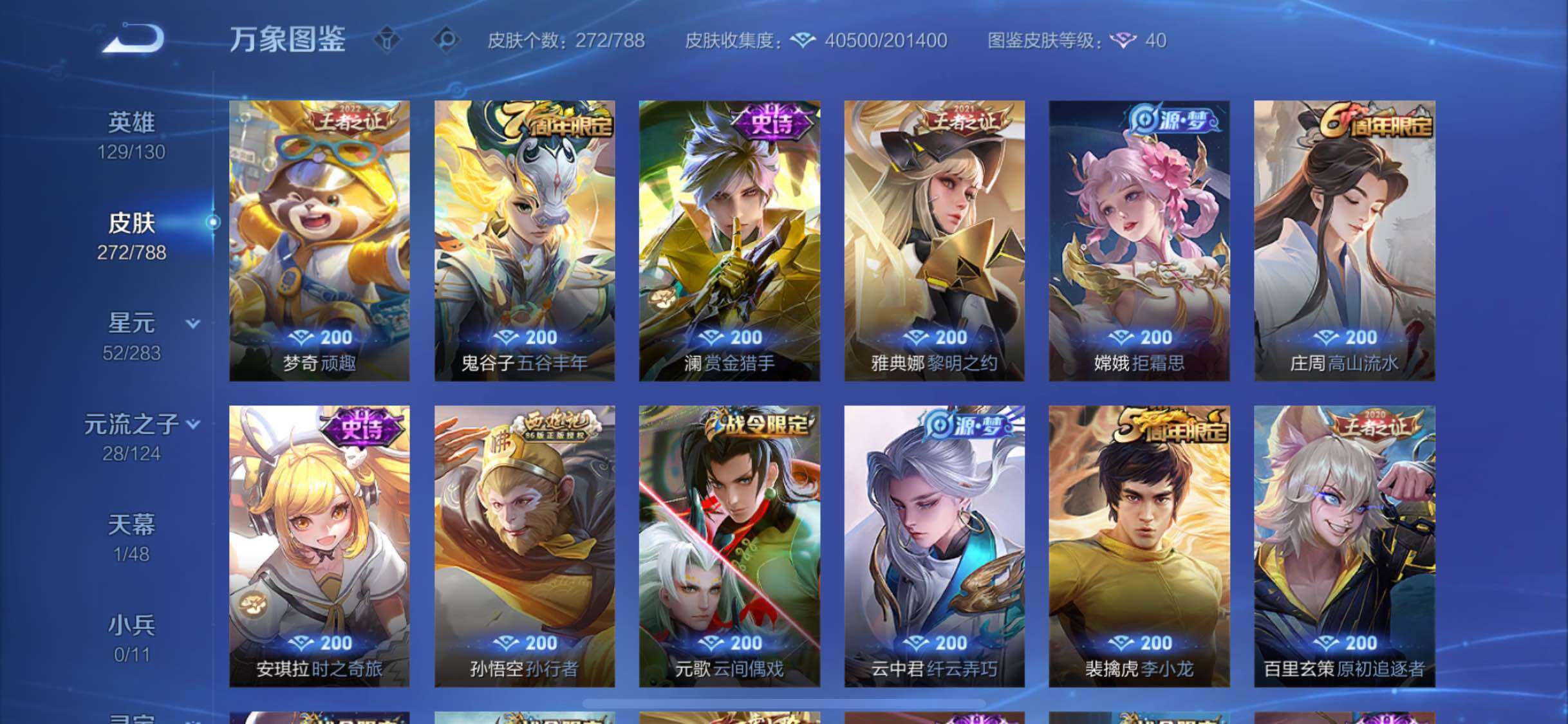 【史诗皮肤】:周瑜线条小狗,项羽九幽镇关,黄忠百相守梦,牛魔星界战将,蒙恬荣光圣徽,高渐离燃音魔法,妲己灵卜魔法,阿古朵江河有灵,司空震地狱燃心,马可波罗山海玄木吟,梦奇顽趣,鬼谷子五谷丰年,澜赏金猎手,雅典娜黎明之约,嫦娥拒霜思,庄周高山流水,孙悟空孙行者,安琪拉时之奇旅,元歌云间偶戏,云中君纤云弄巧,裴擒虎李小龙,百里玄策原初追逐者,蒙犽狂想玩偶喵,马可波罗暗影游猎,马超神威,橘右京修罗,阿轲迷踪丽影,不知火舞魅语,娜可露露晚萤,李元芳银河之约,上官婉儿梁祝,狄仁杰鹰眼统帅,典韦蓝屏警告,孙悟空大圣娶亲,干将莫邪冰霜恋舞曲,孙策猫狗日记,嬴政白昼王子,杨玉环遇见飞天,白起星夜王子,程咬金功夫厨神,李元芳逐浪之夏,刘禅天才门将,蔡文姬舞动绿茵,铠曙光守护者,百里守约特工魅影,后羿辉光之辰,安琪拉心灵骇客,雅典娜冰冠公主,亚瑟心灵战警,甄姬游园惊梦,诸葛亮黄金分割率,兰陵王暗隐猎兽者,小乔缤纷独角兽,夏侯惇乘风破浪,刘邦德古拉伯爵,花木兰水晶猎龙者,孙悟空至尊宝,关羽冰锋战神,韩信白龙吟,张飞乱世虎臣,李白千年之狐,曹操幽灵船长,刘禅绅士熊喵,吕布圣诞狂欢,墨子金属风暴,墨子龙骑士,妲己女仆咖啡,妲己魅力维加斯,嬴政优雅恋人,孙尚香水果甜心,孙尚香蔷薇恋人,宫本武藏鬼剑武藏,廉颇地狱岩魂,狄仁杰魔术师,王昭君偶像歌手,甄姬冰雪圆舞曲,貂蝉圣诞恋歌,赵云未来纪元,赵云皇家上将,阿轲暗夜猫娘,露娜紫霞仙子,鲁班七号电玩小子