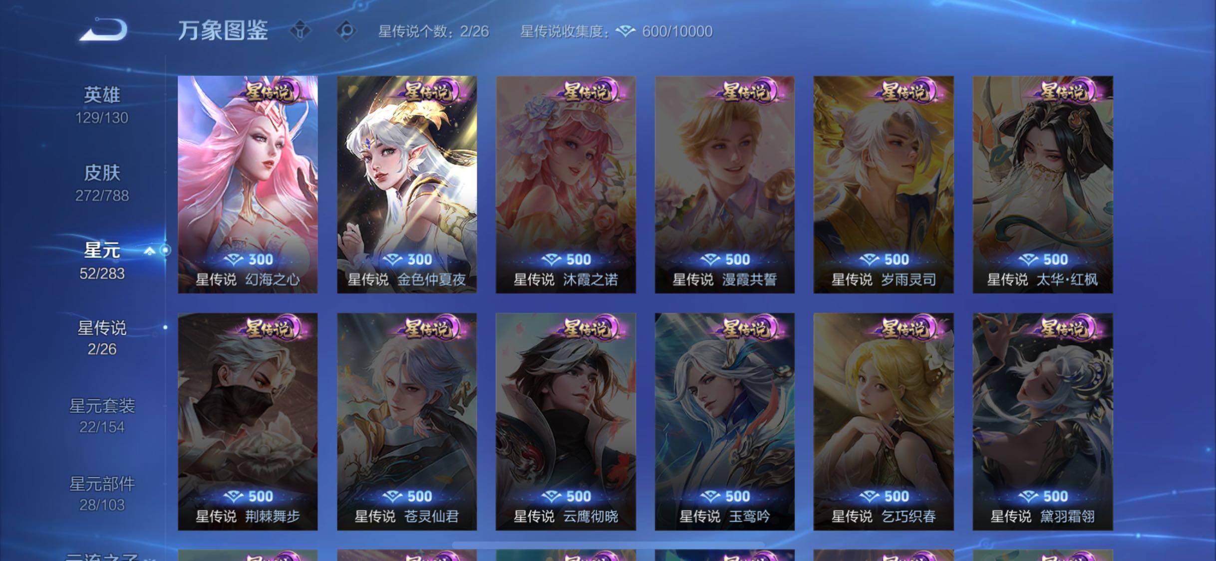 【传说皮肤】:桑启鸣野蒿,澜逐花归海,马可波罗深海之息,诸葛亮时雨天司,镜炽阳神光,虞姬启明星使,曜云鹰飞将,李信一念神魔,貂蝉仲夏夜之梦,李白凤求凰,宫本武藏地狱之眼,武则天海洋之心