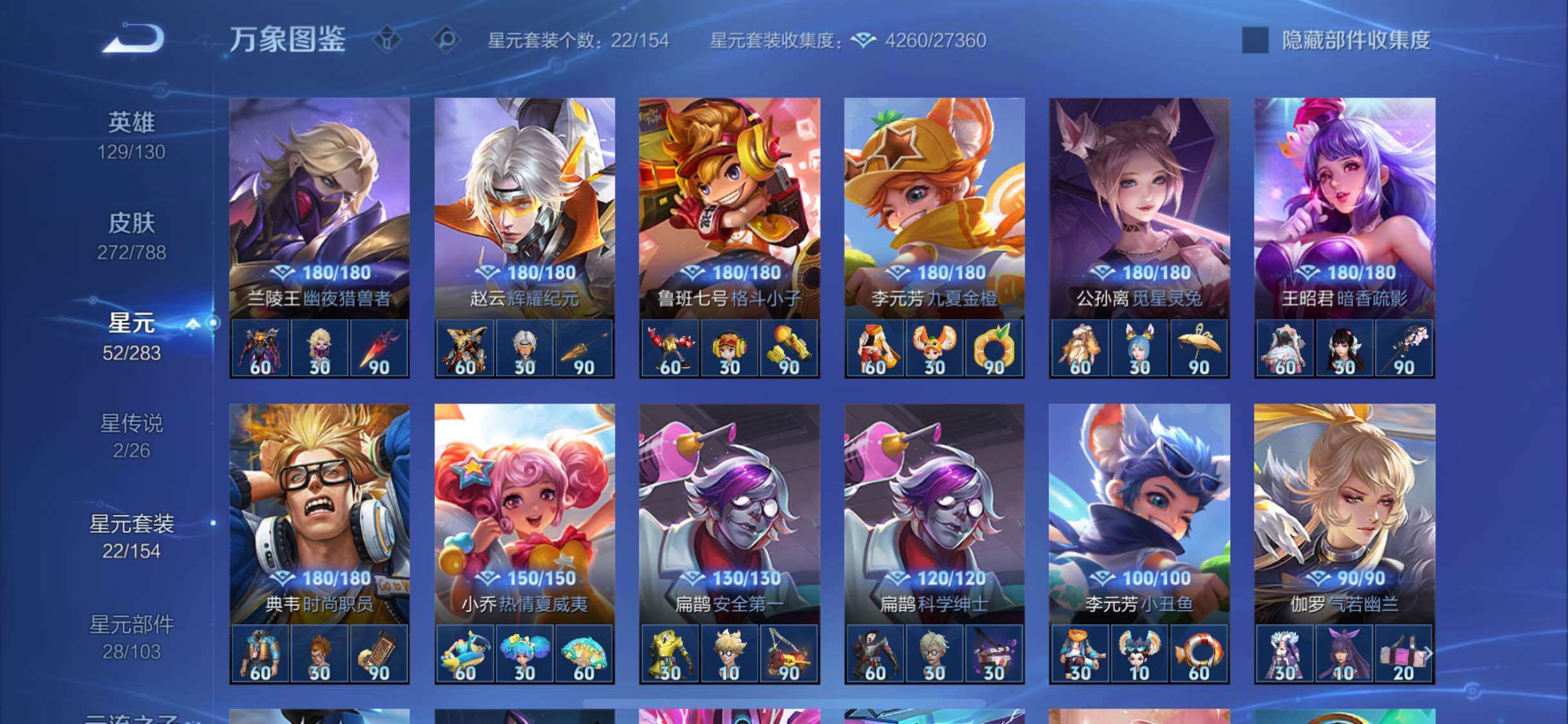 【赛季限定】:虞姬凯尔特女王,白起狰,太乙真人饕餮,曹操烛龙,芈月重明,典韦穷奇,狂铁御狮,米莱狄御霄,牛魔御旌,盾山御銮,夏侯惇朔风刀,弈星混沌棋,明世隐疑决卦,老夫子醍醐杖,鬼谷子原初探秘者,狄仁杰万华元夜,程咬金演武夺筹,钟馗驱傩正仪,苏烈千军破阵,达摩沙漠行僧,兰陵王金庭之子,沈梦溪大漠名商,李元芳云中旅人,桑启海盐诗旅,裴擒虎擒涛扼浪,鲁班大师探海日志,张良古海寻踪,鬼谷子天穹祈灯,刘邦剑破天穹,姜子牙天穹之誓,东皇太一噬灭天穹,太乙真人谧流熔炉,亚瑟荣光之誓,百里玄策原初追逐者,雅典娜黎明之约,梦奇顽趣,蒙恬荣光圣徽,牛魔星界战将,项羽九幽镇关