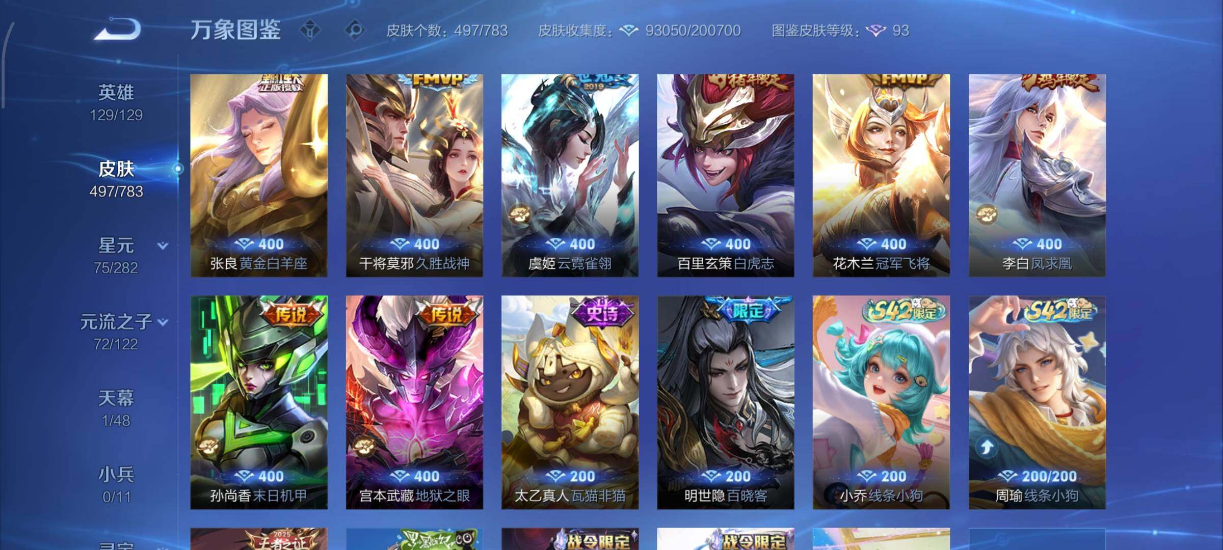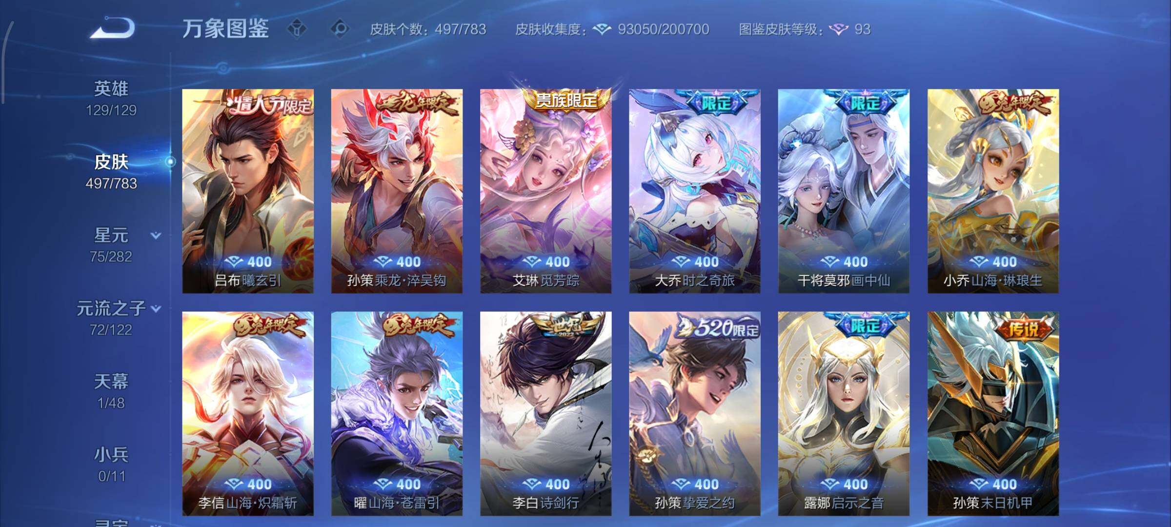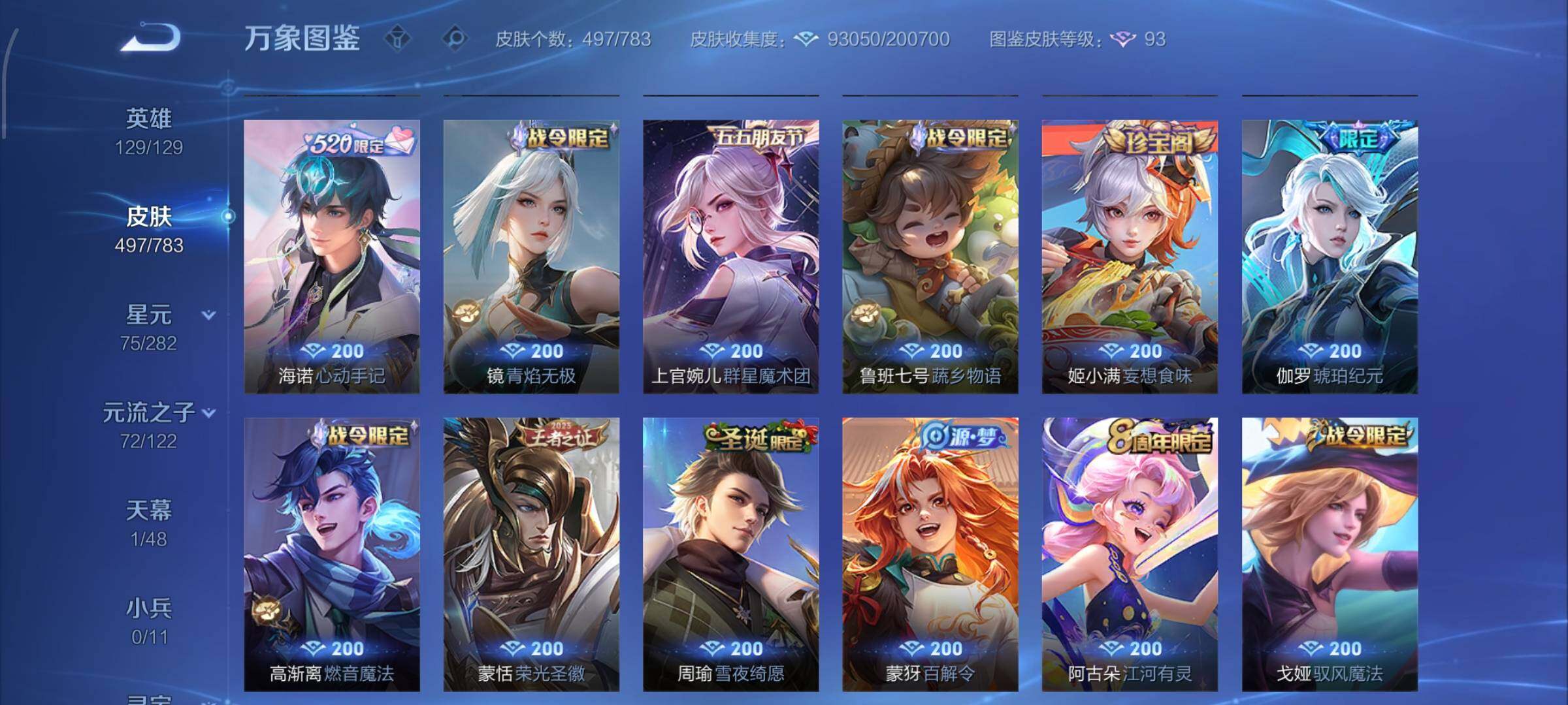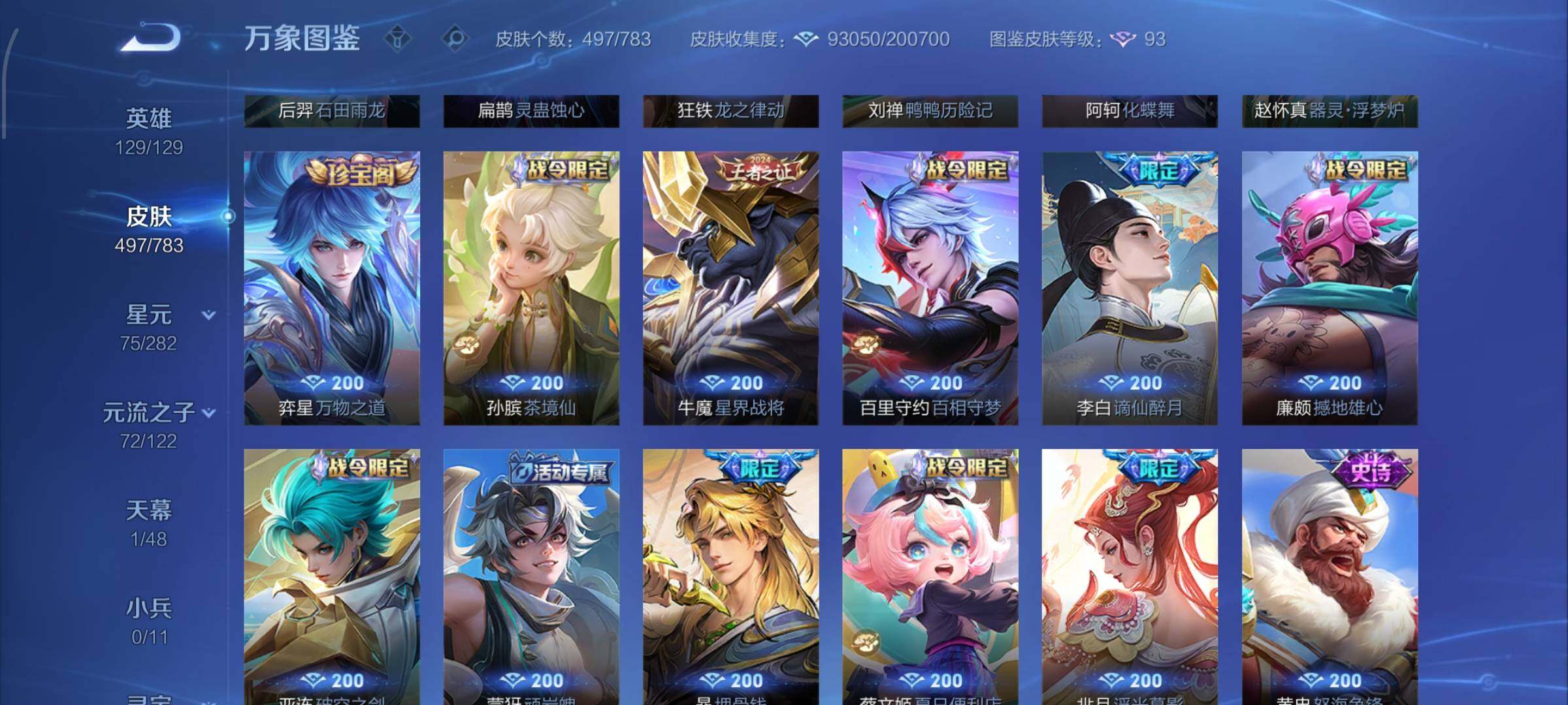 【战令限定】:吕布猎兽之王,典韦蓝屏警告,女娲朔望之晖,鲁班七号狮舞东方,钟馗神迹守卫,李元芳银河之约,沈梦溪星空之诺,阿轲迷踪丽影,马可波罗暗影游猎,猪八戒西部大镖客,蒙犽狂想玩偶喵,雅典娜单词大作战,元歌云间偶戏,亚瑟潮玩骑士王,米莱狄胡桃异想国,达摩星际陆战队,老夫子航海奇遇记,墨子神迹守卫,干将莫邪真爱魔法,后羿圣弓游侠,黄忠火炮绅士,芈月幻夜卜梦,狂铁电玩高手,王昭君午后时光,钟无艳超时空战士,甄姬落雪兰心,暃星界游侠,嫦娥暖冬兔眠,扁鹊奇幻香踪,杨戬潮玩骑兵,戈娅驭风魔法,西施玲珑珍味,高渐离燃音魔法,妲己灵卜魔法,鲁班七号蔬乡物语,李元芳蔬乡物语,镜青焰无极,项羽苍威无极,蔡文姬夏日便利店,虞姬夏日便利店,亚连破空之剑,廉颇撼地雄心,孙悟空神迹守卫,百里守约百相守梦,老夫子百相守梦,孙膑茶境仙,马超访茗客,刘禅鸭鸭历险记,沈梦溪鸭鸭历险记,兰陵王傩神司,莱西奥光弋星穹,明世隐往忆晖光,周瑜线条小狗,小乔线条小狗