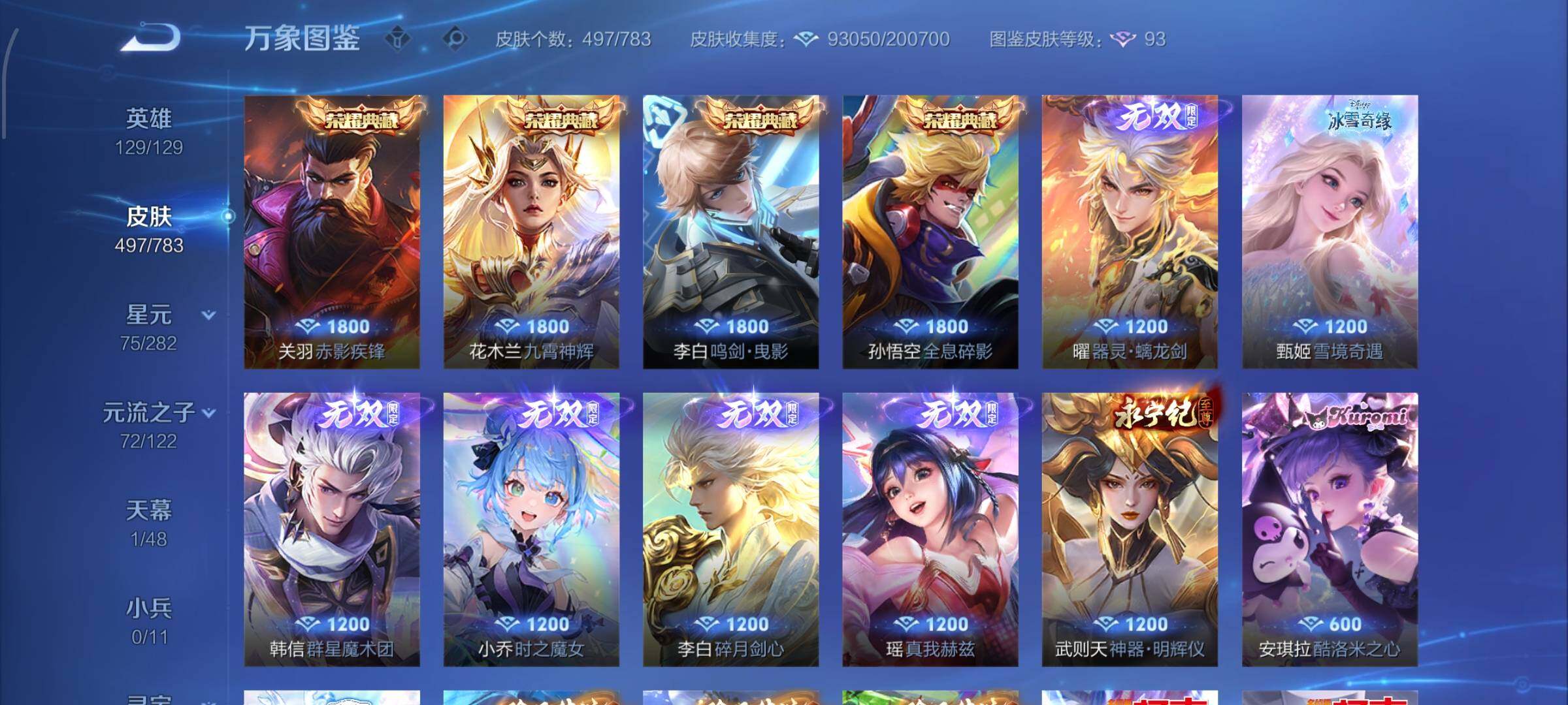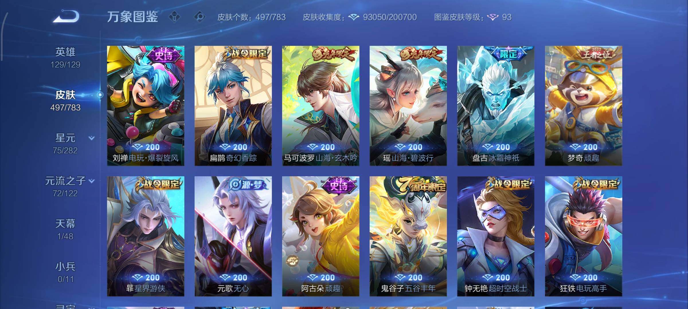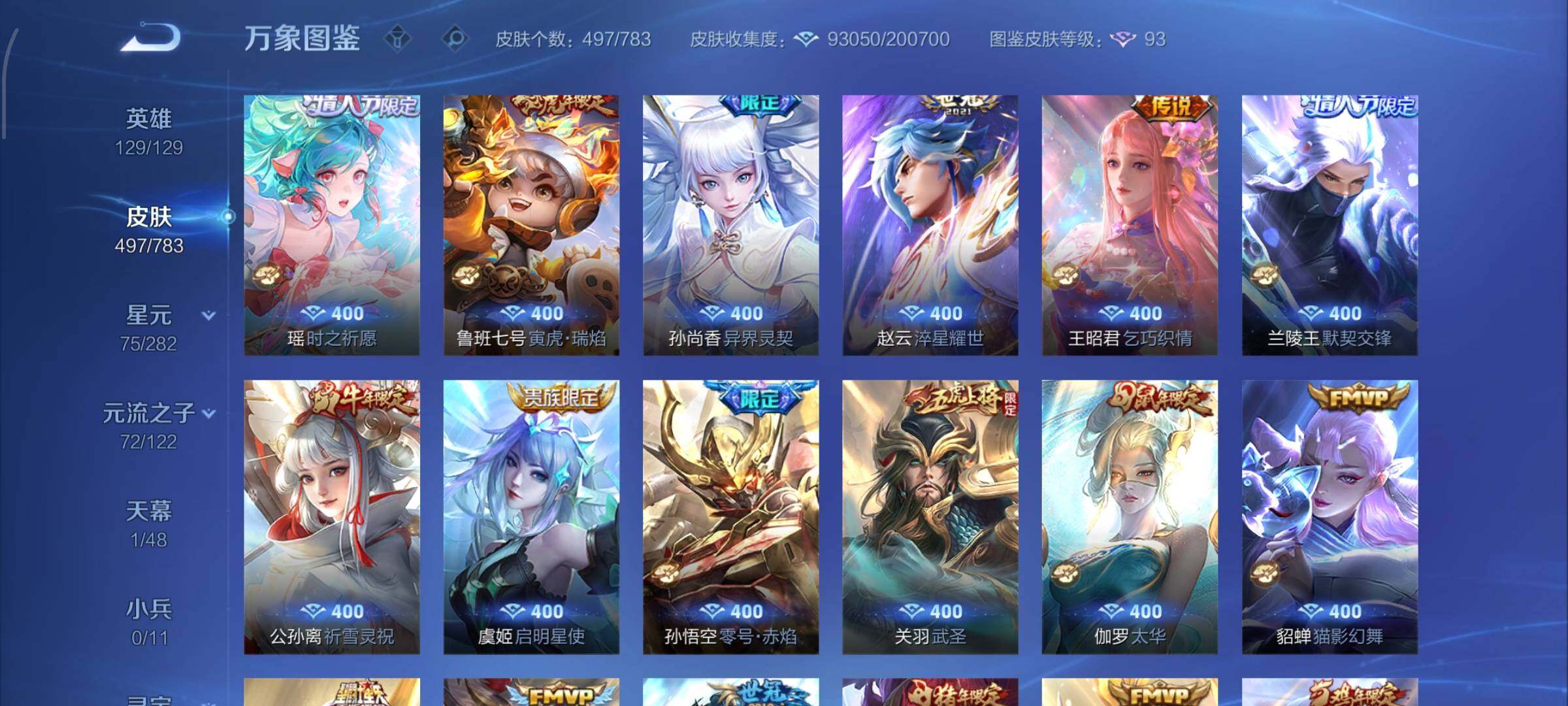 【战令限定】:吕布猎兽之王,典韦蓝屏警告,女娲朔望之晖,鲁班七号狮舞东方,钟馗神迹守卫,李元芳银河之约,沈梦溪星空之诺,阿轲迷踪丽影,马可波罗暗影游猎,猪八戒西部大镖客,蒙犽狂想玩偶喵,雅典娜单词大作战,元歌云间偶戏,亚瑟潮玩骑士王,米莱狄胡桃异想国,达摩星际陆战队,老夫子航海奇遇记,墨子神迹守卫,干将莫邪真爱魔法,后羿圣弓游侠,黄忠火炮绅士,芈月幻夜卜梦,狂铁电玩高手,王昭君午后时光,钟无艳超时空战士,甄姬落雪兰心,暃星界游侠,嫦娥暖冬兔眠,扁鹊奇幻香踪,杨戬潮玩骑兵,戈娅驭风魔法,西施玲珑珍味,高渐离燃音魔法,妲己灵卜魔法,鲁班七号蔬乡物语,李元芳蔬乡物语,镜青焰无极,项羽苍威无极,蔡文姬夏日便利店,虞姬夏日便利店,亚连破空之剑,廉颇撼地雄心,孙悟空神迹守卫,百里守约百相守梦,老夫子百相守梦,孙膑茶境仙,马超访茗客,刘禅鸭鸭历险记,沈梦溪鸭鸭历险记,兰陵王傩神司,莱西奥光弋星穹,明世隐往忆晖光,周瑜线条小狗,小乔线条小狗