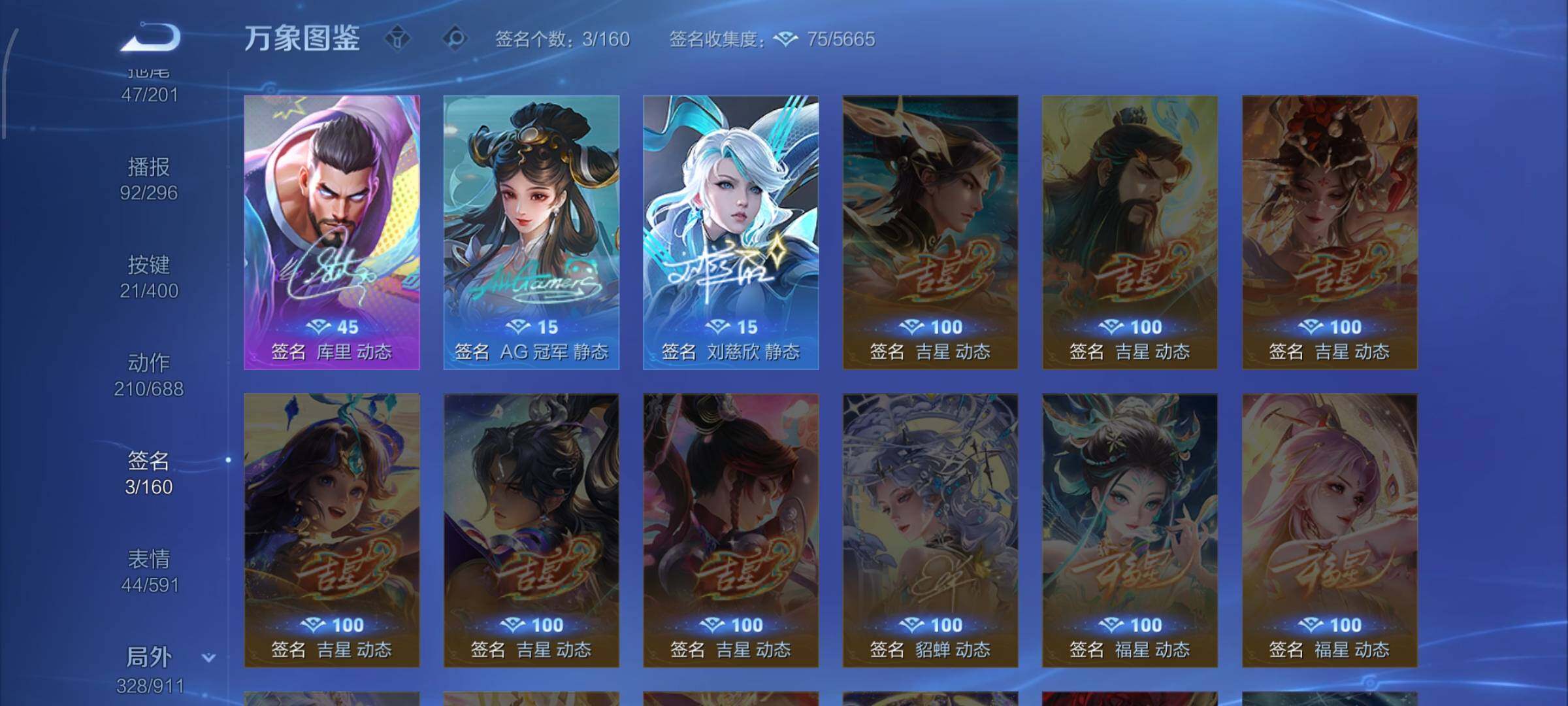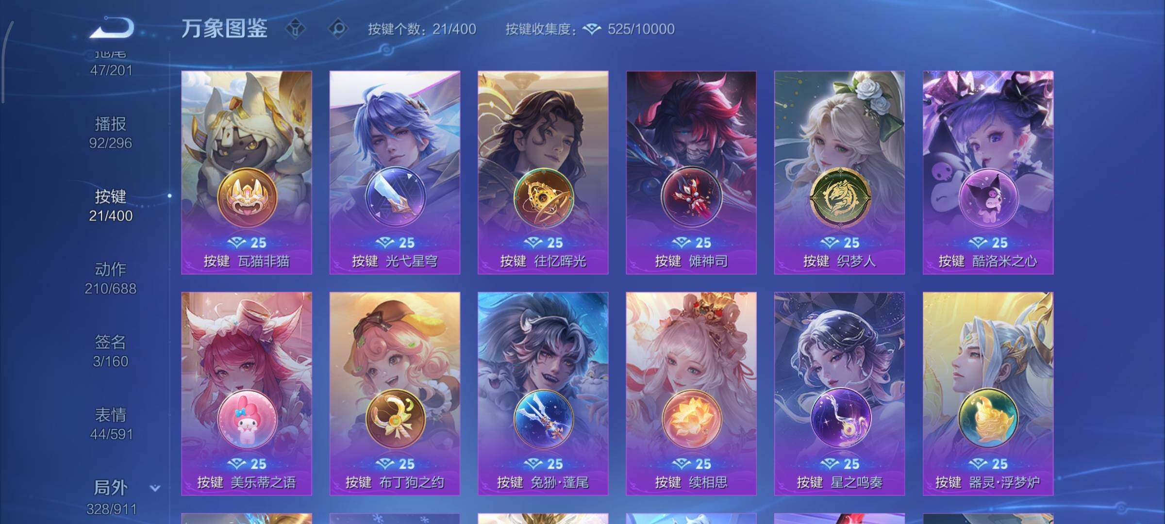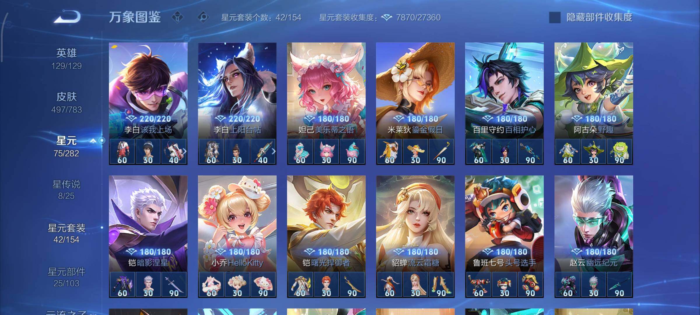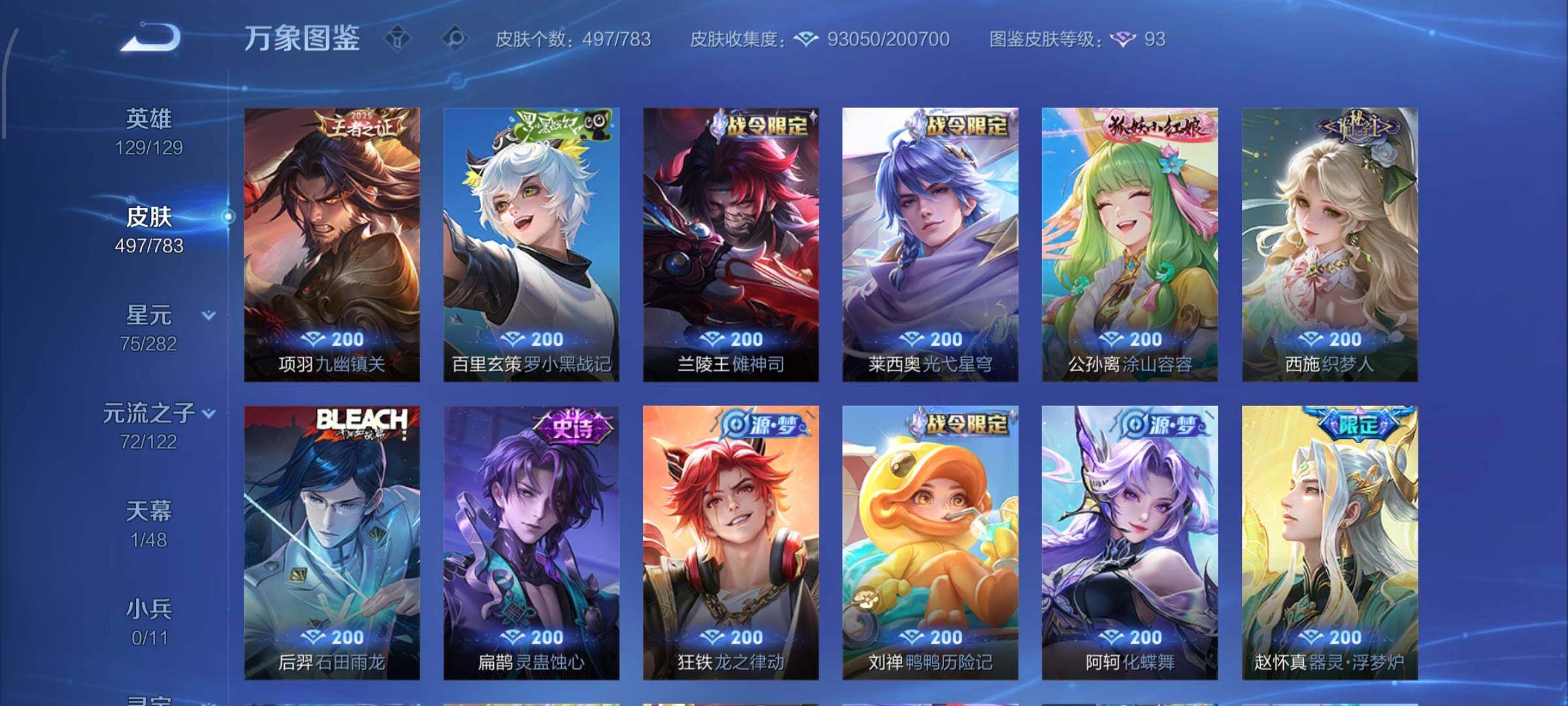 【战令限定】:吕布猎兽之王,典韦蓝屏警告,女娲朔望之晖,鲁班七号狮舞东方,钟馗神迹守卫,李元芳银河之约,沈梦溪星空之诺,阿轲迷踪丽影,马可波罗暗影游猎,猪八戒西部大镖客,蒙犽狂想玩偶喵,雅典娜单词大作战,元歌云间偶戏,亚瑟潮玩骑士王,米莱狄胡桃异想国,达摩星际陆战队,老夫子航海奇遇记,墨子神迹守卫,干将莫邪真爱魔法,后羿圣弓游侠,黄忠火炮绅士,芈月幻夜卜梦,狂铁电玩高手,王昭君午后时光,钟无艳超时空战士,甄姬落雪兰心,暃星界游侠,嫦娥暖冬兔眠,扁鹊奇幻香踪,杨戬潮玩骑兵,戈娅驭风魔法,西施玲珑珍味,高渐离燃音魔法,妲己灵卜魔法,鲁班七号蔬乡物语,李元芳蔬乡物语,镜青焰无极,项羽苍威无极,蔡文姬夏日便利店,虞姬夏日便利店,亚连破空之剑,廉颇撼地雄心,孙悟空神迹守卫,百里守约百相守梦,老夫子百相守梦,孙膑茶境仙,马超访茗客,刘禅鸭鸭历险记,沈梦溪鸭鸭历险记,兰陵王傩神司,莱西奥光弋星穹,明世隐往忆晖光,周瑜线条小狗,小乔线条小狗