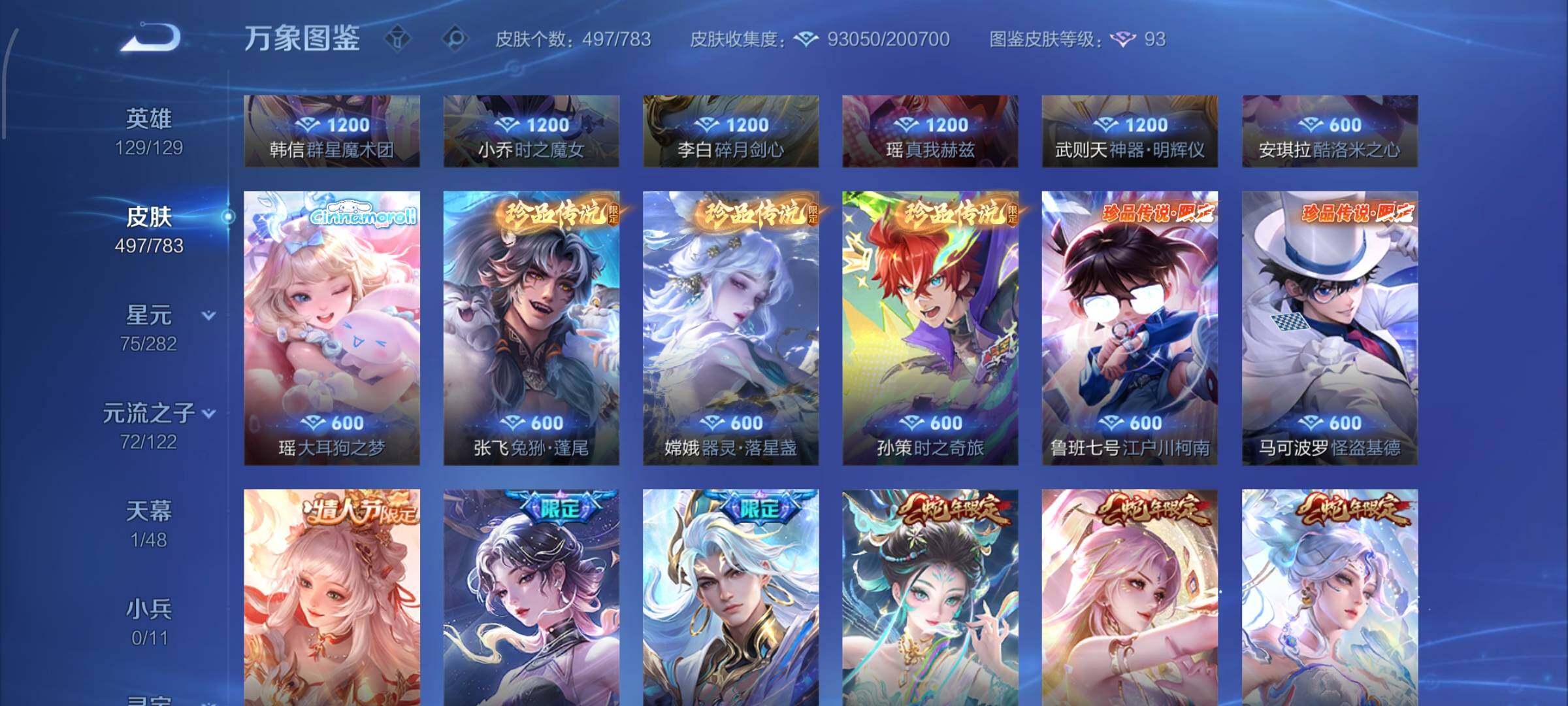 【珍品传说】:安琪拉酷洛米之心,瑶大耳狗之梦,张飞兔狲蓬尾,嫦娥器灵落星盏,孙策时之奇旅,鲁班七号江户川柯南,马可波罗怪盗基德
