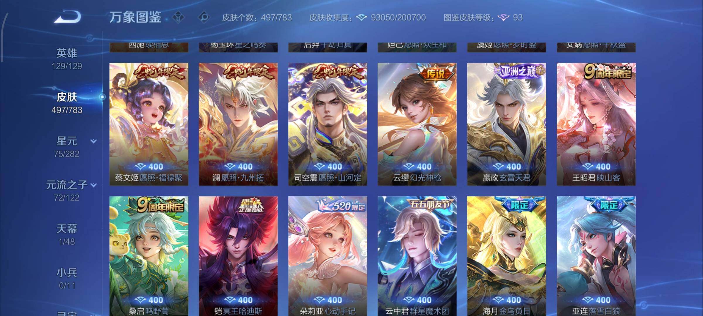 【限定皮肤】:铠冥王哈迪斯,暃埋骨钱,蒙犽顽岩魄,蔡文姬夏日便利店,大乔绒语心约,虞姬夏日便利店,姜子牙天穹之誓,杨戬破阵退雄兵,李白谪仙醉月,狄仁杰阴阳师,小乔山海琳琅生,赵云皇家上将,墨子神迹守卫,妲己热情桑巴,嬴政优雅恋人,孙尚香异界灵契,鲁班七号狮舞东方,鲁班七号寅虎瑞焰,庄周云端筑梦师,庄周高山流水,阿轲迷踪丽影,钟无艳超时空战士,扁鹊奇幻香踪,芈月幻夜卜梦,吕布猎兽之王,周瑜真爱至上,元歌云间偶戏,元歌无心,夏侯惇朔风刀,甄姬女儿国国王,甄姬游园惊梦,甄姬落雪兰心,典韦穷奇,典韦蓝屏警告,马可波罗暗影游猎,马可波罗山海玄木吟,狄仁杰魔术师,狄仁杰万华元夜,达摩星际陆战队,达摩沙漠行僧,项羽海滩派对,老夫子醍醐杖,老夫子航海奇遇记,关羽武圣,安琪拉魔法小厨娘,程咬金演武夺筹,露娜启示之音,韩信傲雪梅枪,王昭君午后时光,兰陵王默契交锋,兰陵王金庭之子,亚瑟潮玩骑士王,孙悟空大圣娶亲,孙悟空零号赤焰,孙悟空孙行者,牛魔御旌,后羿辉光之辰,后羿圣弓游侠,李元芳银河之约,李元芳云中旅人,虞姬启明星使,钟馗神迹守卫,钟馗驱傩正仪,杨玉环遇见飞天,杨戬潮玩骑兵,女娲朔望之晖,干将莫邪真爱魔法,干将莫邪画中仙,雅典娜单词大作战,雅典娜黎明之约,蔡文姬繁星吟游,鬼谷子原初探秘者,鬼谷子五谷丰年,大乔时之奇旅,黄忠烈魂,黄忠火炮绅士,苏烈千军破阵,百里玄策白虎志,百里玄策原初追逐者,百里守约朱雀志,弈星混沌棋,梦奇顽趣,公孙离祈雪灵祝,沈梦溪星空之诺,沈梦溪大漠名商,明世隐疑决卦,裴擒虎天狼狩猎者,裴擒虎李小龙,裴擒虎擒涛扼浪,狂铁御狮,狂铁电玩高手,米莱狄御霄,米莱狄胡桃异想国,瑶时之祈愿,瑶山海碧波行,李信山海炽霜斩,伽罗太华,盾山御銮,孙策挚爱之约,猪八戒西部大镖客,猪八戒猪悟能,上官婉儿梁祝,嫦娥拒霜思,嫦娥暖冬兔眠,曜山海苍雷引,西施玲珑珍味,蒙犽狂想玩偶喵,鲁班大师探海日志,盘古冰霜神祇,桑启海盐诗旅,暃星界游侠,戈娅驭风魔法,艾琳女武神,阿古朵江河有灵,张良古海寻踪,蒙犽百解令,艾琳觅芳踪,蒙恬荣光圣徽,高渐离燃音魔法,妲己灵卜魔法,鬼谷子天穹祈灯,李白碎月剑心,伽罗琥珀纪元,姬小满妄想食味,小乔时之魔女,孙策乘龙淬吴钩,吕布曦玄引,亚连落雪白狼,沈梦溪龙舞盛年,鲁班七号蔬乡物语,李元芳蔬乡物语,海月金乌负日,刘邦剑破天穹,上官婉儿群星魔术团,程咬金群星魔术团,韩信群星魔术团,云中君群星魔术团,镜青焰无极,项羽苍威无极,朵莉亚心动手记,海诺心动手记,刘备异域游侠,芈月浮光幕影,周瑜熔金海岸