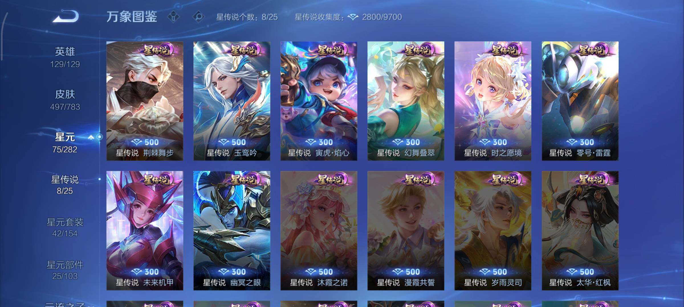【星元皮肤】:兰陵王荆棘舞步,李白玉鸾吟,鲁班七号寅虎焰心,貂蝉幻舞叠翠,瑶时之愿境,孙悟空零号雷霆,孙尚香未来机甲,宫本武藏幽冥之眼