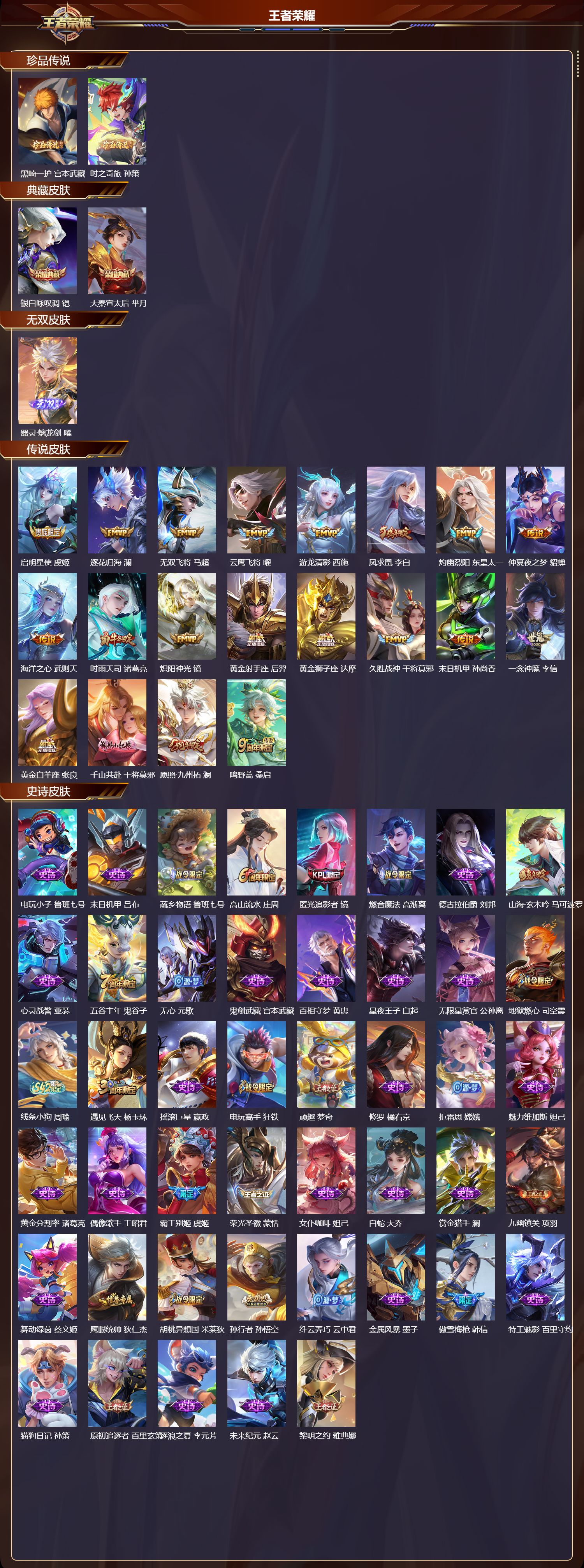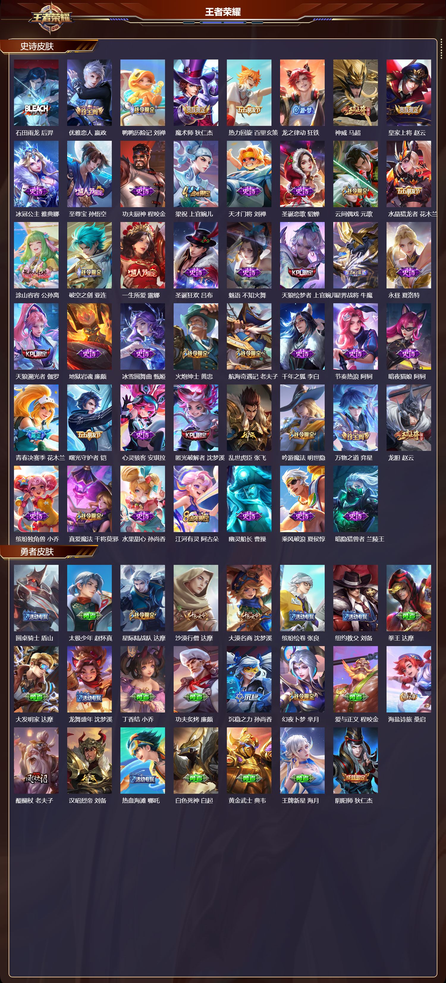 【92,史诗皮肤】电玩小子,鲁班七号,末日机甲,吕布,蔬乡物语,鲁班七号,高山流水,庄周,匿光追影者,镜,燃音魔法,高渐离,德古拉伯爵,刘邦,山海·玄木吟,马可波罗,心灵战警,亚瑟,五谷丰年,鬼谷子,无心,元歌,鬼剑武藏,宫本武藏,百相守梦,黄忠,星夜王子,白起,无限星赏官,公孙离,地狱燃心,司空震,线条小狗,周瑜,遇见飞天,杨玉环,摇滚巨星,嬴政,电玩高手,狂铁,顽趣,梦奇,修罗,橘右京,拒霜思,嫦娥,魅力维加斯,妲己,黄金分割率,诸葛亮,偶像歌手,王昭君,霸王别姬,虞姬,荣光圣徽,蒙恬,女仆咖啡,妲己,白蛇,大乔,赏金猎手,澜,九幽镇关,项羽,舞动绿茵,蔡文姬,鹰眼统帅,狄仁杰,胡桃异想国,米莱狄,孙行者,孙悟空,纤云弄巧,云中君,金属风暴,墨子,傲雪梅枪,韩信,特工魅影,百里守约,猫狗日记,孙策,原初追逐者,百里玄策,逐浪之夏,李元芳,未来纪元,赵云,黎明之约,雅典娜,石田雨龙,后羿,优雅恋人,嬴政,鸭鸭历险记,刘禅,魔术师,狄仁杰,热力回旋,百里玄策,龙之律动,狂铁,神威,马超,皇家上将,赵云,冰冠公主,雅典娜,至尊宝,孙悟空,功夫厨神,程咬金,梁祝,上官婉儿,天才门将,刘禅,圣诞恋歌,貂蝉,云间偶戏,元歌,水晶猎龙者,花木兰,涂山容容,公孙离,破空之剑,亚连,一生所爱,露娜,圣诞狂欢,吕布,魅语,不知火舞,天狼绘梦者,上官婉儿,星界战将,牛魔,永昼,夏洛特,天狼溯光者,伽罗,地狱岩魂,廉颇,冰雪圆舞曲,甄姬,火炮绅士,黄忠,航海奇遇记,老夫子,千年之狐,李白,节奏热浪,阿轲,暗夜猫娘,阿轲,青春决赛季,花木兰,曙光守护者,铠,心灵骇客,安琪拉,匿光破解者,沈梦溪,乱世虎臣,张飞,吟游魔法,明世隐,万物之道,弈星,龙胆,赵云,缤纷独角兽,小乔,真爱魔法,干将莫邪,水果甜心,孙尚香,江河有灵,阿古朵,幽灵船长,曹操,乘风破浪,夏侯惇,暗隐猎兽者,兰陵王,