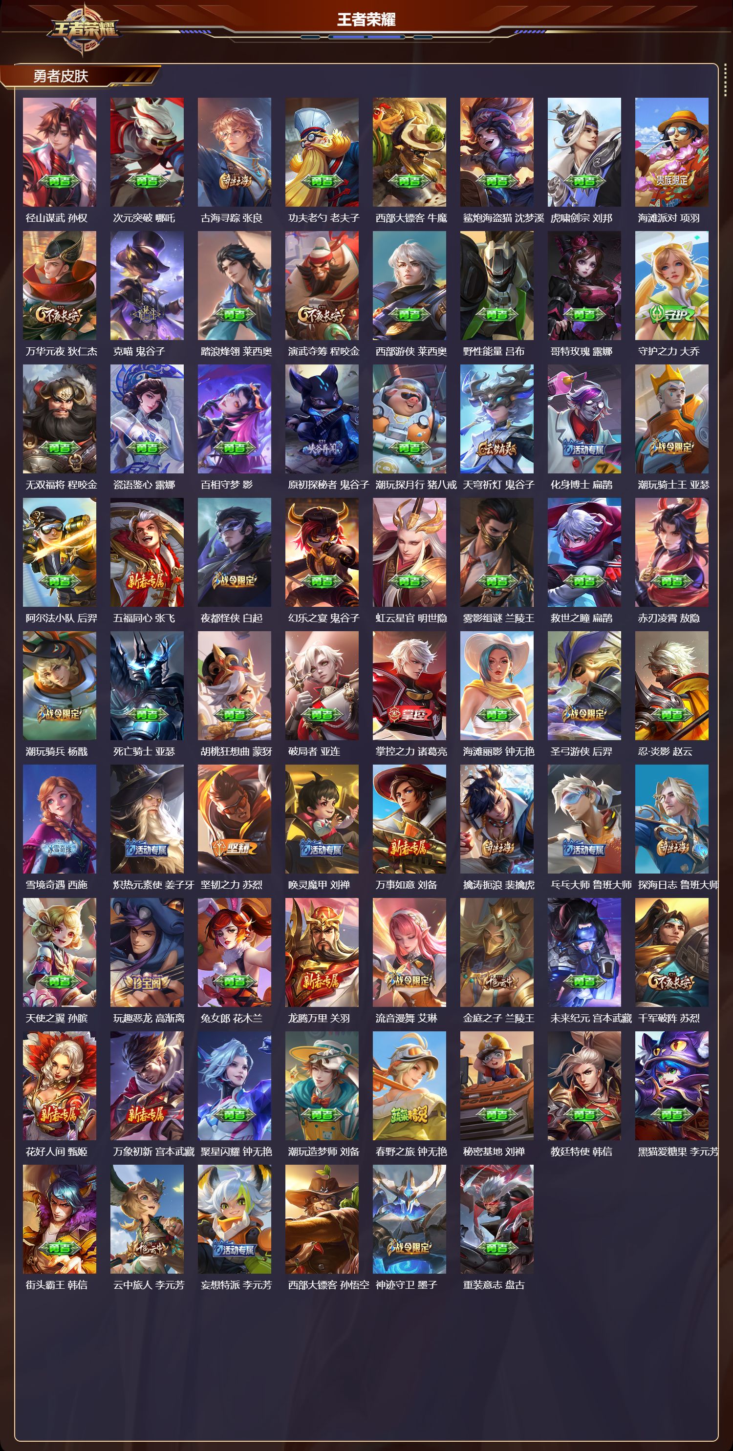 【120,勇者皮肤】圆桌骑士,盾山,太极少年,赵怀真,星际陆战队,达摩,沙漠行僧,达摩,大漠名商,沈梦溪,缤纷绘卷,张良,纽约教父,刘备,拳王,达摩,大发明家,达摩,龙舞盛年,沈梦溪,丁香结,小乔,功夫炙烤,廉颇,沉稳之力,孙尚香,幻夜卜梦,芈月,爱与正义,程咬金,海盐诗旅,桑启,醍醐杖,老夫子,汉昭烈帝,刘备,热血海滩,哪吒,白色死神,白起,黄金武士,典韦,王牌新星,海月,阴阳师,狄仁杰,径山谋武,孙权,次元突破,哪吒,古海寻踪,张良,功夫老勺,老夫子,西部大镖客,牛魔,鲨炮海盗猫,沈梦溪,虎啸剑宗,刘邦,海滩派对,项羽,万华元夜,狄仁杰,克喵,鬼谷子,踏浪烽翎,莱西奥,演武夺筹,程咬金,西部游侠,莱西奥,野性能量,吕布,哥特玫瑰,露娜,守护之力,大乔,无双福将,程咬金,瓷语鉴心,露娜,百相守梦,影,原初探秘者,鬼谷子,潮玩探月行,猪八戒,天穹祈灯,鬼谷子,化身博士,扁鹊,潮玩骑士王,亚瑟,阿尔法小队,后羿,五福同心,张飞,夜都怪侠,白起,幻乐之宴,鬼谷子,虹云星官,明世隐,雾影缉谜,兰陵王,救世之瞳,扁鹊,赤刃凌霄,敖隐,潮玩骑兵,杨戬,死亡骑士,亚瑟,胡桃狂想曲,蒙犽,破局者,亚连,掌控之力,诸葛亮,海滩丽影,钟无艳,圣弓游侠,后羿,忍·炎影,赵云,雪境奇遇,西施,炽热元素使,姜子牙,坚韧之力,苏烈,唤灵魔甲,刘禅,万事如意,刘备,擒涛扼浪,裴擒虎,乓乓大师,鲁班大师,探海日志,鲁班大师,天使之翼,孙膑,玩趣恶龙,高渐离,兔女郎,花木兰,龙腾万里,关羽,流音漫舞,艾琳,金庭之子,兰陵王,未来纪元,宫本武藏,千军破阵,苏烈,花好人间,甄姬,万象初新,宫本武藏,聚星闪耀,钟无艳,潮玩造梦师,刘备,春野之旅,钟无艳,秘密基地,刘禅,教廷特使,韩信,黑猫爱糖果,李元芳,街头霸王,韩信,云中旅人,李元芳,妄想特派,李元芳,西部大镖客,孙悟空,神迹守卫,墨子,重装意志,盘古,蔬乡物语,李元芳,灵卜魔法,妲己,蔚蓝守将,蒙恬,契约魔法,米莱狄,布丁狗之约,阿古朵,午后时光,王昭君,幻想奇妙夜,王昭君,驱傩正仪,钟馗,潮玩士官长,雅典娜,鸭鸭历险记,沈梦溪,死霸装,白起,特工战影,狂铁,虚灵犬护,钟馗,劲辣红锅,太乙真人,神迹守卫,孙悟空,剑破天穹,刘邦,铁骨偃魂,典韦,苍林狼骑,苍,天穹之誓,姜子牙,星梦巡礼,姜子牙,群星魔术团,程咬金,逆浪荇歌,甄姬,线条小狗,周瑜,噬灭天穹,东皇太一,灵卦秘语,少司缘,敬我三分,盘古,爆裂喵拳,达摩,
