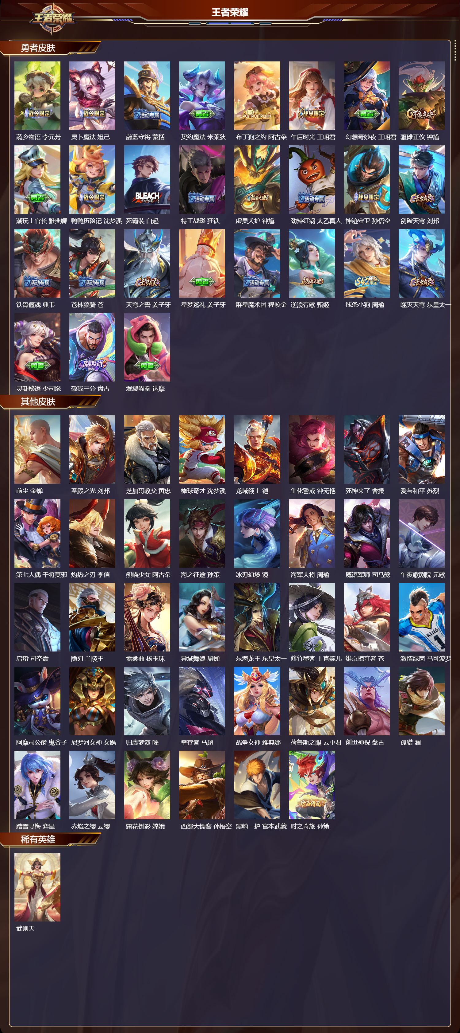 【38,其他皮肤】前尘,金蝉,圣殿之光,刘邦,芝加哥教父,黄忠,棒球奇才,沈梦溪,龙域领主,铠,生化警戒,钟无艳,死神来了,曹操,爱与和平,苏烈,第七人偶,干将莫邪,灼热之刃,李信,熊喵少女,阿古朵,海之征途,孙策,冰刃幻境,镜,海军大将,周瑜,魇语军师,司马懿,午夜歌剧院,元歌,启蛰,司空震,隐刃,兰陵王,霓裳曲,杨玉环,异域舞娘,貂蝉,东海龙王,东皇太一,修竹墨客,上官婉儿,维京掠夺者,苍,激情绿茵,马可波罗,阿摩司公爵,鬼谷子,尼罗河女神,女娲,归虚梦演,曜,幸存者,马超,战争女神,雅典娜,荷鲁斯之眼,云中君,创世神祝,盘古,孤猎,澜,踏雪寻梅,弈星,赤焰之缨,云缨,露花倒影,嫦娥,西部大镖客,孙悟空,黑崎一护,宫本武藏,时之奇旅,孙策,