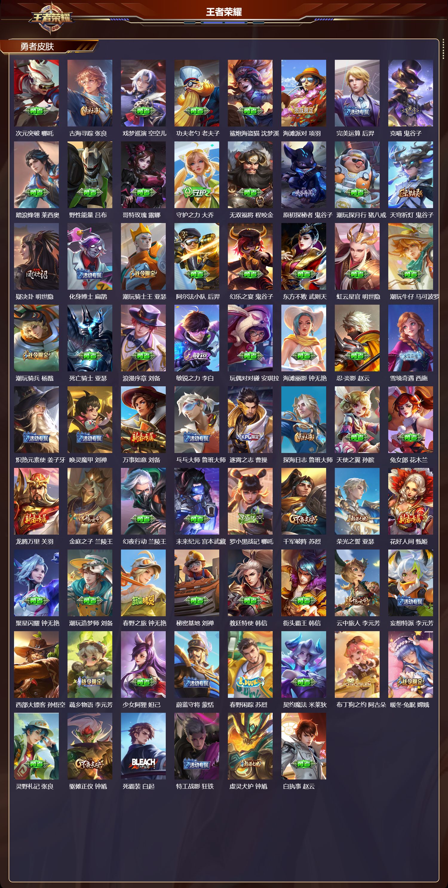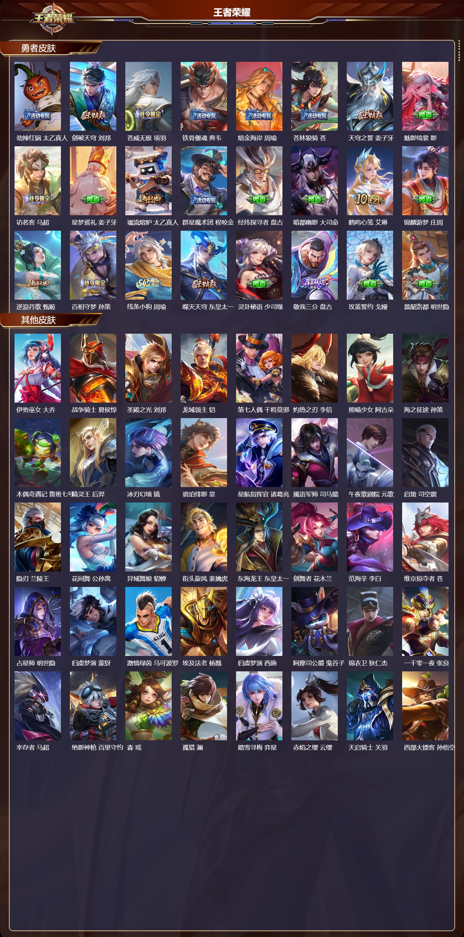 【111,勇者皮肤】圆桌骑士,盾山,沙漠行僧,达摩,大漠名商,沈梦溪,缤纷绘卷,张良,纽约教父,刘备,拳王,达摩,大发明家,达摩,龙舞盛年,沈梦溪,功夫炙烤,廉颇,沉稳之力,孙尚香,海盐诗旅,桑启,幻泉雾影,海月,醍醐杖,老夫子,汉昭烈帝,刘备,白色死神,白起,黄金武士,典韦,阴阳师,狄仁杰,次元突破,哪吒,古海寻踪,张良,戏梦巡演,空空儿,功夫老勺,老夫子,鲨炮海盗猫,沈梦溪,海滩派对,项羽,完美运算,后羿,克喵,鬼谷子,踏浪烽翎,莱西奥,野性能量,吕布,哥特玫瑰,露娜,守护之力,大乔,无双福将,程咬金,原初探秘者,鬼谷子,潮玩探月行,猪八戒,天穹祈灯,鬼谷子,疑决卦,明世隐,化身博士,扁鹊,潮玩骑士王,亚瑟,阿尔法小队,后羿,幻乐之宴,鬼谷子,东方不败,武则天,虹云星官,明世隐,潮玩牛仔,马可波罗,潮玩骑兵,杨戬,死亡骑士,亚瑟,浪漫序章,刘备,敏锐之力,李白,玩偶对对碰,安琪拉,海滩丽影,钟无艳,忍·炎影,赵云,雪境奇遇,西施,炽热元素使,姜子牙,唤灵魔甲,刘禅,万事如意,刘备,乓乓大师,鲁班大师,逐霄之志,曹操,探海日志,鲁班大师,天使之翼,孙膑,兔女郎,花木兰,龙腾万里,关羽,金庭之子,兰陵王,幻夜行动,兰陵王,未来纪元,宫本武藏,罗小黑战记,哪吒,千军破阵,苏烈,荣光之誓,亚瑟,花好人间,甄姬,聚星闪耀,钟无艳,潮玩造梦师,刘备,春野之旅,钟无艳,秘密基地,刘禅,教廷特使,韩信,街头霸王,韩信,云中旅人,李元芳,妄想特派,李元芳,西部大镖客,孙悟空,蔬乡物语,李元芳,少女阿狸,妲己,蔚蓝守将,蒙恬,春野闲踪,苏烈,契约魔法,米莱狄,布丁狗之约,阿古朵,暖冬·兔眠,嫦娥,灵野札记,张良,驱傩正仪,钟馗,死霸装,白起,特工战影,狂铁,虚灵犬护,钟馗,白执事,赵云,劲辣红锅,太乙真人,剑破天穹,刘邦,苍威无极,项羽,铁骨偃魂,典韦,熔金海岸,周瑜,苍林狼骑,苍,天穹之誓,姜子牙,魅影绮裳,影,访茗客,马超,星梦巡礼,姜子牙,谧流熔炉,太乙真人,群星魔术团,程咬金,经纬探寻者,盘古,暗都幽影,大司命,鹤鸣心笺,艾琳,锦麟游梦,庄周,逆浪荇歌,甄姬,百相守梦,孙策,线条小狗,周瑜,噬灭天穹,东皇太一,灵卦秘语,少司缘,敬我三分,盘古,玫蓝誓约,戈娅,景韶洛都,明世隐,