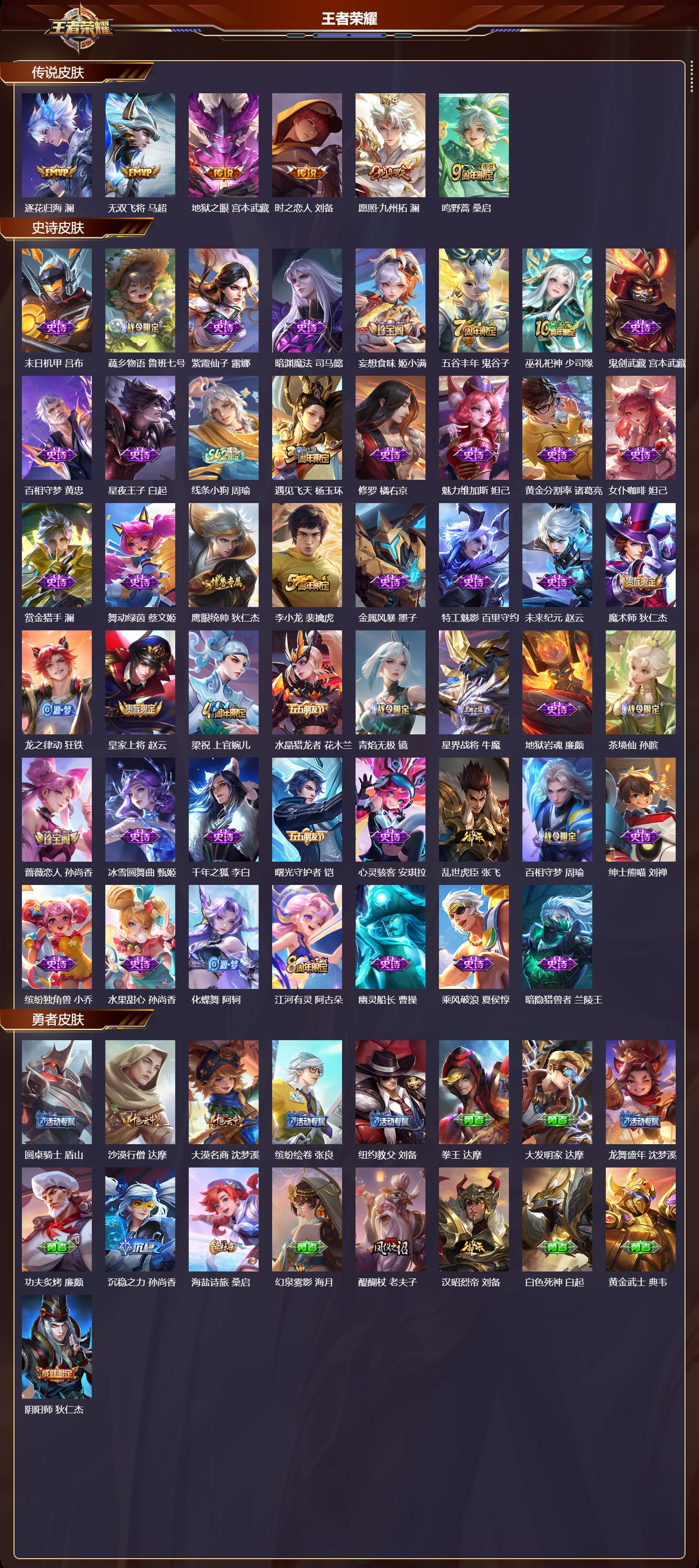 【47,史诗皮肤】末日机甲,吕布,蔬乡物语,鲁班七号,紫霞仙子,露娜,暗渊魔法,司马懿,妄想食味,姬小满,五谷丰年,鬼谷子,巫礼祀神,少司缘,鬼剑武藏,宫本武藏,百相守梦,黄忠,星夜王子,白起,线条小狗,周瑜,遇见飞天,杨玉环,修罗,橘右京,魅力维加斯,妲己,黄金分割率,诸葛亮,女仆咖啡,妲己,赏金猎手,澜,舞动绿茵,蔡文姬,鹰眼统帅,狄仁杰,李小龙,裴擒虎,金属风暴,墨子,特工魅影,百里守约,未来纪元,赵云,魔术师,狄仁杰,龙之律动,狂铁,皇家上将,赵云,梁祝,上官婉儿,水晶猎龙者,花木兰,青焰无极,镜,星界战将,牛魔,地狱岩魂,廉颇,茶境仙,孙膑,蔷薇恋人,孙尚香,冰雪圆舞曲,甄姬,千年之狐,李白,曙光守护者,铠,心灵骇客,安琪拉,乱世虎臣,张飞,百相守梦,周瑜,绅士熊喵,刘禅,缤纷独角兽,小乔,水果甜心,孙尚香,化蝶舞,阿轲,江河有灵,阿古朵,幽灵船长,曹操,乘风破浪,夏侯惇,暗隐猎兽者,兰陵王,