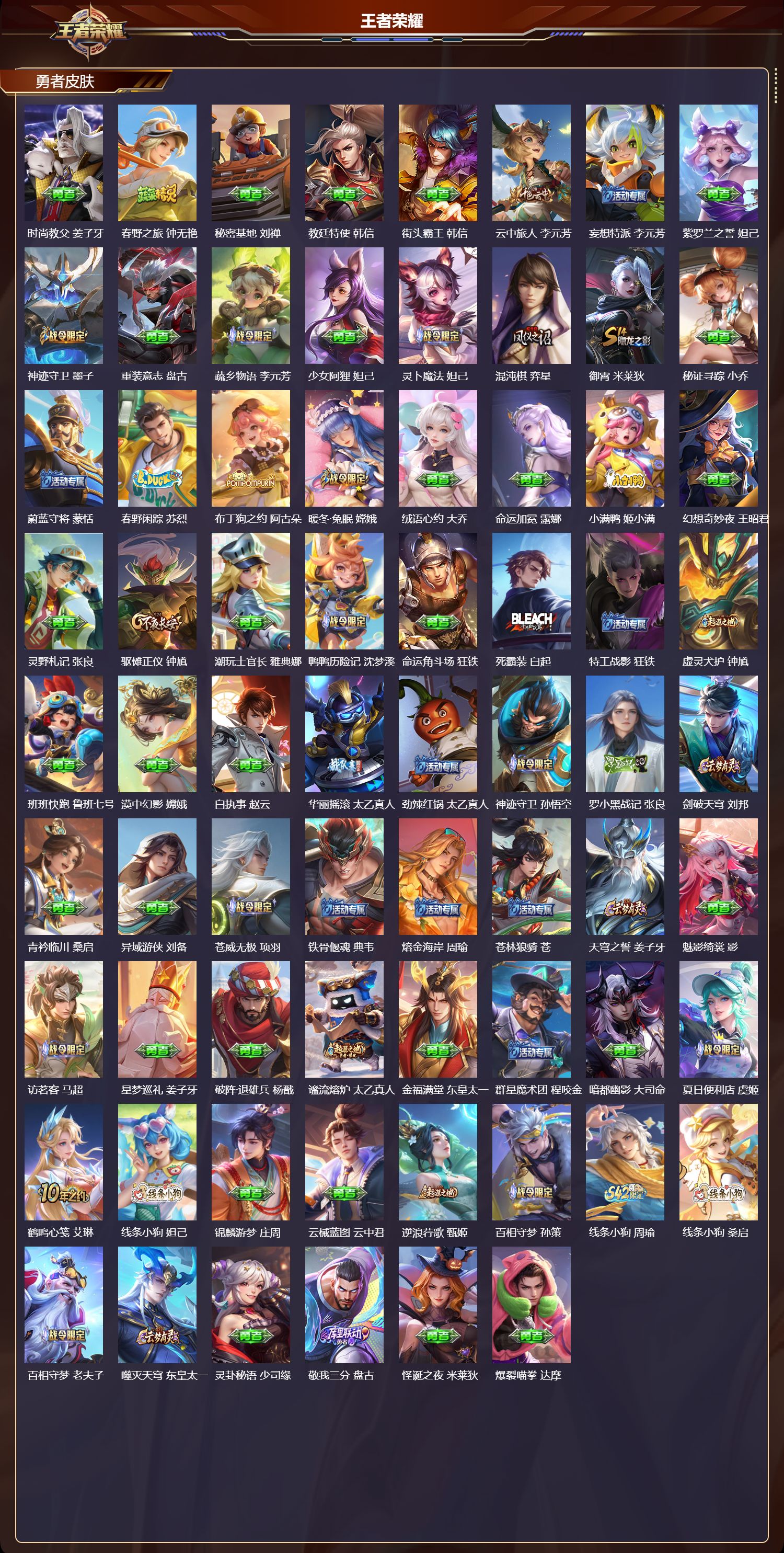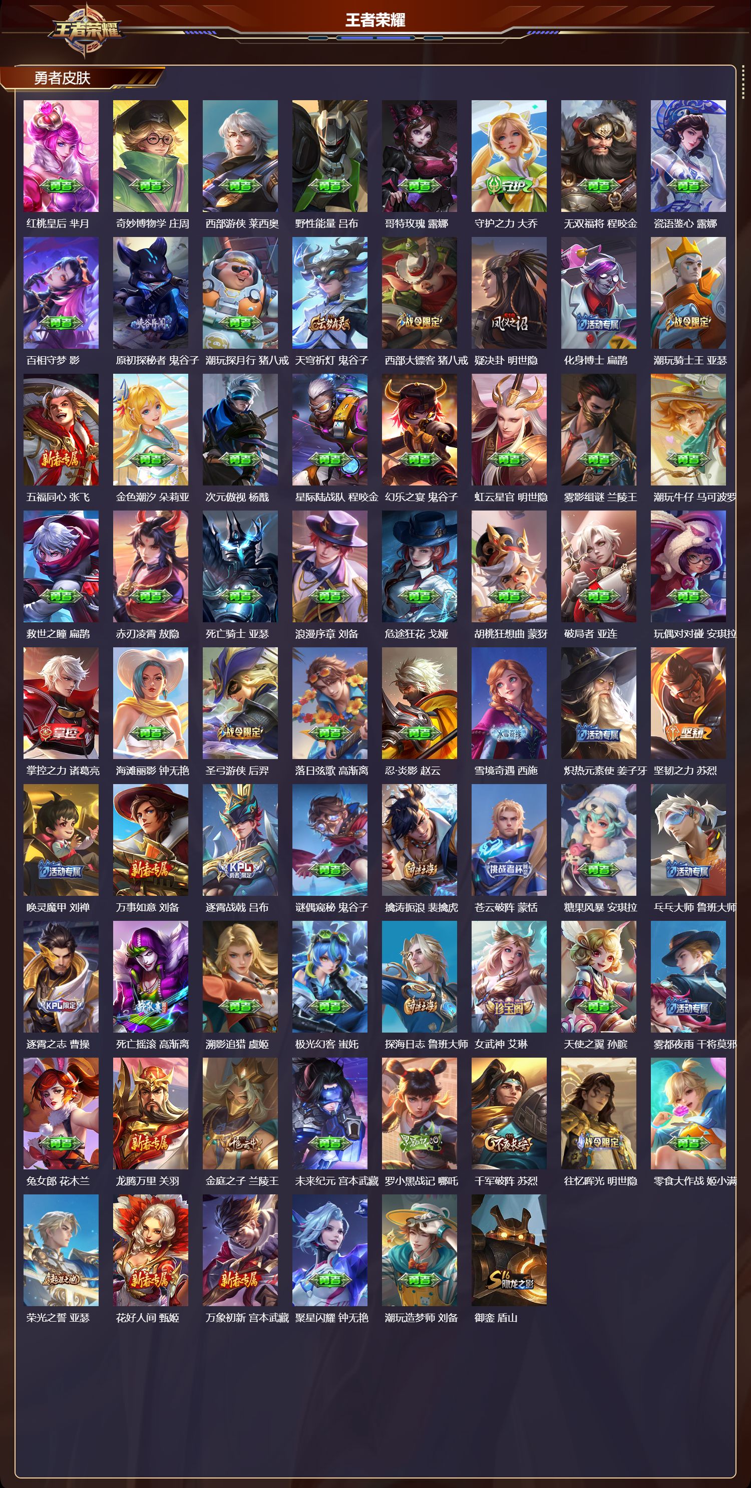 【186,勇者皮肤】时空谍影,海诺,胡桃夹子,干将莫邪,圆桌骑士,盾山,爱心护理,阿轲,太极少年,赵怀真,沙漠行僧,达摩,大漠名商,沈梦溪,缤纷绘卷,张良,纽约教父,刘备,拳王,达摩,大发明家,达摩,龙舞盛年,沈梦溪,丁香结,小乔,功夫炙烤,廉颇,铁甲之心,典韦,沉稳之力,孙尚香,幻夜卜梦,芈月,海盐诗旅,桑启,幻泉雾影,海月,朔风刀,夏侯惇,醍醐杖,老夫子,归虚梦演,孙膑,汉昭烈帝,刘备,热血海滩,哪吒,白色死神,白起,黑桃队长,鲁班七号,黄金武士,典韦,阴阳师,狄仁杰,径山谋武,孙权,次元突破,哪吒,古海寻踪,张良,科学大爆炸,项羽,戏梦巡演,空空儿,功夫老勺,老夫子,西部大镖客,牛魔,鲨炮海盗猫,沈梦溪,海滩派对,项羽,完美运算,后羿,万华元夜,狄仁杰,无尽征程,廉颇,克喵,鬼谷子,制霸全明星,牛魔,踏浪烽翎,莱西奥,演武夺筹,程咬金,红桃皇后,芈月,奇妙博物学,庄周,西部游侠,莱西奥,野性能量,吕布,哥特玫瑰,露娜,守护之力,大乔,无双福将,程咬金,瓷语鉴心,露娜,百相守梦,影,原初探秘者,鬼谷子,潮玩探月行,猪八戒,天穹祈灯,鬼谷子,西部大镖客,猪八戒,疑决卦,明世隐,化身博士,扁鹊,潮玩骑士王,亚瑟,五福同心,张飞,金色潮汐,朵莉亚,次元傲视,杨戬,星际陆战队,程咬金,幻乐之宴,鬼谷子,虹云星官,明世隐,雾影缉谜,兰陵王,潮玩牛仔,马可波罗,救世之瞳,扁鹊,赤刃凌霄,敖隐,死亡骑士,亚瑟,浪漫序章,刘备,危途狂花,戈娅,胡桃狂想曲,蒙犽,破局者,亚连,玩偶对对碰,安琪拉,掌控之力,诸葛亮,海滩丽影,钟无艳,圣弓游侠,后羿,落日弦歌,高渐离,忍·炎影,赵云,雪境奇遇,西施,炽热元素使,姜子牙,坚韧之力,苏烈,唤灵魔甲,刘禅,万事如意,刘备,逐霄战戟,吕布,谜偶窥秘,鬼谷子,擒涛扼浪,裴擒虎,苍云破阵,蒙恬,糖果风暴,安琪拉,乓乓大师,鲁班大师,逐霄之志,曹操,死亡摇滚,高渐离,溯影追猎,虞姬,极光幻客,蚩奼,探海日志,鲁班大师,女武神,艾琳,天使之翼,孙膑,雾都夜雨,干将莫邪,兔女郎,花木兰,龙腾万里,关羽,金庭之子,兰陵王,未来纪元,宫本武藏,罗小黑战记,哪吒,千军破阵,苏烈,往忆晖光,明世隐,零食大作战,姬小满,荣光之誓,亚瑟,花好人间,甄姬,万象初新,宫本武藏,聚星闪耀,钟无艳,潮玩造梦师,刘备,御銮,盾山,时尚教父,姜子牙,春野之旅,钟无艳,秘密基地,刘禅,教廷特使,韩信,街头霸王,韩信,云中旅人,李元芳,妄想特派,李元芳,紫罗兰之誓,妲己,神迹守卫,墨子,重装意志,盘古,蔬乡物语,李元芳,少女阿狸,妲己,灵卜魔法,妲己,混沌棋,弈星,御霄,米莱狄,秘证寻踪,小乔,蔚蓝守将,蒙恬,春野闲踪,苏烈,布丁狗之约,阿古朵,暖冬·兔眠,嫦娥,绒语心约,大乔,命运加冕,露娜,小满鸭,姬小满,幻想奇妙夜,王昭君,灵野札记,张良,驱傩正仪,钟馗,潮玩士官长,雅典娜,鸭鸭历险记,沈梦溪,命运角斗场,狂铁,死霸装,白起,特工战影,狂铁,虚灵犬护,钟馗,班班快跑,鲁班七号,漠中幻影,嫦娥,白执事,赵云,华丽摇滚,太乙真人,劲辣红锅,太乙真人,神迹守卫,孙悟空,罗小黑战记,张良,剑破天穹,刘邦,青衿临川,桑启,异域游侠,刘备,苍威无极,项羽,铁骨偃魂,典韦,熔金海岸,周瑜,苍林狼骑,苍,天穹之誓,姜子牙,魅影绮裳,影,访茗客,马超,星梦巡礼,姜子牙,破阵·退雄兵,杨戬,谧流熔炉,太乙真人,金福满堂,东皇太一,群星魔术团,程咬金,暗都幽影,大司命,夏日便利店,虞姬,鹤鸣心笺,艾琳,线条小狗,妲己,锦麟游梦,庄周,云械蓝图,云中君,逆浪荇歌,甄姬,百相守梦,孙策,线条小狗,周瑜,线条小狗,桑启,百相守梦,老夫子,噬灭天穹,东皇太一,灵卦秘语,少司缘,敬我三分,盘古,怪诞之夜,米莱狄,爆裂喵拳,达摩,玫蓝誓约,戈娅,景韶洛都,明世隐,