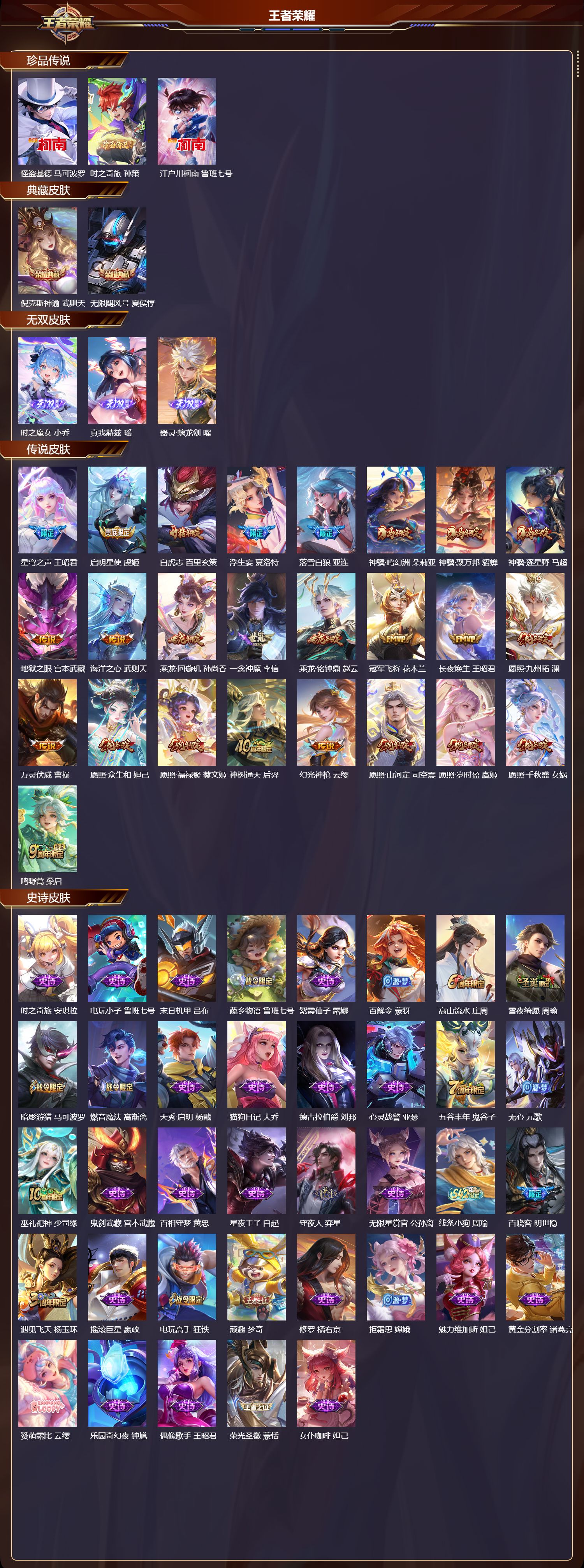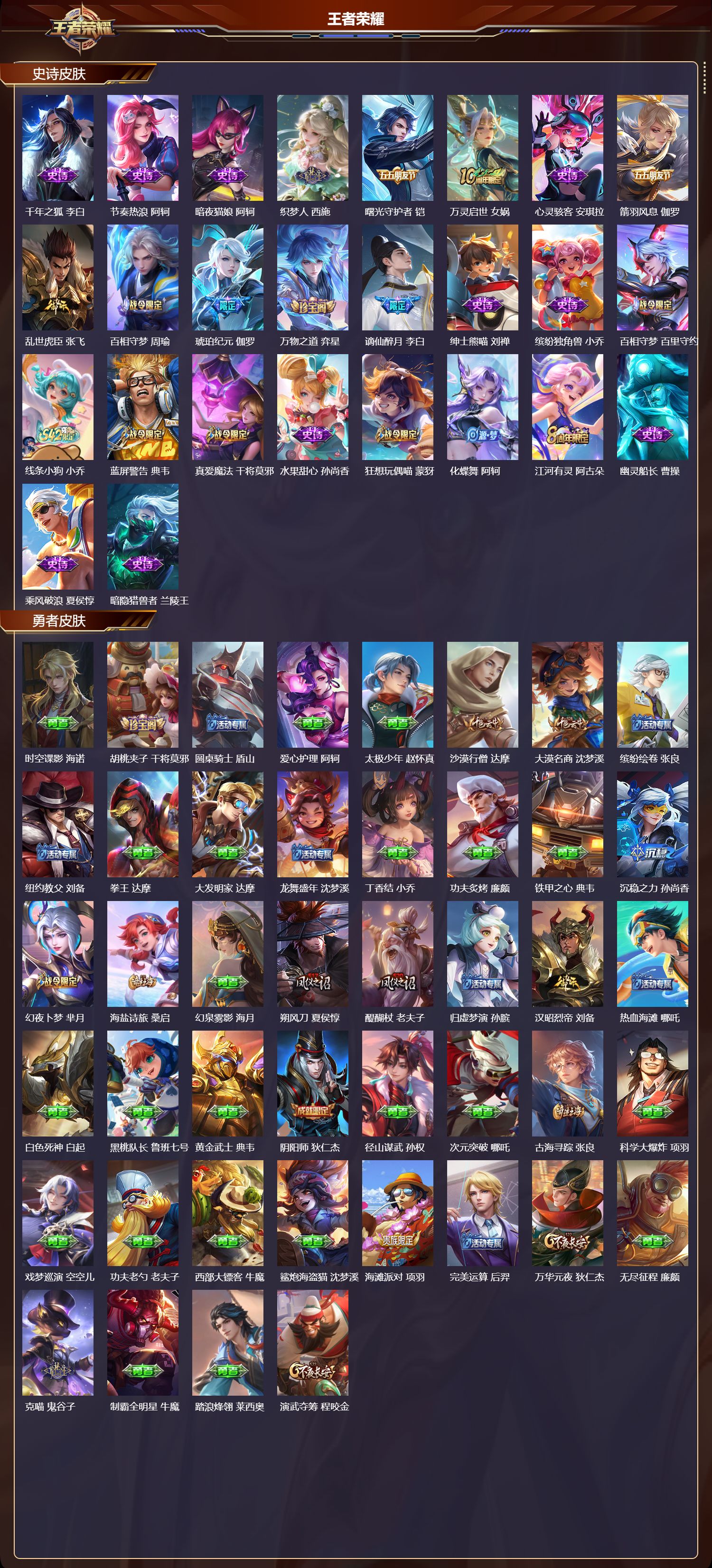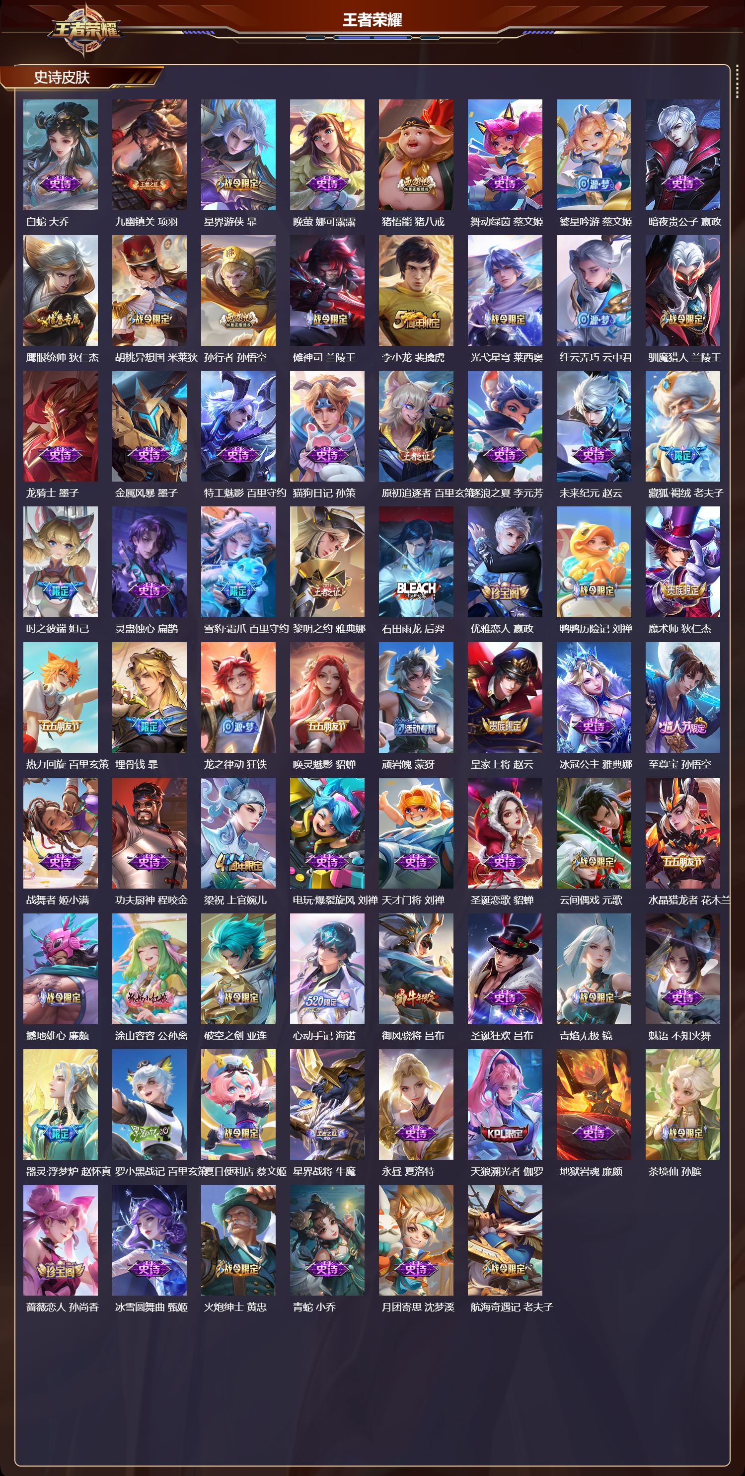 【133,史诗皮肤】时之奇旅,安琪拉,电玩小子,鲁班七号,末日机甲,吕布,蔬乡物语,鲁班七号,紫霞仙子,露娜,百解令,蒙犽,高山流水,庄周,雪夜绮愿,周瑜,暗影游猎,马可波罗,燃音魔法,高渐离,天秀·启明,杨戬,猫狗日记,大乔,德古拉伯爵,刘邦,心灵战警,亚瑟,五谷丰年,鬼谷子,无心,元歌,巫礼祀神,少司缘,鬼剑武藏,宫本武藏,百相守梦,黄忠,星夜王子,白起,守夜人,弈星,无限星赏官,公孙离,线条小狗,周瑜,百晓客,明世隐,遇见飞天,杨玉环,摇滚巨星,嬴政,电玩高手,狂铁,顽趣,梦奇,修罗,橘右京,拒霜思,嫦娥,魅力维加斯,妲己,黄金分割率,诸葛亮,赞萌露比,云缨,乐园奇幻夜,钟馗,偶像歌手,王昭君,荣光圣徽,蒙恬,女仆咖啡,妲己,白蛇,大乔,九幽镇关,项羽,星界游侠,暃,晚萤,娜可露露,猪悟能,猪八戒,舞动绿茵,蔡文姬,繁星吟游,蔡文姬,暗夜贵公子,嬴政,鹰眼统帅,狄仁杰,胡桃异想国,米莱狄,孙行者,孙悟空,傩神司,兰陵王,李小龙,裴擒虎,光弋星穹,莱西奥,纤云弄巧,云中君,驯魔猎人,兰陵王,龙骑士,墨子,金属风暴,墨子,特工魅影,百里守约,猫狗日记,孙策,原初追逐者,百里玄策,逐浪之夏,李元芳,未来纪元,赵云,藏狐·褐绒,老夫子,时之彼端,妲己,灵蛊蚀心,扁鹊,雪豹·霜爪,百里守约,黎明之约,雅典娜,石田雨龙,后羿,优雅恋人,嬴政,鸭鸭历险记,刘禅,魔术师,狄仁杰,热力回旋,百里玄策,埋骨钱,暃,龙之律动,狂铁,唤灵魅影,貂蝉,顽岩魄,蒙犽,皇家上将,赵云,冰冠公主,雅典娜,至尊宝,孙悟空,战舞者,姬小满,功夫厨神,程咬金,梁祝,上官婉儿,电玩·爆裂旋风,刘禅,天才门将,刘禅,圣诞恋歌,貂蝉,云间偶戏,元歌,水晶猎龙者,花木兰,撼地雄心,廉颇,涂山容容,公孙离,破空之剑,亚连,心动手记,海诺,御风骁将,吕布,圣诞狂欢,吕布,青焰无极,镜,魅语,不知火舞,器灵·浮梦炉,赵怀真,罗小黑战记,百里玄策,夏日便利店,蔡文姬,星界战将,牛魔,永昼,夏洛特,天狼溯光者,伽罗,地狱岩魂,廉颇,茶境仙,孙膑,蔷薇恋人,孙尚香,冰雪圆舞曲,甄姬,火炮绅士,黄忠,青蛇,小乔,月团寄思,沈梦溪,航海奇遇记,老夫子,千年之狐,李白,节奏热浪,阿轲,暗夜猫娘,阿轲,织梦人,西施,曙光守护者,铠,万灵启世,女娲,心灵骇客,安琪拉,箭羽风息,伽罗,乱世虎臣,张飞,百相守梦,周瑜,琥珀纪元,伽罗,万物之道,弈星,谪仙醉月,李白,绅士熊喵,刘禅,缤纷独角兽,小乔,百相守梦,百里守约,线条小狗,小乔,蓝屏警告,典韦,真爱魔法,干将莫邪,水果甜心,孙尚香,狂想玩偶喵,蒙犽,化蝶舞,阿轲,江河有灵,阿古朵,幽灵船长,曹操,乘风破浪,夏侯惇,暗隐猎兽者,兰陵王,