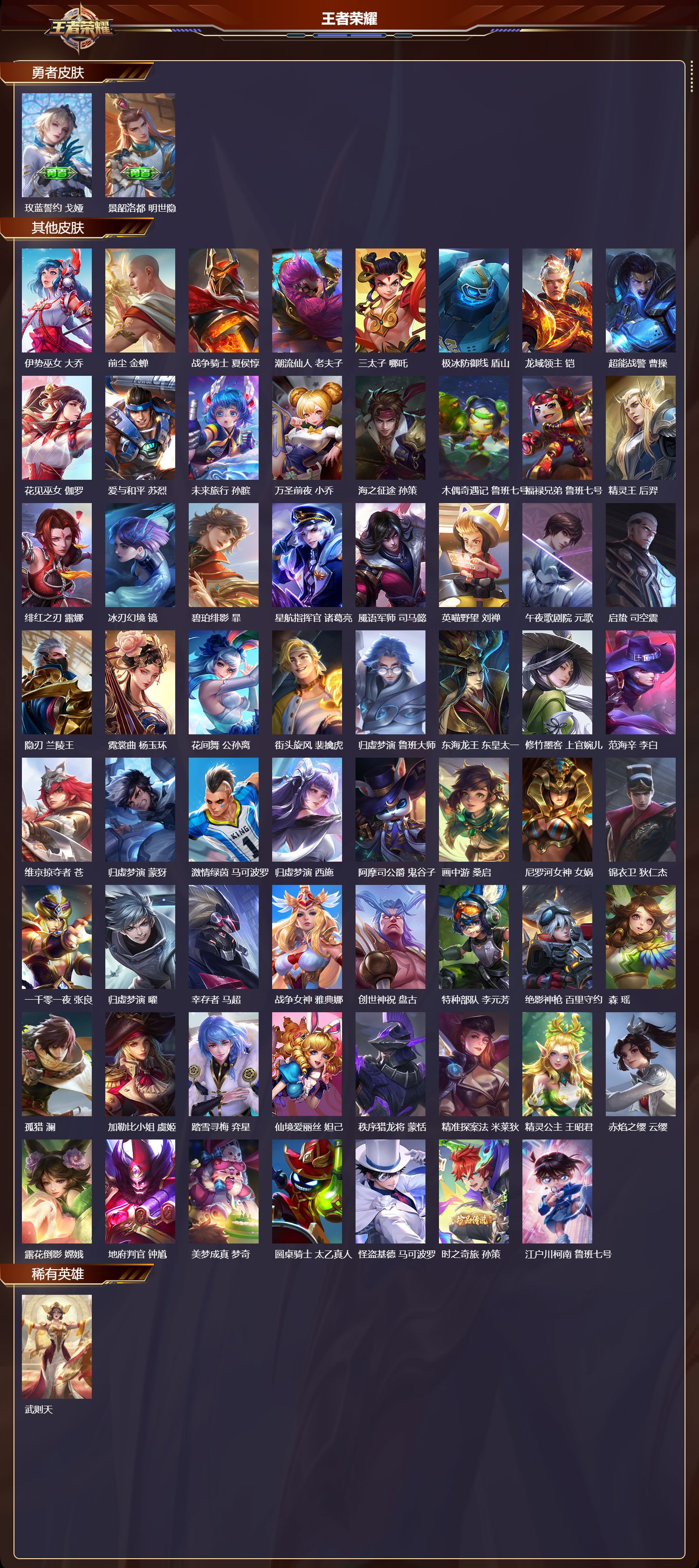 【63,其他皮肤】伊势巫女,大乔,前尘,金蝉,战争骑士,夏侯惇,潮流仙人,老夫子,三太子,哪吒,极冰防御线,盾山,龙域领主,铠,超能战警,曹操,花见巫女,伽罗,爱与和平,苏烈,未来旅行,孙膑,万圣前夜,小乔,海之征途,孙策,木偶奇遇记,鲁班七号,福禄兄弟,鲁班七号,精灵王,后羿,绯红之刃,露娜,冰刃幻境,镜,碧珀绯影,暃,星航指挥官,诸葛亮,魇语军师,司马懿,英喵野望,刘禅,午夜歌剧院,元歌,启蛰,司空震,隐刃,兰陵王,霓裳曲,杨玉环,花间舞,公孙离,街头旋风,裴擒虎,归虚梦演,鲁班大师,东海龙王,东皇太一,修竹墨客,上官婉儿,范海辛,李白,维京掠夺者,苍,归虚梦演,蒙犽,激情绿茵,马可波罗,归虚梦演,西施,阿摩司公爵,鬼谷子,画中游,桑启,尼罗河女神,女娲,锦衣卫,狄仁杰,一千零一夜,张良,归虚梦演,曜,幸存者,马超,战争女神,雅典娜,创世神祝,盘古,特种部队,李元芳,绝影神枪,百里守约,森,瑶,孤猎,澜,加勒比小姐,虞姬,踏雪寻梅,弈星,仙境爱丽丝,妲己,秩序猎龙将,蒙恬,精准探案法,米莱狄,精灵公主,王昭君,赤焰之缨,云缨,露花倒影,嫦娥,地府判官,钟馗,美梦成真,梦奇,圆桌骑士,太乙真人,怪盗基德,马可波罗,时之奇旅,孙策,江户川柯南,鲁班七号,