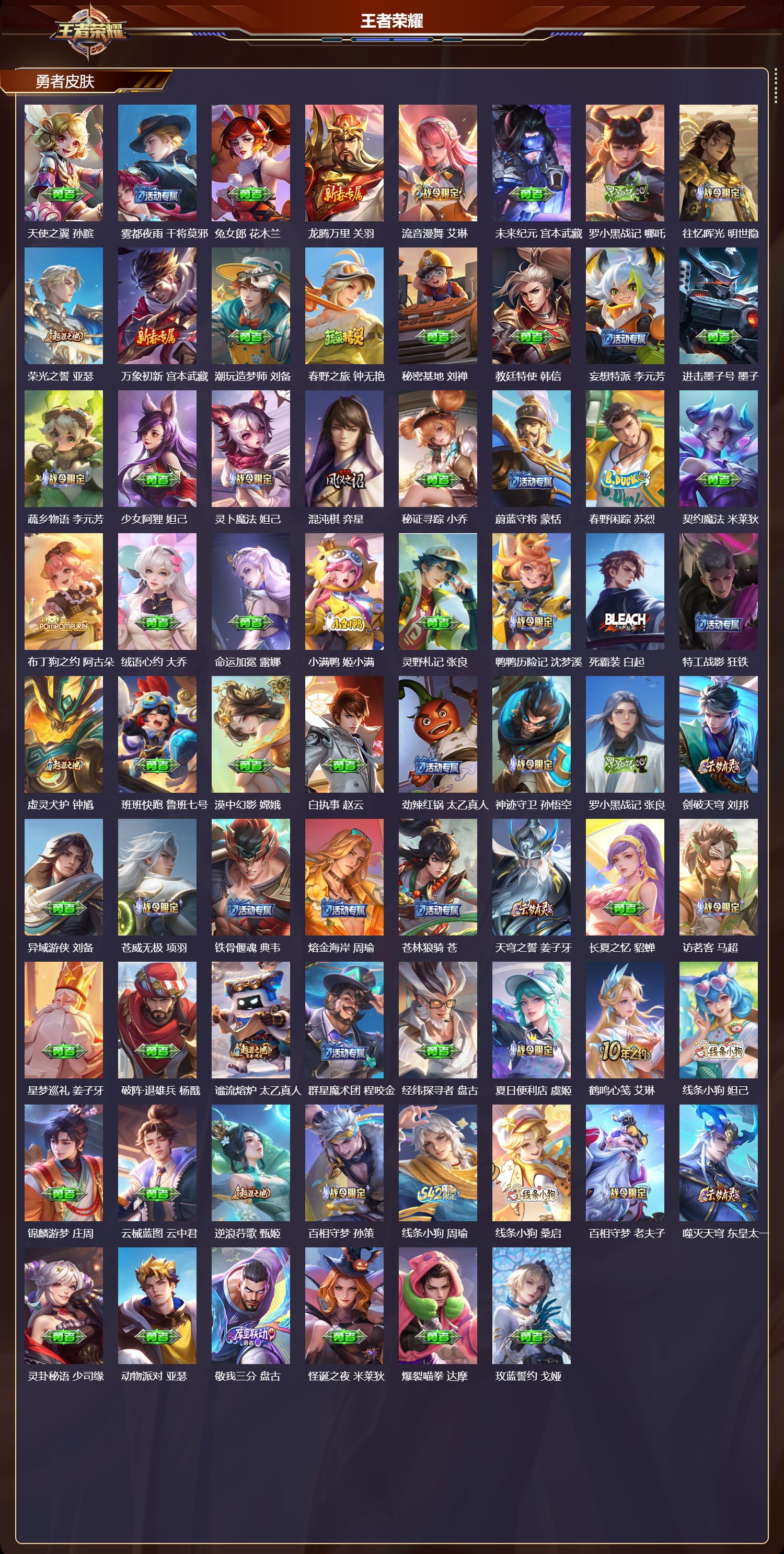 【138,勇者皮肤】玲珑珍味,西施,爱心护理,阿轲,沙漠行僧,达摩,缤纷绘卷,张良,纽约教父,刘备,拳王,达摩,大发明家,达摩,龙舞盛年,沈梦溪,丁香结,小乔,功夫炙烤,廉颇,沉稳之力,孙尚香,海盐诗旅,桑启,汉昭烈帝,刘备,白色死神,白起,黑桃队长,鲁班七号,黄金武士,典韦,阴阳师,狄仁杰,次元突破,哪吒,牛运亨通,牛魔,功夫老勺,老夫子,鲨炮海盗猫,沈梦溪,虎啸剑宗,刘邦,海滩派对,项羽,完美运算,后羿,万华元夜,狄仁杰,克喵,鬼谷子,踏浪烽翎,莱西奥,演武夺筹,程咬金,野性能量,吕布,哥特玫瑰,露娜,守护之力,大乔,无双福将,程咬金,瓷语鉴心,露娜,百相守梦,影,潮玩探月行,猪八戒,鸿运当头,亚瑟,天穹祈灯,鬼谷子,决胜大满贯,曹操,疑决卦,明世隐,无尽旅途,扁鹊,五福同心,张飞,金色潮汐,朵莉亚,次元傲视,杨戬,幻乐之宴,鬼谷子,虹云星官,明世隐,雾影缉谜,兰陵王,舞狮寰,吕布,赤刃凌霄,敖隐,死亡骑士,亚瑟,浪漫序章,刘备,敏锐之力,李白,胡桃狂想曲,蒙犽,幽兰居士,张良,掌控之力,诸葛亮,海滩丽影,钟无艳,落日弦歌,高渐离,忍·炎影,赵云,雪境奇遇,西施,坚韧之力,苏烈,万事如意,刘备,逐霄战戟,吕布,苍云破阵,蒙恬,糖果风暴,安琪拉,乓乓大师,鲁班大师,逐霄之志,曹操,溯影追猎,虞姬,极光幻客,蚩奼,天使之翼,孙膑,雾都夜雨,干将莫邪,兔女郎,花木兰,龙腾万里,关羽,流音漫舞,艾琳,未来纪元,宫本武藏,罗小黑战记,哪吒,往忆晖光,明世隐,荣光之誓,亚瑟,万象初新,宫本武藏,潮玩造梦师,刘备,春野之旅,钟无艳,秘密基地,刘禅,教廷特使,韩信,妄想特派,李元芳,进击墨子号,墨子,蔬乡物语,李元芳,少女阿狸,妲己,灵卜魔法,妲己,混沌棋,弈星,秘证寻踪,小乔,蔚蓝守将,蒙恬,春野闲踪,苏烈,契约魔法,米莱狄,布丁狗之约,阿古朵,绒语心约,大乔,命运加冕,露娜,小满鸭,姬小满,灵野札记,张良,鸭鸭历险记,沈梦溪,死霸装,白起,特工战影,狂铁,虚灵犬护,钟馗,班班快跑,鲁班七号,漠中幻影,嫦娥,白执事,赵云,劲辣红锅,太乙真人,神迹守卫,孙悟空,罗小黑战记,张良,剑破天穹,刘邦,异域游侠,刘备,苍威无极,项羽,铁骨偃魂,典韦,熔金海岸,周瑜,苍林狼骑,苍,天穹之誓,姜子牙,长夏之忆,貂蝉,访茗客,马超,星梦巡礼,姜子牙,破阵·退雄兵,杨戬,谧流熔炉,太乙真人,群星魔术团,程咬金,经纬探寻者,盘古,夏日便利店,虞姬,鹤鸣心笺,艾琳,线条小狗,妲己,锦麟游梦,庄周,云械蓝图,云中君,逆浪荇歌,甄姬,百相守梦,孙策,线条小狗,周瑜,线条小狗,桑启,百相守梦,老夫子,噬灭天穹,东皇太一,灵卦秘语,少司缘,动物派对,亚瑟,敬我三分,盘古,怪诞之夜,米莱狄,爆裂喵拳,达摩,玫蓝誓约,戈娅,景韶洛都,明世隐,