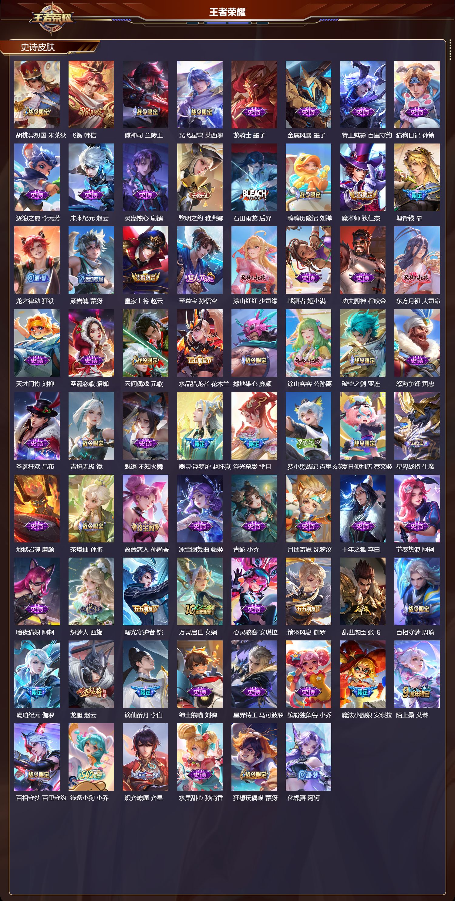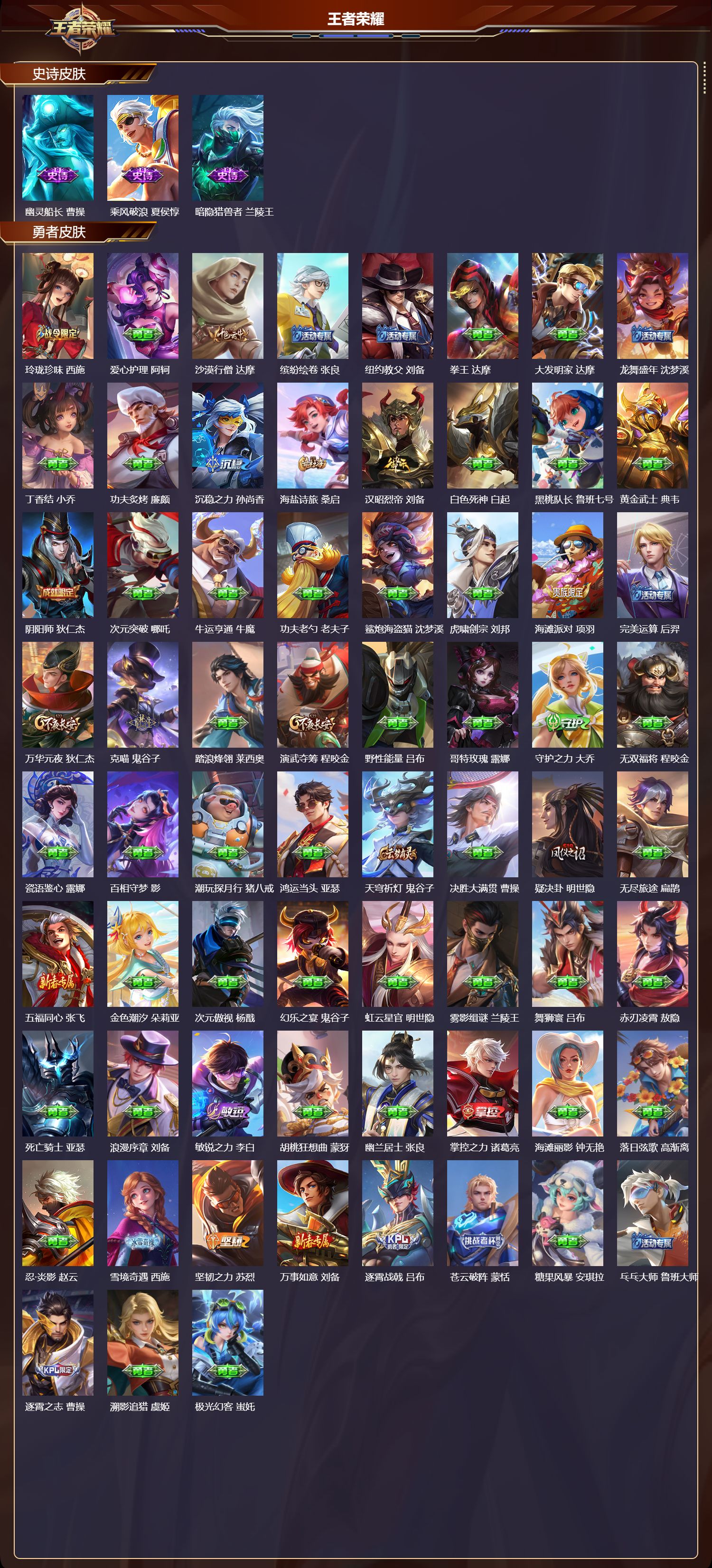 【108,史诗皮肤】末日机甲,吕布,蔬乡物语,鲁班七号,燃音魔法,高渐离,天秀·启明,杨戬,猫狗日记,大乔,德古拉伯爵,刘邦,心灵战警,亚瑟,星君·亢金,达摩,诗语江南,西施,无心,元歌,巫礼祀神,少司缘,鬼剑武藏,宫本武藏,百相守梦,黄忠,迷踪丽影,阿轲,星夜王子,白起,无限星赏官,公孙离,锁墨魂,钟馗,线条小狗,周瑜,玉兔公主,公孙离,摇滚巨星,嬴政,电玩高手,狂铁,冰锋战神,关羽,修罗,橘右京,拒霜思,嫦娥,魅力维加斯,妲己,乐园奇幻夜,钟馗,偶像歌手,王昭君,荣光圣徽,蒙恬,女仆咖啡,妲己,白蛇,大乔,九幽镇关,项羽,晚萤,娜可露露,舞动绿茵,蔡文姬,暗夜贵公子,嬴政,鹰眼统帅,狄仁杰,胡桃异想国,米莱狄,飞衡,韩信,傩神司,兰陵王,光弋星穹,莱西奥,龙骑士,墨子,金属风暴,墨子,特工魅影,百里守约,猫狗日记,孙策,逐浪之夏,李元芳,未来纪元,赵云,灵蛊蚀心,扁鹊,黎明之约,雅典娜,石田雨龙,后羿,鸭鸭历险记,刘禅,魔术师,狄仁杰,埋骨钱,暃,龙之律动,狂铁,顽岩魄,蒙犽,皇家上将,赵云,至尊宝,孙悟空,涂山红红,少司缘,战舞者,姬小满,功夫厨神,程咬金,东方月初,大司命,天才门将,刘禅,圣诞恋歌,貂蝉,云间偶戏,元歌,水晶猎龙者,花木兰,撼地雄心,廉颇,涂山容容,公孙离,破空之剑,亚连,怒海争锋,黄忠,圣诞狂欢,吕布,青焰无极,镜,魅语,不知火舞,器灵·浮梦炉,赵怀真,浮光幕影,芈月,罗小黑战记,百里玄策,夏日便利店,蔡文姬,星界战将,牛魔,地狱岩魂,廉颇,茶境仙,孙膑,蔷薇恋人,孙尚香,冰雪圆舞曲,甄姬,青蛇,小乔,月团寄思,沈梦溪,千年之狐,李白,节奏热浪,阿轲,暗夜猫娘,阿轲,织梦人,西施,曙光守护者,铠,万灵启世,女娲,心灵骇客,安琪拉,箭羽风息,伽罗,乱世虎臣,张飞,百相守梦,周瑜,琥珀纪元,伽罗,龙胆,赵云,谪仙醉月,李白,绅士熊喵,刘禅,星界特工,马可波罗,缤纷独角兽,小乔,魔法小厨娘,安琪拉,陌上桑,艾琳,百相守梦,百里守约,线条小狗,小乔,炽弈燎原,弈星,水果甜心,孙尚香,狂想玩偶喵,蒙犽,化蝶舞,阿轲,幽灵船长,曹操,乘风破浪,夏侯惇,暗隐猎兽者,兰陵王,