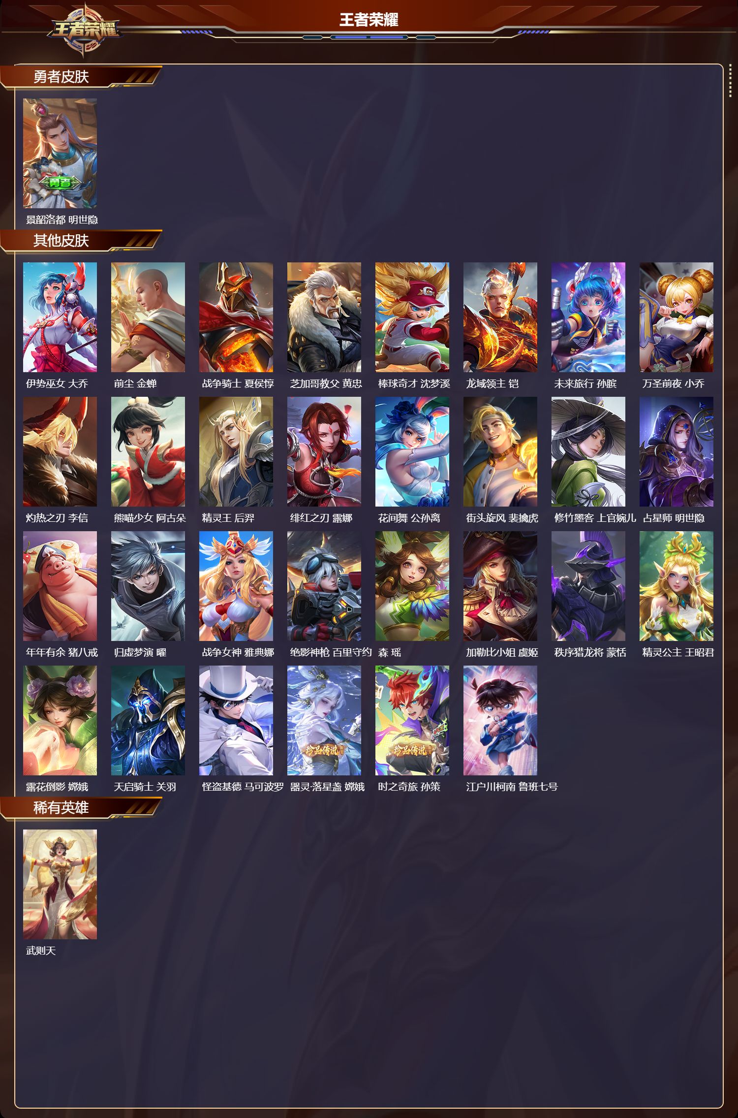 【30,其他皮肤】伊势巫女,大乔,前尘,金蝉,战争骑士,夏侯惇,芝加哥教父,黄忠,棒球奇才,沈梦溪,龙域领主,铠,未来旅行,孙膑,万圣前夜,小乔,灼热之刃,李信,熊喵少女,阿古朵,精灵王,后羿,绯红之刃,露娜,花间舞,公孙离,街头旋风,裴擒虎,修竹墨客,上官婉儿,占星师,明世隐,年年有余,猪八戒,归虚梦演,曜,战争女神,雅典娜,绝影神枪,百里守约,森,瑶,加勒比小姐,虞姬,秩序猎龙将,蒙恬,精灵公主,王昭君,露花倒影,嫦娥,天启骑士,关羽,怪盗基德,马可波罗,器灵·落星盏,嫦娥,时之奇旅,孙策,江户川柯南,鲁班七号,