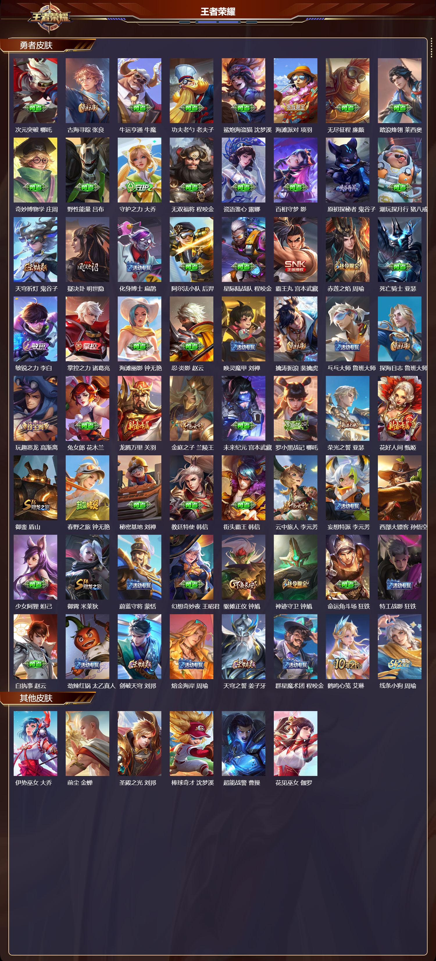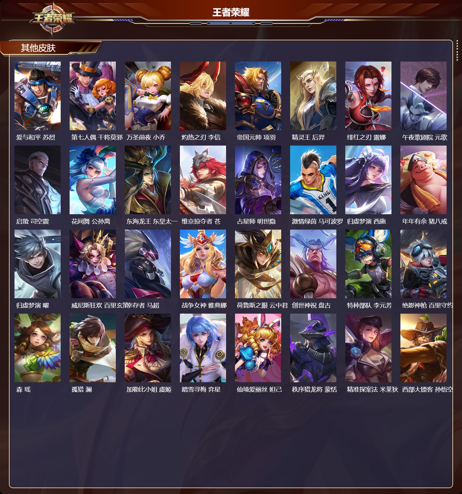 【38,其他皮肤】伊势巫女,大乔,前尘,金蝉,圣殿之光,刘邦,棒球奇才,沈梦溪,超能战警,曹操,花见巫女,伽罗,爱与和平,苏烈,第七人偶,干将莫邪,万圣前夜,小乔,灼热之刃,李信,帝国元帅,项羽,精灵王,后羿,绯红之刃,露娜,午夜歌剧院,元歌,启蛰,司空震,花间舞,公孙离,东海龙王,东皇太一,维京掠夺者,苍,占星师,明世隐,激情绿茵,马可波罗,归虚梦演,西施,年年有余,猪八戒,归虚梦演,曜,威尼斯狂欢,百里玄策,幸存者,马超,战争女神,雅典娜,荷鲁斯之眼,云中君,创世神祝,盘古,特种部队,李元芳,绝影神枪,百里守约,森,瑶,孤猎,澜,加勒比小姐,虞姬,踏雪寻梅,弈星,仙境爱丽丝,妲己,秩序猎龙将,蒙恬,精准探案法,米莱狄,西部大镖客,孙悟空,