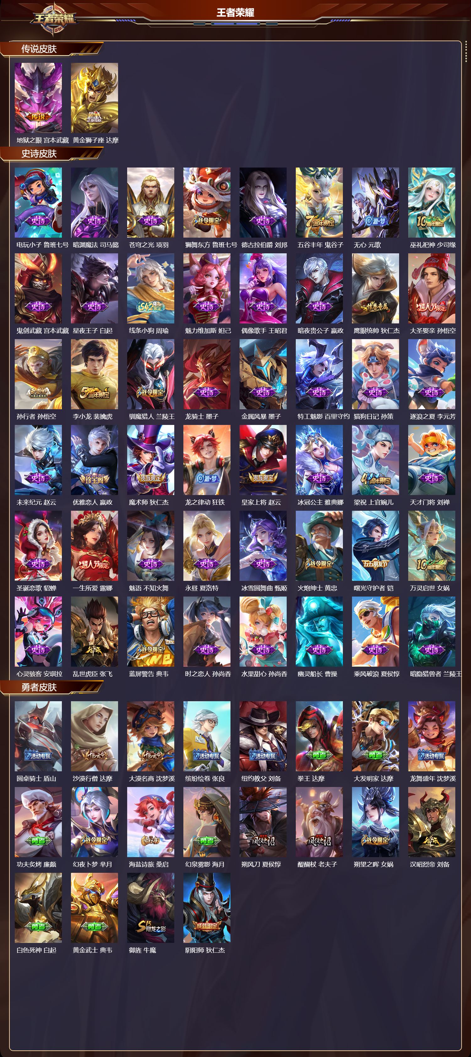 【48,史诗皮肤】电玩小子,鲁班七号,暗渊魔法,司马懿,苍穹之光,项羽,狮舞东方,鲁班七号,德古拉伯爵,刘邦,五谷丰年,鬼谷子,无心,元歌,巫礼祀神,少司缘,鬼剑武藏,宫本武藏,星夜王子,白起,线条小狗,周瑜,魅力维加斯,妲己,偶像歌手,王昭君,暗夜贵公子,嬴政,鹰眼统帅,狄仁杰,大圣娶亲,孙悟空,孙行者,孙悟空,李小龙,裴擒虎,驯魔猎人,兰陵王,龙骑士,墨子,金属风暴,墨子,特工魅影,百里守约,猫狗日记,孙策,逐浪之夏,李元芳,未来纪元,赵云,优雅恋人,嬴政,魔术师,狄仁杰,龙之律动,狂铁,皇家上将,赵云,冰冠公主,雅典娜,梁祝,上官婉儿,天才门将,刘禅,圣诞恋歌,貂蝉,一生所爱,露娜,魅语,不知火舞,永昼,夏洛特,冰雪圆舞曲,甄姬,火炮绅士,黄忠,曙光守护者,铠,万灵启世,女娲,心灵骇客,安琪拉,乱世虎臣,张飞,蓝屏警告,典韦,时之恋人,孙尚香,水果甜心,孙尚香,幽灵船长,曹操,乘风破浪,夏侯惇,暗隐猎兽者,兰陵王,