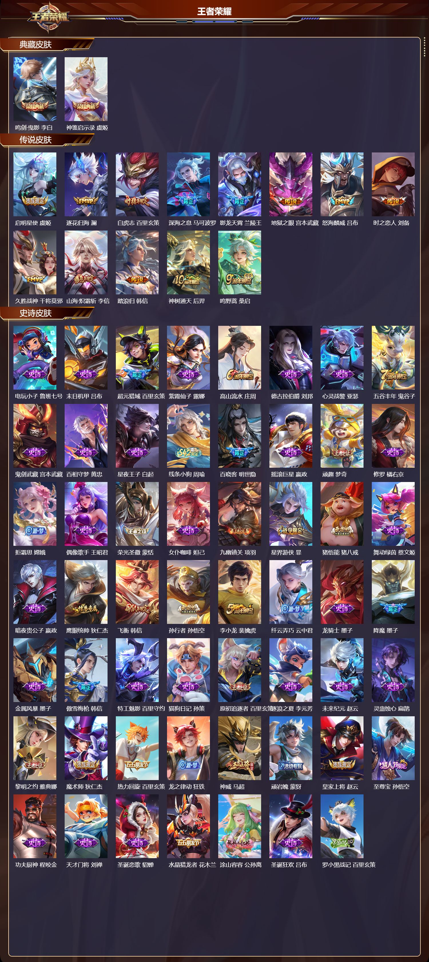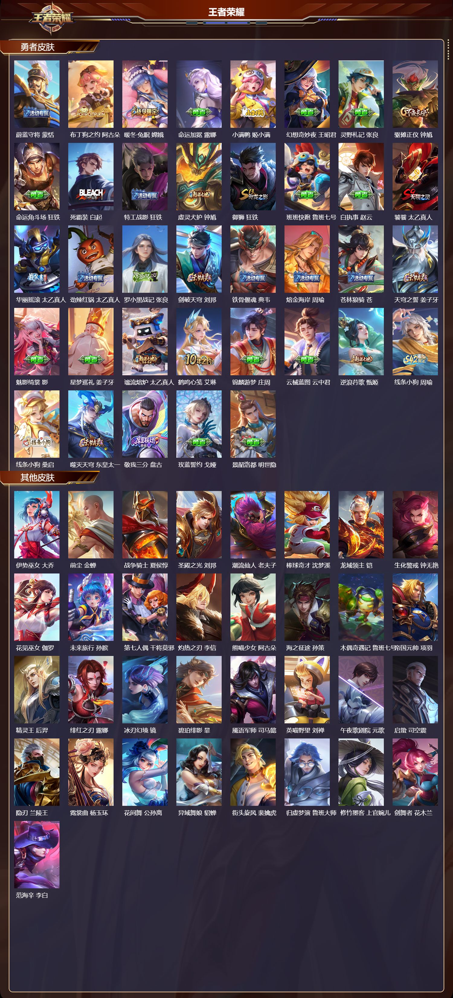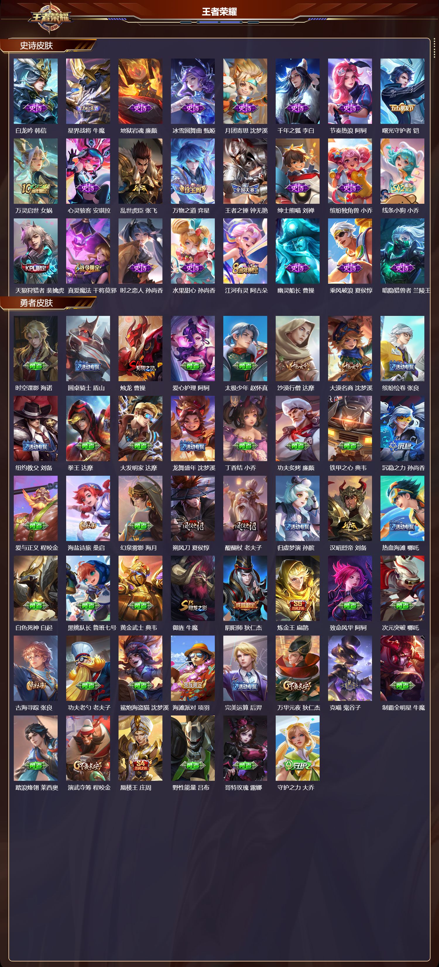 【79,史诗皮肤】电玩小子,鲁班七号,末日机甲,吕布,超元猎域,百里玄策,紫霞仙子,露娜,高山流水,庄周,德古拉伯爵,刘邦,心灵战警,亚瑟,五谷丰年,鬼谷子,鬼剑武藏,宫本武藏,百相守梦,黄忠,星夜王子,白起,线条小狗,周瑜,百晓客,明世隐,摇滚巨星,嬴政,顽趣,梦奇,修罗,橘右京,拒霜思,嫦娥,偶像歌手,王昭君,荣光圣徽,蒙恬,女仆咖啡,妲己,九幽镇关,项羽,星界游侠,暃,猪悟能,猪八戒,舞动绿茵,蔡文姬,暗夜贵公子,嬴政,鹰眼统帅,狄仁杰,飞衡,韩信,孙行者,孙悟空,李小龙,裴擒虎,纤云弄巧,云中君,龙骑士,墨子,降魔,墨子,金属风暴,墨子,傲雪梅枪,韩信,特工魅影,百里守约,猫狗日记,孙策,原初追逐者,百里玄策,逐浪之夏,李元芳,未来纪元,赵云,灵蛊蚀心,扁鹊,黎明之约,雅典娜,魔术师,狄仁杰,热力回旋,百里玄策,龙之律动,狂铁,神威,马超,顽岩魄,蒙犽,皇家上将,赵云,至尊宝,孙悟空,功夫厨神,程咬金,天才门将,刘禅,圣诞恋歌,貂蝉,水晶猎龙者,花木兰,涂山容容,公孙离,圣诞狂欢,吕布,罗小黑战记,百里玄策,白龙吟,韩信,星界战将,牛魔,地狱岩魂,廉颇,冰雪圆舞曲,甄姬,月团寄思,沈梦溪,千年之狐,李白,节奏热浪,阿轲,曙光守护者,铠,万灵启世,女娲,心灵骇客,安琪拉,乱世虎臣,张飞,万物之道,弈星,王者之锤,钟无艳,绅士熊喵,刘禅,缤纷独角兽,小乔,线条小狗,小乔,天狼狩猎者,裴擒虎,真爱魔法,干将莫邪,时之恋人,孙尚香,水果甜心,孙尚香,江河有灵,阿古朵,幽灵船长,曹操,乘风破浪,夏侯惇,暗隐猎兽者,兰陵王,