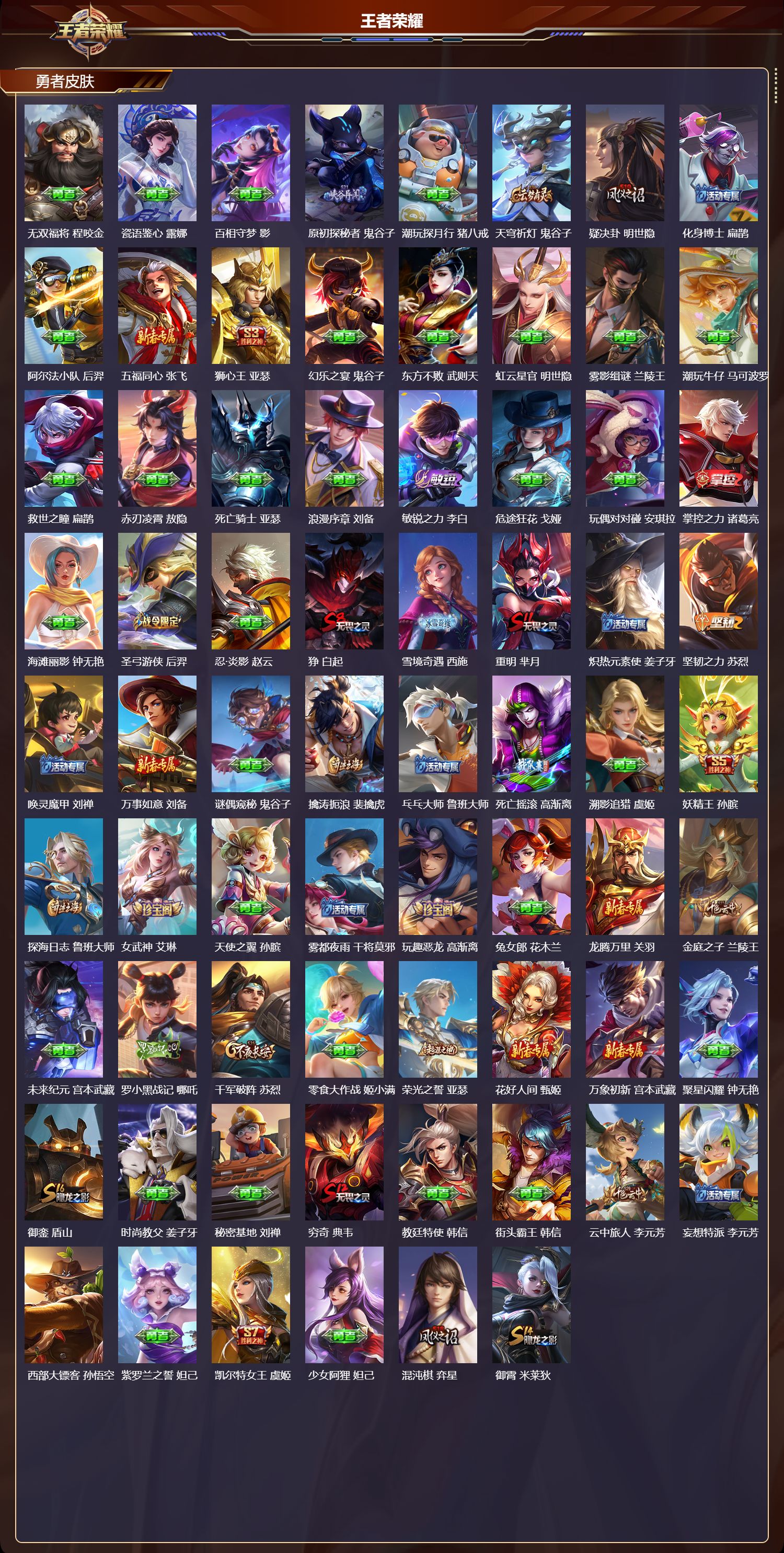 【153,勇者皮肤】时空谍影,海诺,圆桌骑士,盾山,烛龙,曹操,爱心护理,阿轲,太极少年,赵怀真,沙漠行僧,达摩,大漠名商,沈梦溪,缤纷绘卷,张良,纽约教父,刘备,拳王,达摩,大发明家,达摩,龙舞盛年,沈梦溪,丁香结,小乔,功夫炙烤,廉颇,铁甲之心,典韦,沉稳之力,孙尚香,爱与正义,程咬金,海盐诗旅,桑启,幻泉雾影,海月,朔风刀,夏侯惇,醍醐杖,老夫子,归虚梦演,孙膑,汉昭烈帝,刘备,热血海滩,哪吒,白色死神,白起,黑桃队长,鲁班七号,黄金武士,典韦,御旌,牛魔,阴阳师,狄仁杰,炼金王,扁鹊,致命风华,阿轲,次元突破,哪吒,古海寻踪,张良,功夫老勺,老夫子,鲨炮海盗猫,沈梦溪,海滩派对,项羽,完美运算,后羿,万华元夜,狄仁杰,克喵,鬼谷子,制霸全明星,牛魔,踏浪烽翎,莱西奥,演武夺筹,程咬金,蜃楼王,庄周,野性能量,吕布,哥特玫瑰,露娜,守护之力,大乔,无双福将,程咬金,瓷语鉴心,露娜,百相守梦,影,原初探秘者,鬼谷子,潮玩探月行,猪八戒,天穹祈灯,鬼谷子,疑决卦,明世隐,化身博士,扁鹊,阿尔法小队,后羿,五福同心,张飞,狮心王,亚瑟,幻乐之宴,鬼谷子,东方不败,武则天,虹云星官,明世隐,雾影缉谜,兰陵王,潮玩牛仔,马可波罗,救世之瞳,扁鹊,赤刃凌霄,敖隐,死亡骑士,亚瑟,浪漫序章,刘备,敏锐之力,李白,危途狂花,戈娅,玩偶对对碰,安琪拉,掌控之力,诸葛亮,海滩丽影,钟无艳,圣弓游侠,后羿,忍·炎影,赵云,狰,白起,雪境奇遇,西施,重明,芈月,炽热元素使,姜子牙,坚韧之力,苏烈,唤灵魔甲,刘禅,万事如意,刘备,谜偶窥秘,鬼谷子,擒涛扼浪,裴擒虎,乓乓大师,鲁班大师,死亡摇滚,高渐离,溯影追猎,虞姬,妖精王,孙膑,探海日志,鲁班大师,女武神,艾琳,天使之翼,孙膑,雾都夜雨,干将莫邪,玩趣恶龙,高渐离,兔女郎,花木兰,龙腾万里,关羽,金庭之子,兰陵王,未来纪元,宫本武藏,罗小黑战记,哪吒,千军破阵,苏烈,零食大作战,姬小满,荣光之誓,亚瑟,花好人间,甄姬,万象初新,宫本武藏,聚星闪耀,钟无艳,御銮,盾山,时尚教父,姜子牙,秘密基地,刘禅,穷奇,典韦,教廷特使,韩信,街头霸王,韩信,云中旅人,李元芳,妄想特派,李元芳,西部大镖客,孙悟空,紫罗兰之誓,妲己,凯尔特女王,虞姬,少女阿狸,妲己,混沌棋,弈星,御霄,米莱狄,蔚蓝守将,蒙恬,布丁狗之约,阿古朵,暖冬·兔眠,嫦娥,命运加冕,露娜,小满鸭,姬小满,幻想奇妙夜,王昭君,灵野札记,张良,驱傩正仪,钟馗,命运角斗场,狂铁,死霸装,白起,特工战影,狂铁,虚灵犬护,钟馗,御狮,狂铁,班班快跑,鲁班七号,白执事,赵云,饕餮,太乙真人,华丽摇滚,太乙真人,劲辣红锅,太乙真人,罗小黑战记,张良,剑破天穹,刘邦,铁骨偃魂,典韦,熔金海岸,周瑜,苍林狼骑,苍,天穹之誓,姜子牙,魅影绮裳,影,星梦巡礼,姜子牙,谧流熔炉,太乙真人,鹤鸣心笺,艾琳,锦麟游梦,庄周,云械蓝图,云中君,逆浪荇歌,甄姬,线条小狗,周瑜,线条小狗,桑启,噬灭天穹,东皇太一,敬我三分,盘古,玫蓝誓约,戈娅,景韶洛都,明世隐,