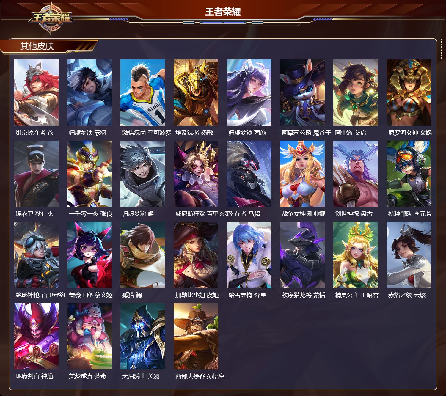 【61,其他皮肤】伊势巫女,大乔,前尘,金蝉,战争骑士,夏侯惇,圣殿之光,刘邦,潮流仙人,老夫子,棒球奇才,沈梦溪,龙域领主,铠,生化警戒,钟无艳,花见巫女,伽罗,未来旅行,孙膑,第七人偶,干将莫邪,灼热之刃,李信,熊喵少女,阿古朵,海之征途,孙策,木偶奇遇记,鲁班七号,帝国元帅,项羽,精灵王,后羿,绯红之刃,露娜,冰刃幻境,镜,碧珀绯影,暃,魇语军师,司马懿,英喵野望,刘禅,午夜歌剧院,元歌,启蛰,司空震,隐刃,兰陵王,霓裳曲,杨玉环,花间舞,公孙离,异域舞娘,貂蝉,街头旋风,裴擒虎,归虚梦演,鲁班大师,修竹墨客,上官婉儿,剑舞者,花木兰,范海辛,李白,维京掠夺者,苍,归虚梦演,蒙犽,激情绿茵,马可波罗,埃及法老,杨戬,归虚梦演,西施,阿摩司公爵,鬼谷子,画中游,桑启,尼罗河女神,女娲,锦衣卫,狄仁杰,一千零一夜,张良,归虚梦演,曜,威尼斯狂欢,百里玄策,幸存者,马超,战争女神,雅典娜,创世神祝,盘古,特种部队,李元芳,绝影神枪,百里守约,蔷薇王座,蔡文姬,孤猎,澜,加勒比小姐,虞姬,踏雪寻梅,弈星,秩序猎龙将,蒙恬,精灵公主,王昭君,赤焰之缨,云缨,地府判官,钟馗,美梦成真,梦奇,天启骑士,关羽,西部大镖客,孙悟空,