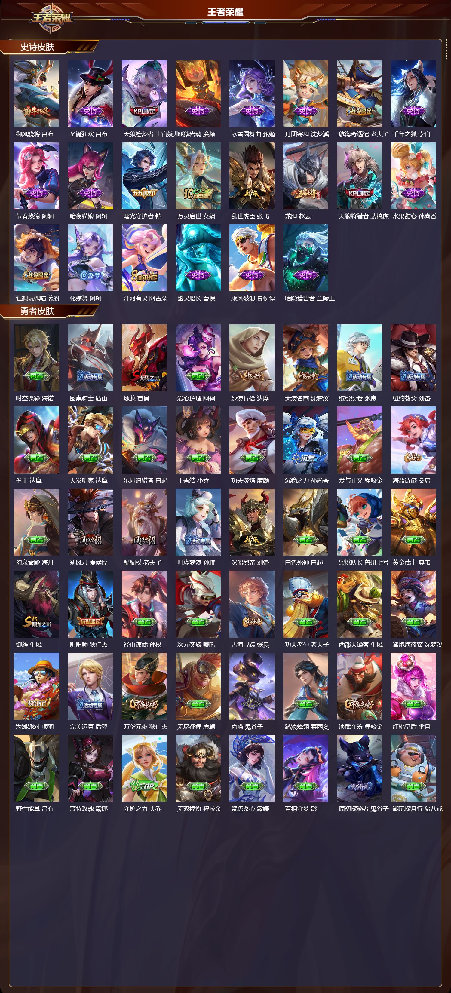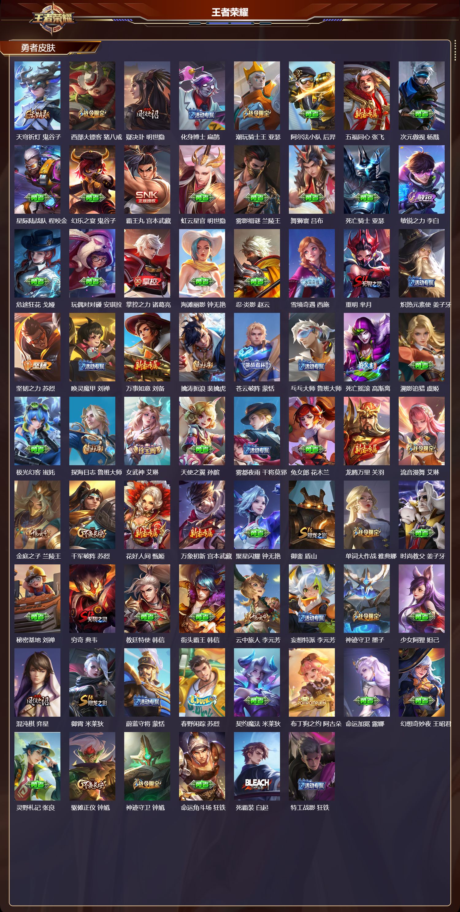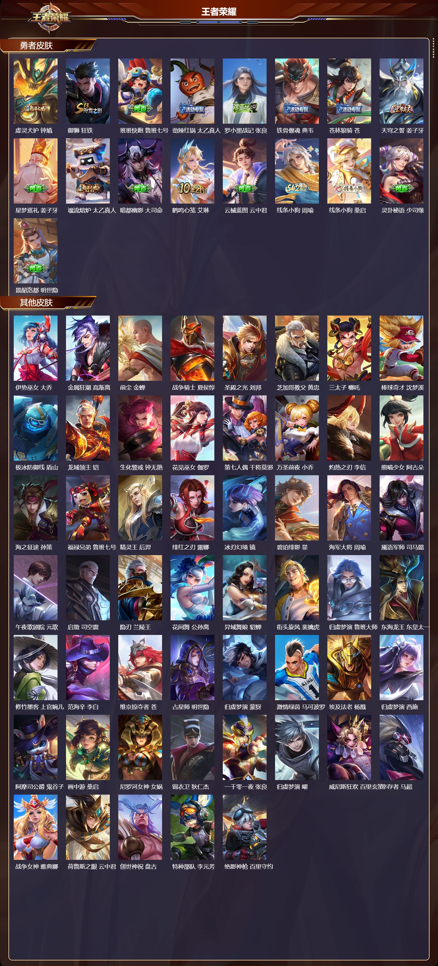 【135,勇者皮肤】时空谍影,海诺,圆桌骑士,盾山,烛龙,曹操,爱心护理,阿轲,沙漠行僧,达摩,大漠名商,沈梦溪,缤纷绘卷,张良,纽约教父,刘备,拳王,达摩,大发明家,达摩,乐园追猎者,白起,丁香结,小乔,功夫炙烤,廉颇,沉稳之力,孙尚香,爱与正义,程咬金,海盐诗旅,桑启,幻泉雾影,海月,朔风刀,夏侯惇,醍醐杖,老夫子,归虚梦演,孙膑,汉昭烈帝,刘备,白色死神,白起,黑桃队长,鲁班七号,黄金武士,典韦,御旌,牛魔,阴阳师,狄仁杰,径山谋武,孙权,次元突破,哪吒,古海寻踪,张良,功夫老勺,老夫子,西部大镖客,牛魔,鲨炮海盗猫,沈梦溪,海滩派对,项羽,完美运算,后羿,万华元夜,狄仁杰,无尽征程,廉颇,克喵,鬼谷子,踏浪烽翎,莱西奥,演武夺筹,程咬金,红桃皇后,芈月,野性能量,吕布,哥特玫瑰,露娜,守护之力,大乔,无双福将,程咬金,瓷语鉴心,露娜,百相守梦,影,原初探秘者,鬼谷子,潮玩探月行,猪八戒,天穹祈灯,鬼谷子,西部大镖客,猪八戒,疑决卦,明世隐,化身博士,扁鹊,潮玩骑士王,亚瑟,阿尔法小队,后羿,五福同心,张飞,次元傲视,杨戬,星际陆战队,程咬金,幻乐之宴,鬼谷子,霸王丸,宫本武藏,虹云星官,明世隐,雾影缉谜,兰陵王,舞狮寰,吕布,死亡骑士,亚瑟,敏锐之力,李白,危途狂花,戈娅,玩偶对对碰,安琪拉,掌控之力,诸葛亮,海滩丽影,钟无艳,忍·炎影,赵云,雪境奇遇,西施,重明,芈月,炽热元素使,姜子牙,坚韧之力,苏烈,唤灵魔甲,刘禅,万事如意,刘备,擒涛扼浪,裴擒虎,苍云破阵,蒙恬,乓乓大师,鲁班大师,死亡摇滚,高渐离,溯影追猎,虞姬,极光幻客,蚩奼,探海日志,鲁班大师,女武神,艾琳,天使之翼,孙膑,雾都夜雨,干将莫邪,兔女郎,花木兰,龙腾万里,关羽,流音漫舞,艾琳,金庭之子,兰陵王,千军破阵,苏烈,花好人间,甄姬,万象初新,宫本武藏,聚星闪耀,钟无艳,御銮,盾山,单词大作战,雅典娜,时尚教父,姜子牙,秘密基地,刘禅,穷奇,典韦,教廷特使,韩信,街头霸王,韩信,云中旅人,李元芳,妄想特派,李元芳,神迹守卫,墨子,少女阿狸,妲己,混沌棋,弈星,御霄,米莱狄,蔚蓝守将,蒙恬,春野闲踪,苏烈,契约魔法,米莱狄,布丁狗之约,阿古朵,命运加冕,露娜,幻想奇妙夜,王昭君,灵野札记,张良,驱傩正仪,钟馗,神迹守卫,钟馗,命运角斗场,狂铁,死霸装,白起,特工战影,狂铁,虚灵犬护,钟馗,御狮,狂铁,班班快跑,鲁班七号,劲辣红锅,太乙真人,罗小黑战记,张良,铁骨偃魂,典韦,苍林狼骑,苍,天穹之誓,姜子牙,星梦巡礼,姜子牙,谧流熔炉,太乙真人,暗都幽影,大司命,鹤鸣心笺,艾琳,云械蓝图,云中君,线条小狗,周瑜,线条小狗,桑启,灵卦秘语,少司缘,景韶洛都,明世隐,