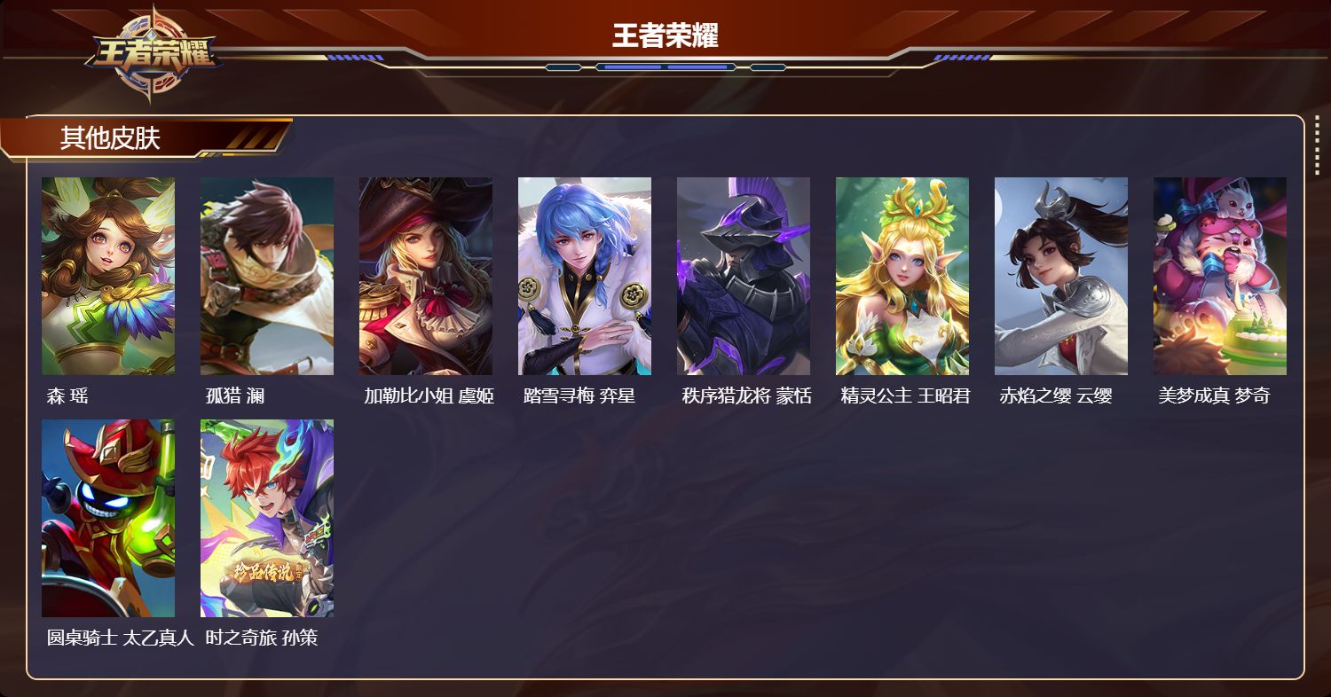【63,其他皮肤】伊势巫女,大乔,金属狂潮,高渐离,前尘,金蝉,战争骑士,夏侯惇,圣殿之光,刘邦,芝加哥教父,黄忠,三太子,哪吒,棒球奇才,沈梦溪,极冰防御线,盾山,龙域领主,铠,生化警戒,钟无艳,花见巫女,伽罗,第七人偶,干将莫邪,万圣前夜,小乔,灼热之刃,李信,熊喵少女,阿古朵,海之征途,孙策,福禄兄弟,鲁班七号,精灵王,后羿,绯红之刃,露娜,冰刃幻境,镜,碧珀绯影,暃,海军大将,周瑜,魇语军师,司马懿,午夜歌剧院,元歌,启蛰,司空震,隐刃,兰陵王,花间舞,公孙离,异域舞娘,貂蝉,街头旋风,裴擒虎,归虚梦演,鲁班大师,东海龙王,东皇太一,修竹墨客,上官婉儿,范海辛,李白,维京掠夺者,苍,占星师,明世隐,归虚梦演,蒙犽,激情绿茵,马可波罗,埃及法老,杨戬,归虚梦演,西施,阿摩司公爵,鬼谷子,画中游,桑启,尼罗河女神,女娲,锦衣卫,狄仁杰,一千零一夜,张良,归虚梦演,曜,威尼斯狂欢,百里玄策,幸存者,马超,战争女神,雅典娜,荷鲁斯之眼,云中君,创世神祝,盘古,特种部队,李元芳,绝影神枪,百里守约,森,瑶,孤猎,澜,加勒比小姐,虞姬,踏雪寻梅,弈星,秩序猎龙将,蒙恬,精灵公主,王昭君,赤焰之缨,云缨,美梦成真,梦奇,圆桌骑士,太乙真人,时之奇旅,孙策,