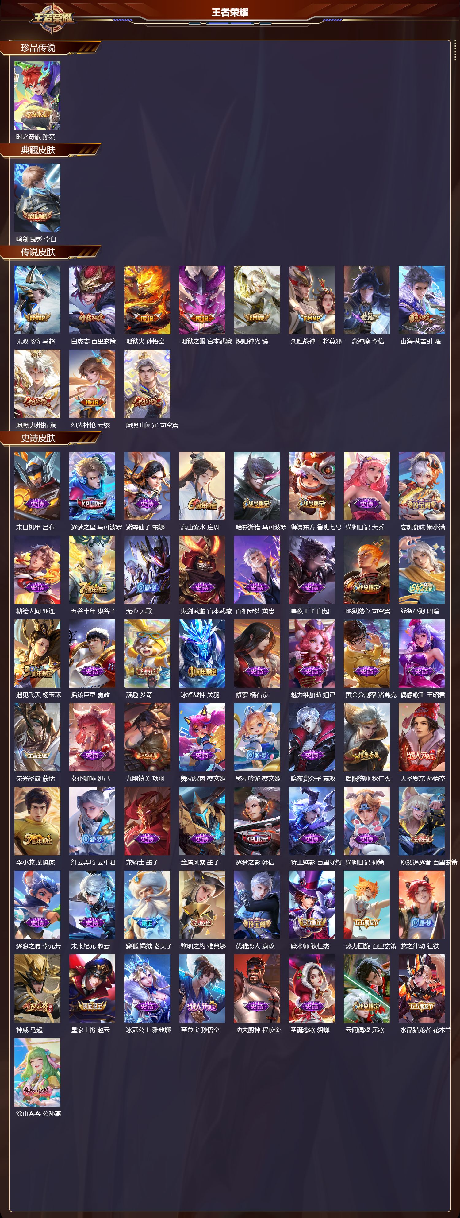 【79,史诗皮肤】末日机甲,吕布,逐梦之星,马可波罗,紫霞仙子,露娜,高山流水,庄周,暗影游猎,马可波罗,狮舞东方,鲁班七号,猫狗日记,大乔,妄想食味,姬小满,糖绘人间,亚连,五谷丰年,鬼谷子,无心,元歌,鬼剑武藏,宫本武藏,百相守梦,黄忠,星夜王子,白起,地狱燃心,司空震,线条小狗,周瑜,遇见飞天,杨玉环,摇滚巨星,嬴政,顽趣,梦奇,冰锋战神,关羽,修罗,橘右京,魅力维加斯,妲己,黄金分割率,诸葛亮,偶像歌手,王昭君,荣光圣徽,蒙恬,女仆咖啡,妲己,九幽镇关,项羽,舞动绿茵,蔡文姬,繁星吟游,蔡文姬,暗夜贵公子,嬴政,鹰眼统帅,狄仁杰,大圣娶亲,孙悟空,李小龙,裴擒虎,纤云弄巧,云中君,龙骑士,墨子,金属风暴,墨子,逐梦之影,韩信,特工魅影,百里守约,猫狗日记,孙策,原初追逐者,百里玄策,逐浪之夏,李元芳,未来纪元,赵云,藏狐·褐绒,老夫子,黎明之约,雅典娜,优雅恋人,嬴政,魔术师,狄仁杰,热力回旋,百里玄策,龙之律动,狂铁,神威,马超,皇家上将,赵云,冰冠公主,雅典娜,至尊宝,孙悟空,功夫厨神,程咬金,圣诞恋歌,貂蝉,云间偶戏,元歌,水晶猎龙者,花木兰,涂山容容,公孙离,御风骁将,吕布,圣诞狂欢,吕布,天狼绘梦者,上官婉儿,地狱岩魂,廉颇,冰雪圆舞曲,甄姬,月团寄思,沈梦溪,航海奇遇记,老夫子,千年之狐,李白,节奏热浪,阿轲,暗夜猫娘,阿轲,曙光守护者,铠,万灵启世,女娲,乱世虎臣,张飞,龙胆,赵云,天狼狩猎者,裴擒虎,水果甜心,孙尚香,狂想玩偶喵,蒙犽,化蝶舞,阿轲,江河有灵,阿古朵,幽灵船长,曹操,乘风破浪,夏侯惇,暗隐猎兽者,兰陵王,