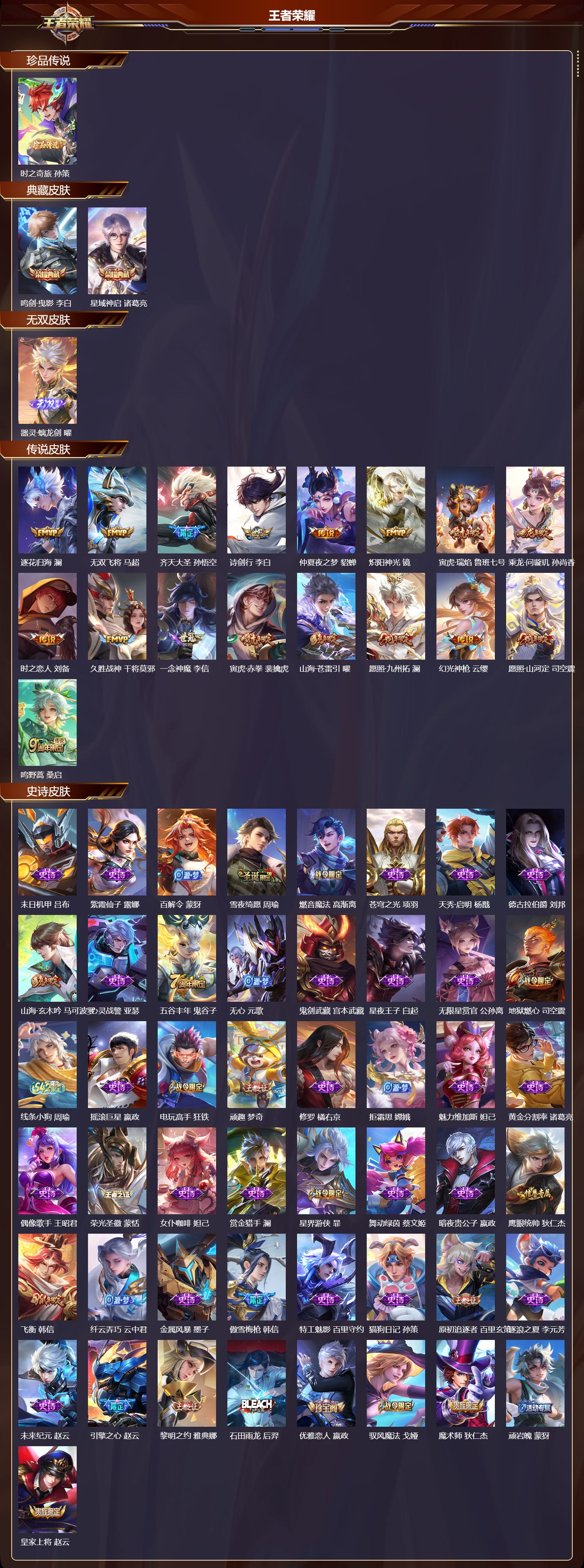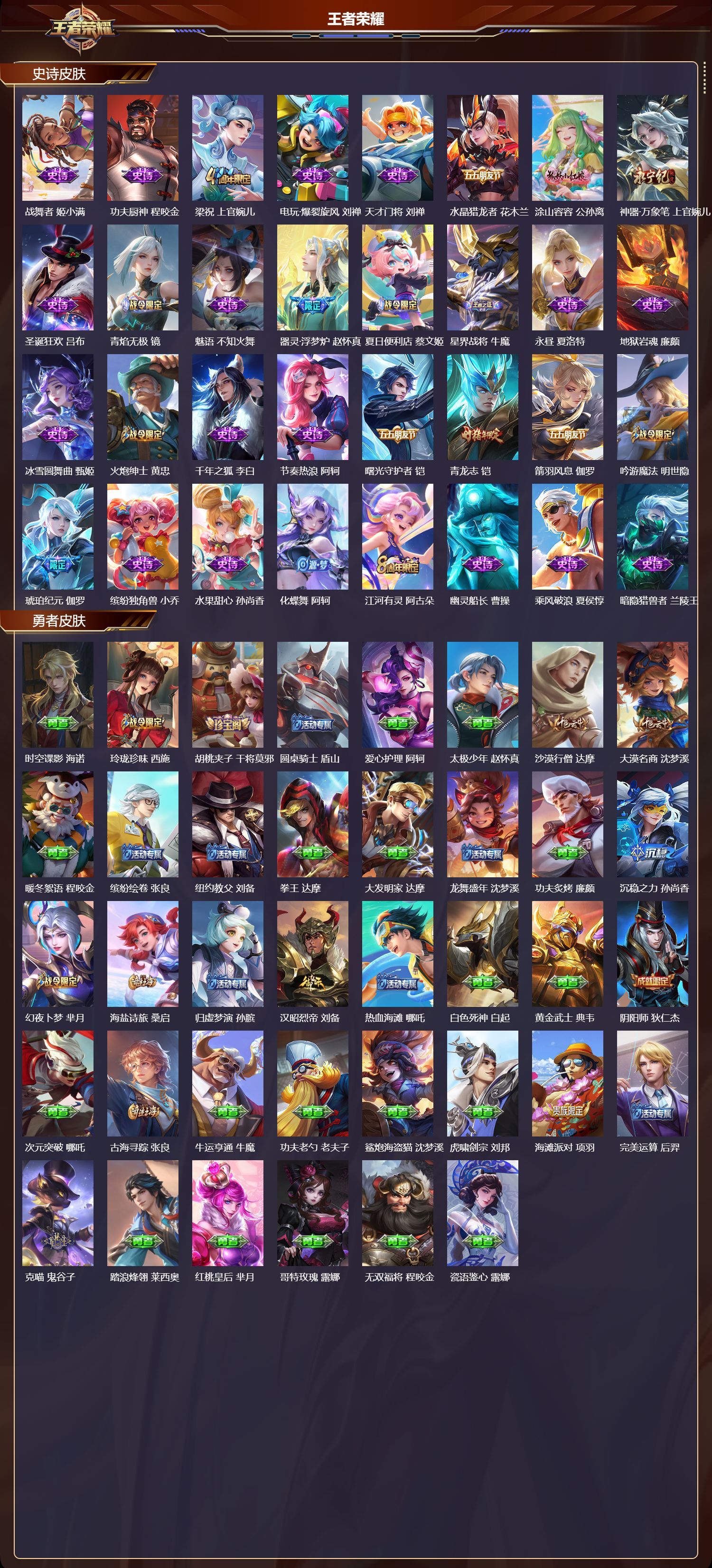 【81,史诗皮肤】末日机甲,吕布,紫霞仙子,露娜,百解令,蒙犽,雪夜绮愿,周瑜,燃音魔法,高渐离,苍穹之光,项羽,天秀·启明,杨戬,德古拉伯爵,刘邦,山海·玄木吟,马可波罗,心灵战警,亚瑟,五谷丰年,鬼谷子,无心,元歌,鬼剑武藏,宫本武藏,星夜王子,白起,无限星赏官,公孙离,地狱燃心,司空震,线条小狗,周瑜,摇滚巨星,嬴政,电玩高手,狂铁,顽趣,梦奇,修罗,橘右京,拒霜思,嫦娥,魅力维加斯,妲己,黄金分割率,诸葛亮,偶像歌手,王昭君,荣光圣徽,蒙恬,女仆咖啡,妲己,赏金猎手,澜,星界游侠,暃,舞动绿茵,蔡文姬,暗夜贵公子,嬴政,鹰眼统帅,狄仁杰,飞衡,韩信,纤云弄巧,云中君,金属风暴,墨子,傲雪梅枪,韩信,特工魅影,百里守约,猫狗日记,孙策,原初追逐者,百里玄策,逐浪之夏,李元芳,未来纪元,赵云,引擎之心,赵云,黎明之约,雅典娜,石田雨龙,后羿,优雅恋人,嬴政,驭风魔法,戈娅,魔术师,狄仁杰,顽岩魄,蒙犽,皇家上将,赵云,战舞者,姬小满,功夫厨神,程咬金,梁祝,上官婉儿,电玩·爆裂旋风,刘禅,天才门将,刘禅,水晶猎龙者,花木兰,涂山容容,公孙离,神器·万象笔,上官婉儿,圣诞狂欢,吕布,青焰无极,镜,魅语,不知火舞,器灵·浮梦炉,赵怀真,夏日便利店,蔡文姬,星界战将,牛魔,永昼,夏洛特,地狱岩魂,廉颇,冰雪圆舞曲,甄姬,火炮绅士,黄忠,千年之狐,李白,节奏热浪,阿轲,曙光守护者,铠,青龙志,铠,箭羽风息,伽罗,吟游魔法,明世隐,琥珀纪元,伽罗,缤纷独角兽,小乔,水果甜心,孙尚香,化蝶舞,阿轲,江河有灵,阿古朵,幽灵船长,曹操,乘风破浪,夏侯惇,暗隐猎兽者,兰陵王,