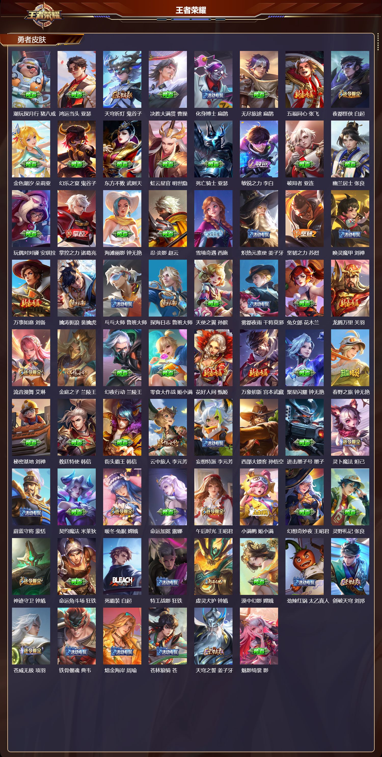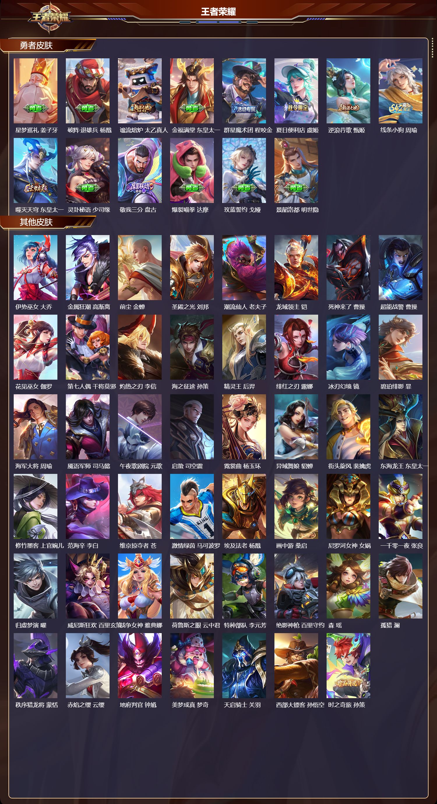 【122,勇者皮肤】时空谍影,海诺,玲珑珍味,西施,胡桃夹子,干将莫邪,圆桌骑士,盾山,爱心护理,阿轲,太极少年,赵怀真,沙漠行僧,达摩,大漠名商,沈梦溪,暖冬絮语,程咬金,缤纷绘卷,张良,纽约教父,刘备,拳王,达摩,大发明家,达摩,龙舞盛年,沈梦溪,功夫炙烤,廉颇,沉稳之力,孙尚香,幻夜卜梦,芈月,海盐诗旅,桑启,归虚梦演,孙膑,汉昭烈帝,刘备,热血海滩,哪吒,白色死神,白起,黄金武士,典韦,阴阳师,狄仁杰,次元突破,哪吒,古海寻踪,张良,牛运亨通,牛魔,功夫老勺,老夫子,鲨炮海盗猫,沈梦溪,虎啸剑宗,刘邦,海滩派对,项羽,完美运算,后羿,克喵,鬼谷子,踏浪烽翎,莱西奥,红桃皇后,芈月,哥特玫瑰,露娜,无双福将,程咬金,瓷语鉴心,露娜,潮玩探月行,猪八戒,鸿运当头,亚瑟,天穹祈灯,鬼谷子,决胜大满贯,曹操,化身博士,扁鹊,无尽旅途,扁鹊,五福同心,张飞,夜都怪侠,白起,金色潮汐,朵莉亚,幻乐之宴,鬼谷子,东方不败,武则天,虹云星官,明世隐,死亡骑士,亚瑟,敏锐之力,李白,破局者,亚连,幽兰居士,张良,玩偶对对碰,安琪拉,掌控之力,诸葛亮,海滩丽影,钟无艳,忍·炎影,赵云,雪境奇遇,西施,炽热元素使,姜子牙,坚韧之力,苏烈,唤灵魔甲,刘禅,万事如意,刘备,擒涛扼浪,裴擒虎,乓乓大师,鲁班大师,探海日志,鲁班大师,天使之翼,孙膑,雾都夜雨,干将莫邪,兔女郎,花木兰,龙腾万里,关羽,流音漫舞,艾琳,金庭之子,兰陵王,幻夜行动,兰陵王,零食大作战,姬小满,花好人间,甄姬,万象初新,宫本武藏,聚星闪耀,钟无艳,春野之旅,钟无艳,秘密基地,刘禅,教廷特使,韩信,街头霸王,韩信,云中旅人,李元芳,妄想特派,李元芳,西部大镖客,孙悟空,进击墨子号,墨子,灵卜魔法,妲己,蔚蓝守将,蒙恬,契约魔法,米莱狄,暖冬·兔眠,嫦娥,命运加冕,露娜,午后时光,王昭君,小满鸭,姬小满,幻想奇妙夜,王昭君,灵野札记,张良,神迹守卫,钟馗,命运角斗场,狂铁,死霸装,白起,特工战影,狂铁,虚灵犬护,钟馗,漠中幻影,嫦娥,劲辣红锅,太乙真人,剑破天穹,刘邦,苍威无极,项羽,铁骨偃魂,典韦,熔金海岸,周瑜,苍林狼骑,苍,天穹之誓,姜子牙,魅影绮裳,影,星梦巡礼,姜子牙,破阵·退雄兵,杨戬,谧流熔炉,太乙真人,金福满堂,东皇太一,群星魔术团,程咬金,夏日便利店,虞姬,逆浪荇歌,甄姬,线条小狗,周瑜,噬灭天穹,东皇太一,灵卦秘语,少司缘,敬我三分,盘古,爆裂喵拳,达摩,玫蓝誓约,戈娅,景韶洛都,明世隐,