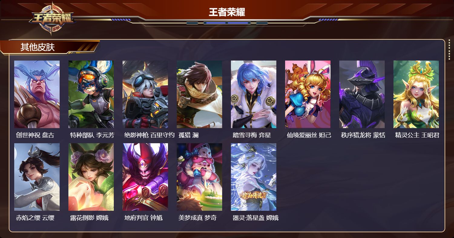【61,其他皮肤】沧流箭,伽罗,伊势巫女,大乔,前尘,金蝉,战争骑士,夏侯惇,圣殿之光,刘邦,芝加哥教父,黄忠,潮流仙人,老夫子,棒球奇才,沈梦溪,极冰防御线,盾山,龙域领主,铠,超能战警,曹操,第七人偶,干将莫邪,灼热之刃,李信,熊喵少女,阿古朵,木偶奇遇记,鲁班七号,福禄兄弟,鲁班七号,帝国元帅,项羽,绯红之刃,露娜,冰刃幻境,镜,碧珀绯影,暃,海军大将,周瑜,魇语军师,司马懿,英喵野望,刘禅,午夜歌剧院,元歌,启蛰,司空震,隐刃,兰陵王,霓裳曲,杨玉环,花间舞,公孙离,异域舞娘,貂蝉,归虚梦演,鲁班大师,东海龙王,东皇太一,修竹墨客,上官婉儿,剑舞者,花木兰,维京掠夺者,苍,激情绿茵,马可波罗,埃及法老,杨戬,归虚梦演,西施,画中游,桑启,年年有余,猪八戒,尼罗河女神,女娲,锦衣卫,狄仁杰,一千零一夜,张良,归虚梦演,曜,大耳狗之梦,瑶,威尼斯狂欢,百里玄策,幸存者,马超,战争女神,雅典娜,荷鲁斯之眼,云中君,创世神祝,盘古,特种部队,李元芳,绝影神枪,百里守约,孤猎,澜,踏雪寻梅,弈星,仙境爱丽丝,妲己,秩序猎龙将,蒙恬,精灵公主,王昭君,赤焰之缨,云缨,露花倒影,嫦娥,地府判官,钟馗,美梦成真,梦奇,器灵·落星盏,嫦娥,