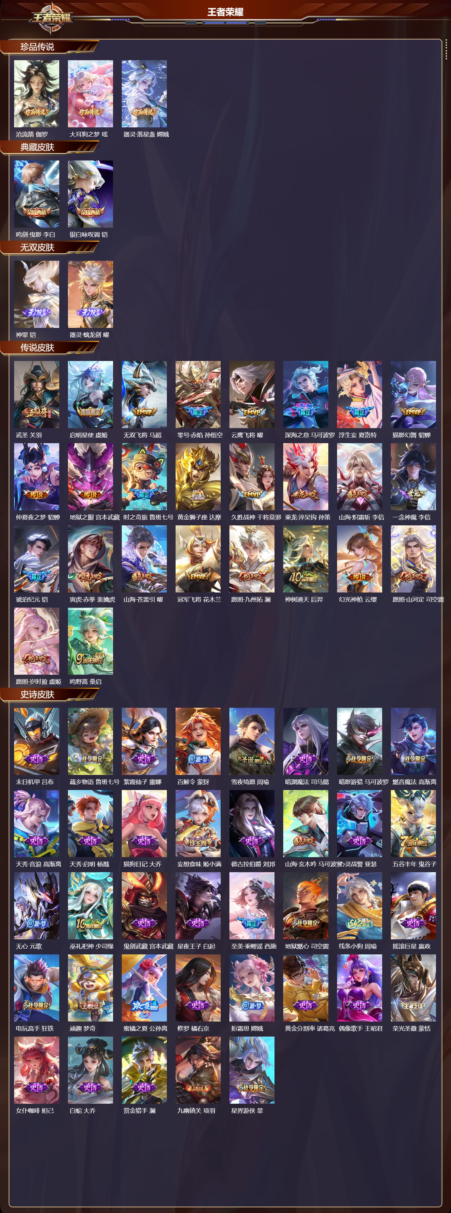 【116,史诗皮肤】末日机甲,吕布,蔬乡物语,鲁班七号,紫霞仙子,露娜,百解令,蒙犽,雪夜绮愿,周瑜,暗渊魔法,司马懿,暗影游猎,马可波罗,燃音魔法,高渐离,天秀·音浪,高渐离,天秀·启明,杨戬,猫狗日记,大乔,妄想食味,姬小满,德古拉伯爵,刘邦,山海·玄木吟,马可波罗,心灵战警,亚瑟,五谷丰年,鬼谷子,无心,元歌,巫礼祀神,少司缘,鬼剑武藏,宫本武藏,星夜王子,白起,至美·乘鲤谣,西施,地狱燃心,司空震,线条小狗,周瑜,摇滚巨星,嬴政,电玩高手,狂铁,顽趣,梦奇,蜜橘之夏,公孙离,修罗,橘右京,拒霜思,嫦娥,黄金分割率,诸葛亮,偶像歌手,王昭君,荣光圣徽,蒙恬,女仆咖啡,妲己,白蛇,大乔,赏金猎手,澜,九幽镇关,项羽,星界游侠,暃,晚萤,娜可露露,遇见神鹿,瑶,舞动绿茵,蔡文姬,暗夜贵公子,嬴政,鹰眼统帅,狄仁杰,飞衡,韩信,孙行者,孙悟空,光弋星穹,莱西奥,纤云弄巧,云中君,如梦令,后羿,龙骑士,墨子,金属风暴,墨子,傲雪梅枪,韩信,特工魅影,百里守约,猫狗日记,孙策,原初追逐者,百里玄策,逐浪之夏,李元芳,奇幻香踪,扁鹊,未来纪元,赵云,引擎之心,赵云,灵蛊蚀心,扁鹊,朱雀志,百里守约,黎明之约,雅典娜,优雅恋人,嬴政,鸭鸭历险记,刘禅,驭风魔法,戈娅,魔术师,狄仁杰,龙之律动,狂铁,神威,马超,顽岩魄,蒙犽,皇家上将,赵云,冰冠公主,雅典娜,至尊宝,孙悟空,功夫厨神,程咬金,梁祝,上官婉儿,电玩·爆裂旋风,刘禅,天才门将,刘禅,圣诞恋歌,貂蝉,水晶猎龙者,花木兰,涂山容容,公孙离,破空之剑,亚连,御风骁将,吕布,圣诞狂欢,吕布,魅语,不知火舞,器灵·浮梦炉,赵怀真,顽趣,阿古朵,罗小黑战记,百里玄策,岱宗,典韦,星界战将,牛魔,永昼,夏洛特,地狱岩魂,廉颇,茶境仙,孙膑,蔷薇恋人,孙尚香,冰雪圆舞曲,甄姬,火炮绅士,黄忠,默契交锋,花木兰,千年之狐,李白,节奏热浪,阿轲,超时空战士,钟无艳,游园惊梦,甄姬,梦圆繁星,盾山,曙光守护者,铠,心灵骇客,安琪拉,寅虎·御盾,廉颇,箭羽风息,伽罗,乱世虎臣,张飞,吟游魔法,明世隐,琥珀纪元,伽罗,绅士熊喵,刘禅,缤纷独角兽,小乔,线条小狗,小乔,蓝屏警告,典韦,水果甜心,孙尚香,狂想玩偶喵,蒙犽,化蝶舞,阿轲,江河有灵,阿古朵,幽灵船长,曹操,乘风破浪,夏侯惇,暗隐猎兽者,兰陵王,