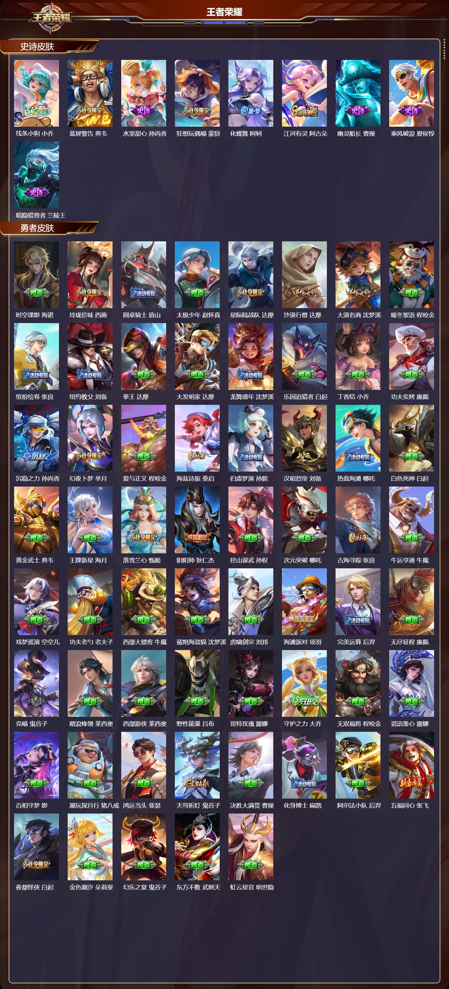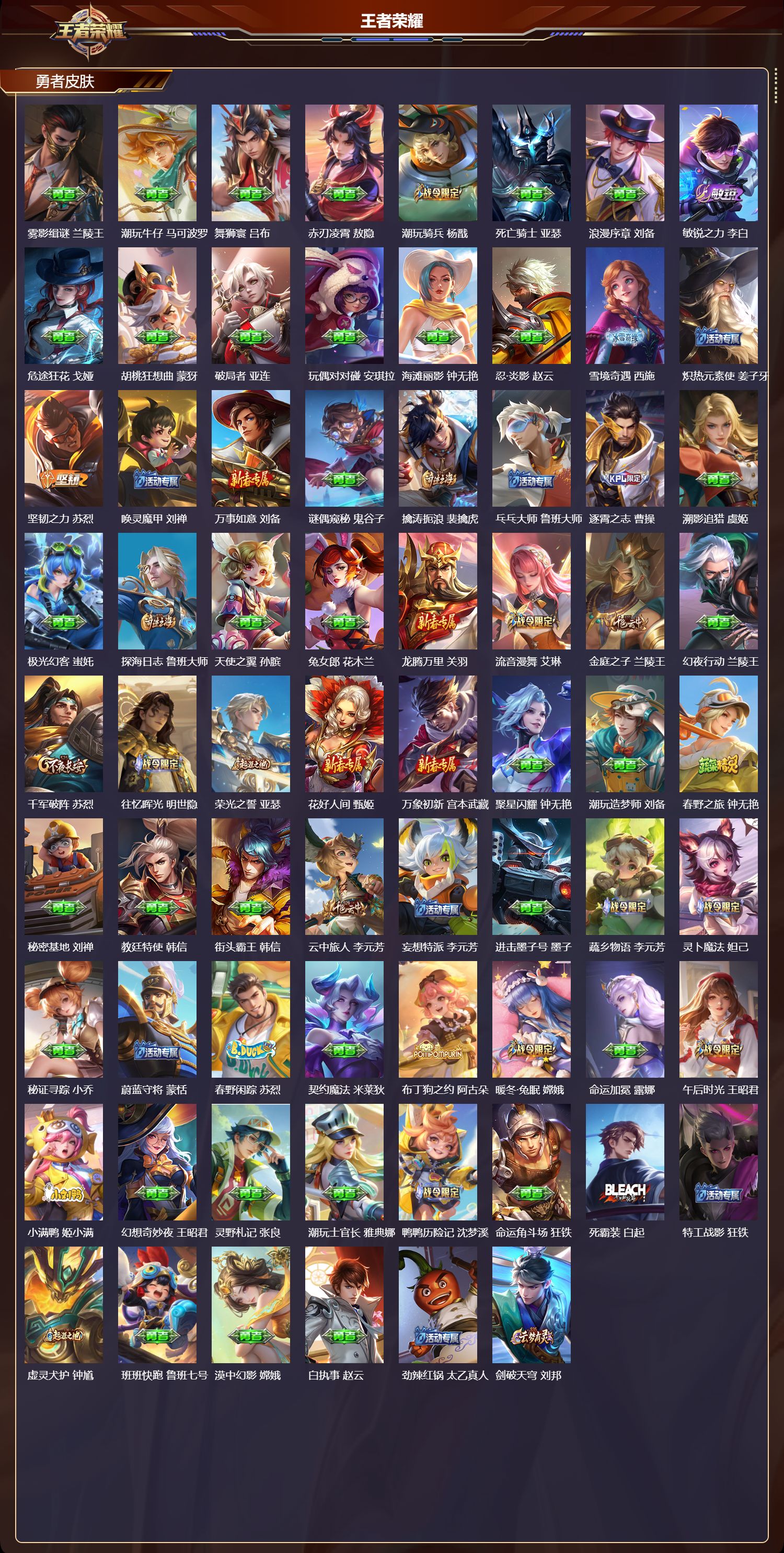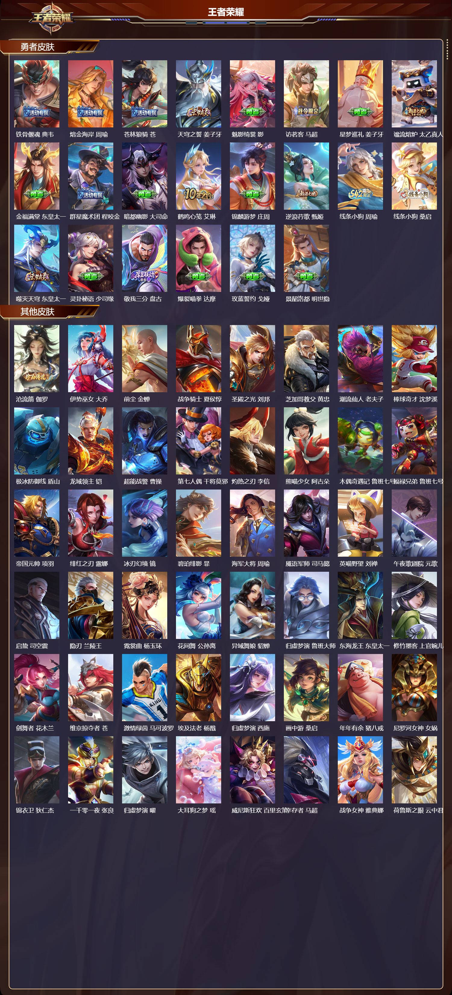 【153,勇者皮肤】时空谍影,海诺,玲珑珍味,西施,圆桌骑士,盾山,太极少年,赵怀真,星际陆战队,达摩,沙漠行僧,达摩,大漠名商,沈梦溪,暖冬絮语,程咬金,缤纷绘卷,张良,纽约教父,刘备,拳王,达摩,大发明家,达摩,龙舞盛年,沈梦溪,乐园追猎者,白起,丁香结,小乔,功夫炙烤,廉颇,沉稳之力,孙尚香,幻夜卜梦,芈月,爱与正义,程咬金,海盐诗旅,桑启,归虚梦演,孙膑,汉昭烈帝,刘备,热血海滩,哪吒,白色死神,白起,黄金武士,典韦,王牌新星,海月,落雪兰心,甄姬,阴阳师,狄仁杰,径山谋武,孙权,次元突破,哪吒,古海寻踪,张良,牛运亨通,牛魔,戏梦巡演,空空儿,功夫老勺,老夫子,西部大镖客,牛魔,鲨炮海盗猫,沈梦溪,虎啸剑宗,刘邦,海滩派对,项羽,完美运算,后羿,无尽征程,廉颇,克喵,鬼谷子,踏浪烽翎,莱西奥,西部游侠,莱西奥,野性能量,吕布,哥特玫瑰,露娜,守护之力,大乔,无双福将,程咬金,瓷语鉴心,露娜,百相守梦,影,潮玩探月行,猪八戒,鸿运当头,亚瑟,天穹祈灯,鬼谷子,决胜大满贯,曹操,化身博士,扁鹊,阿尔法小队,后羿,五福同心,张飞,夜都怪侠,白起,金色潮汐,朵莉亚,幻乐之宴,鬼谷子,东方不败,武则天,虹云星官,明世隐,雾影缉谜,兰陵王,潮玩牛仔,马可波罗,舞狮寰,吕布,赤刃凌霄,敖隐,潮玩骑兵,杨戬,死亡骑士,亚瑟,浪漫序章,刘备,敏锐之力,李白,危途狂花,戈娅,胡桃狂想曲,蒙犽,破局者,亚连,玩偶对对碰,安琪拉,海滩丽影,钟无艳,忍·炎影,赵云,雪境奇遇,西施,炽热元素使,姜子牙,坚韧之力,苏烈,唤灵魔甲,刘禅,万事如意,刘备,谜偶窥秘,鬼谷子,擒涛扼浪,裴擒虎,乓乓大师,鲁班大师,逐霄之志,曹操,溯影追猎,虞姬,极光幻客,蚩奼,探海日志,鲁班大师,天使之翼,孙膑,兔女郎,花木兰,龙腾万里,关羽,流音漫舞,艾琳,金庭之子,兰陵王,幻夜行动,兰陵王,千军破阵,苏烈,往忆晖光,明世隐,荣光之誓,亚瑟,花好人间,甄姬,万象初新,宫本武藏,聚星闪耀,钟无艳,潮玩造梦师,刘备,春野之旅,钟无艳,秘密基地,刘禅,教廷特使,韩信,街头霸王,韩信,云中旅人,李元芳,妄想特派,李元芳,进击墨子号,墨子,蔬乡物语,李元芳,灵卜魔法,妲己,秘证寻踪,小乔,蔚蓝守将,蒙恬,春野闲踪,苏烈,契约魔法,米莱狄,布丁狗之约,阿古朵,暖冬·兔眠,嫦娥,命运加冕,露娜,午后时光,王昭君,小满鸭,姬小满,幻想奇妙夜,王昭君,灵野札记,张良,潮玩士官长,雅典娜,鸭鸭历险记,沈梦溪,命运角斗场,狂铁,死霸装,白起,特工战影,狂铁,虚灵犬护,钟馗,班班快跑,鲁班七号,漠中幻影,嫦娥,白执事,赵云,劲辣红锅,太乙真人,剑破天穹,刘邦,铁骨偃魂,典韦,熔金海岸,周瑜,苍林狼骑,苍,天穹之誓,姜子牙,魅影绮裳,影,访茗客,马超,星梦巡礼,姜子牙,谧流熔炉,太乙真人,金福满堂,东皇太一,群星魔术团,程咬金,暗都幽影,大司命,鹤鸣心笺,艾琳,锦麟游梦,庄周,逆浪荇歌,甄姬,线条小狗,周瑜,线条小狗,桑启,噬灭天穹,东皇太一,灵卦秘语,少司缘,敬我三分,盘古,爆裂喵拳,达摩,玫蓝誓约,戈娅,景韶洛都,明世隐,