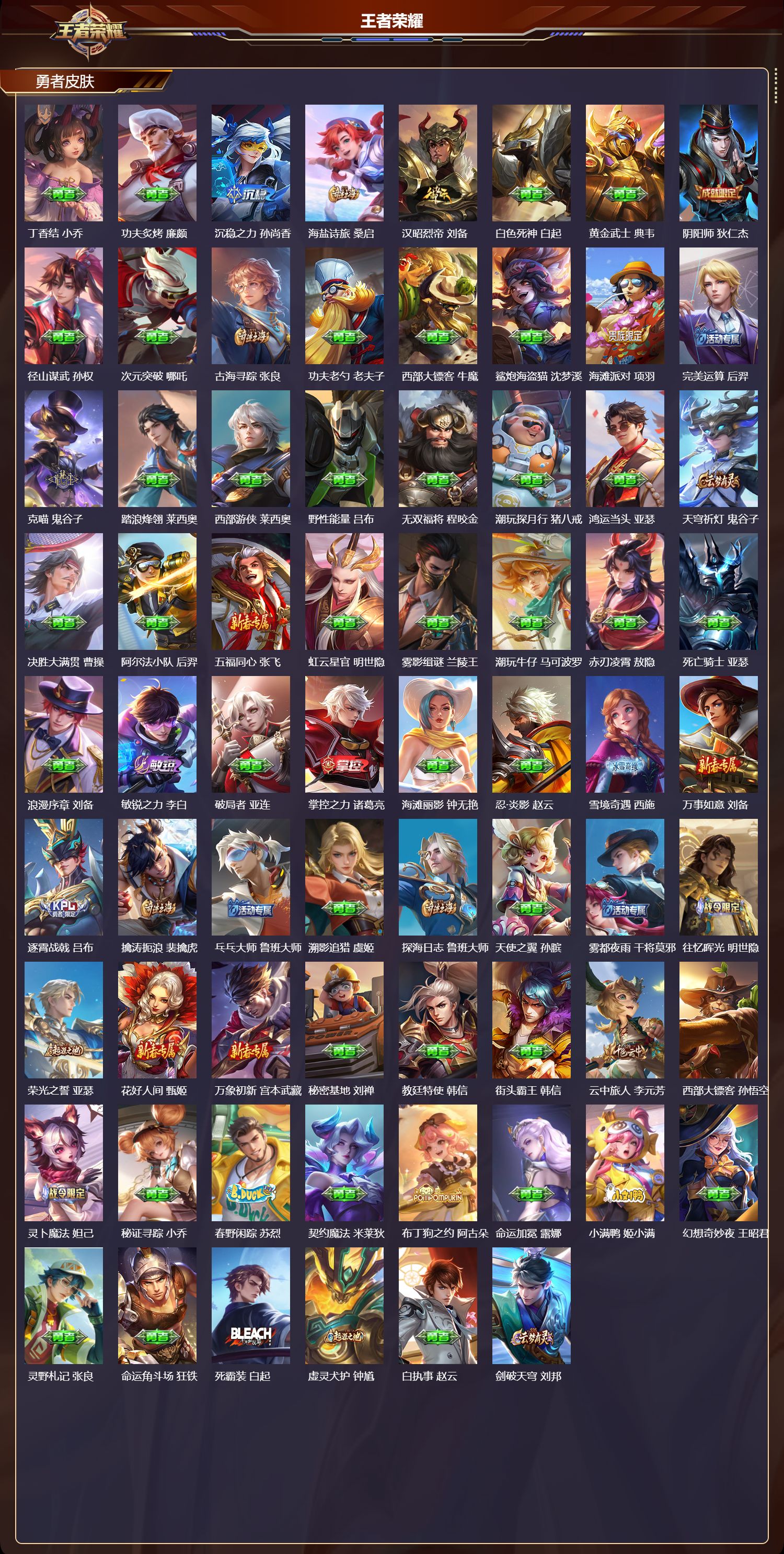 【94,勇者皮肤】时空谍影,海诺,胡桃夹子,干将莫邪,大漠名商,沈梦溪,拳王,达摩,龙舞盛年,沈梦溪,丁香结,小乔,功夫炙烤,廉颇,沉稳之力,孙尚香,海盐诗旅,桑启,汉昭烈帝,刘备,白色死神,白起,黄金武士,典韦,阴阳师,狄仁杰,径山谋武,孙权,次元突破,哪吒,古海寻踪,张良,功夫老勺,老夫子,西部大镖客,牛魔,鲨炮海盗猫,沈梦溪,海滩派对,项羽,完美运算,后羿,克喵,鬼谷子,踏浪烽翎,莱西奥,西部游侠,莱西奥,野性能量,吕布,无双福将,程咬金,潮玩探月行,猪八戒,鸿运当头,亚瑟,天穹祈灯,鬼谷子,决胜大满贯,曹操,阿尔法小队,后羿,五福同心,张飞,虹云星官,明世隐,雾影缉谜,兰陵王,潮玩牛仔,马可波罗,赤刃凌霄,敖隐,死亡骑士,亚瑟,浪漫序章,刘备,敏锐之力,李白,破局者,亚连,掌控之力,诸葛亮,海滩丽影,钟无艳,忍·炎影,赵云,雪境奇遇,西施,万事如意,刘备,逐霄战戟,吕布,擒涛扼浪,裴擒虎,乓乓大师,鲁班大师,溯影追猎,虞姬,探海日志,鲁班大师,天使之翼,孙膑,雾都夜雨,干将莫邪,往忆晖光,明世隐,荣光之誓,亚瑟,花好人间,甄姬,万象初新,宫本武藏,秘密基地,刘禅,教廷特使,韩信,街头霸王,韩信,云中旅人,李元芳,西部大镖客,孙悟空,灵卜魔法,妲己,秘证寻踪,小乔,春野闲踪,苏烈,契约魔法,米莱狄,布丁狗之约,阿古朵,命运加冕,露娜,小满鸭,姬小满,幻想奇妙夜,王昭君,灵野札记,张良,命运角斗场,狂铁,死霸装,白起,虚灵犬护,钟馗,白执事,赵云,剑破天穹,刘邦,异域游侠,刘备,铁骨偃魂,典韦,熔金海岸,周瑜,苍林狼骑,苍,天穹之誓,姜子牙,长夏之忆,貂蝉,星梦巡礼,姜子牙,谧流熔炉,太乙真人,金福满堂,东皇太一,群星魔术团,程咬金,暗都幽影,大司命,夏日便利店,虞姬,鹤鸣心笺,艾琳,锦麟游梦,庄周,逆浪荇歌,甄姬,线条小狗,周瑜,噬灭天穹,东皇太一,敬我三分,盘古,玫蓝誓约,戈娅,