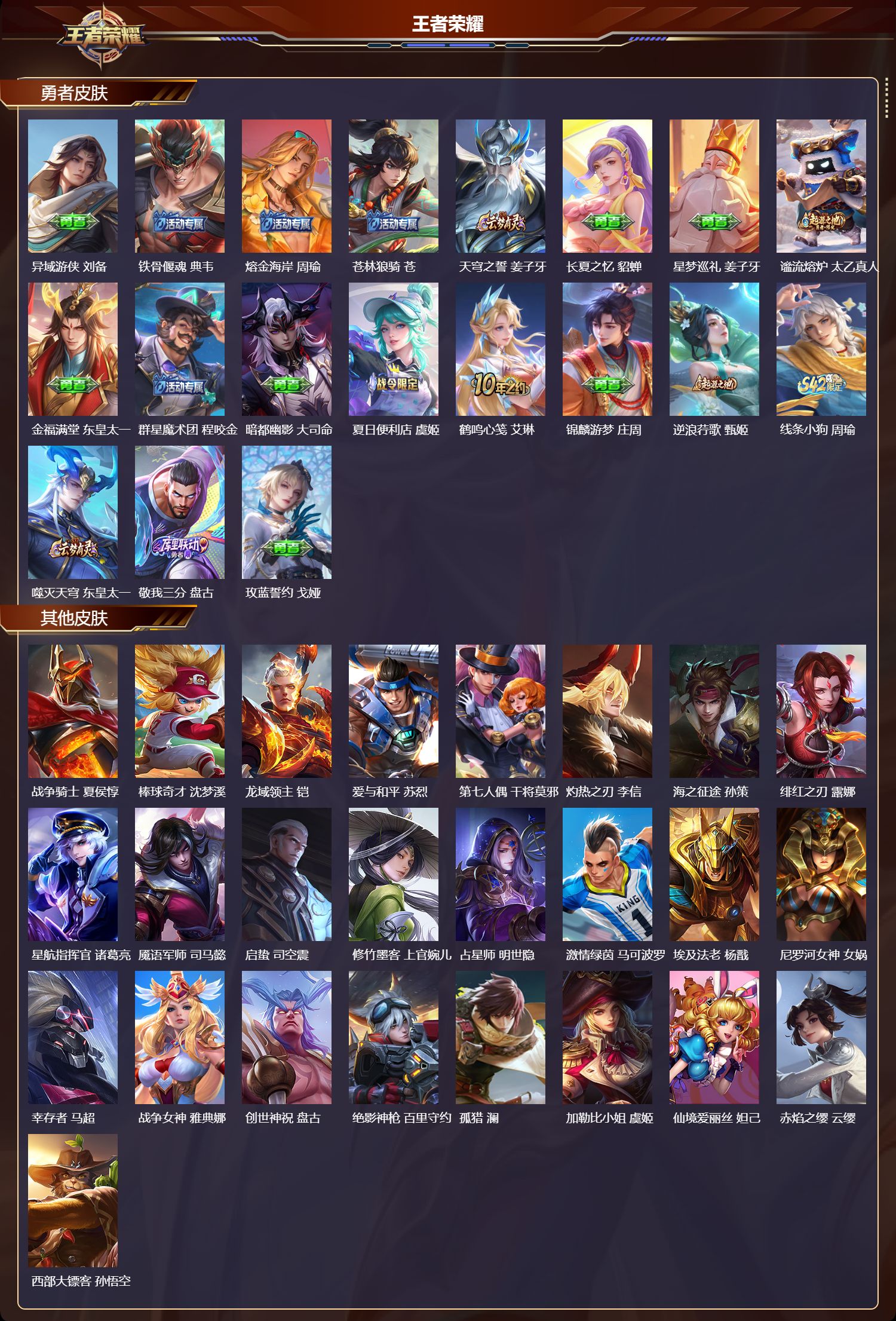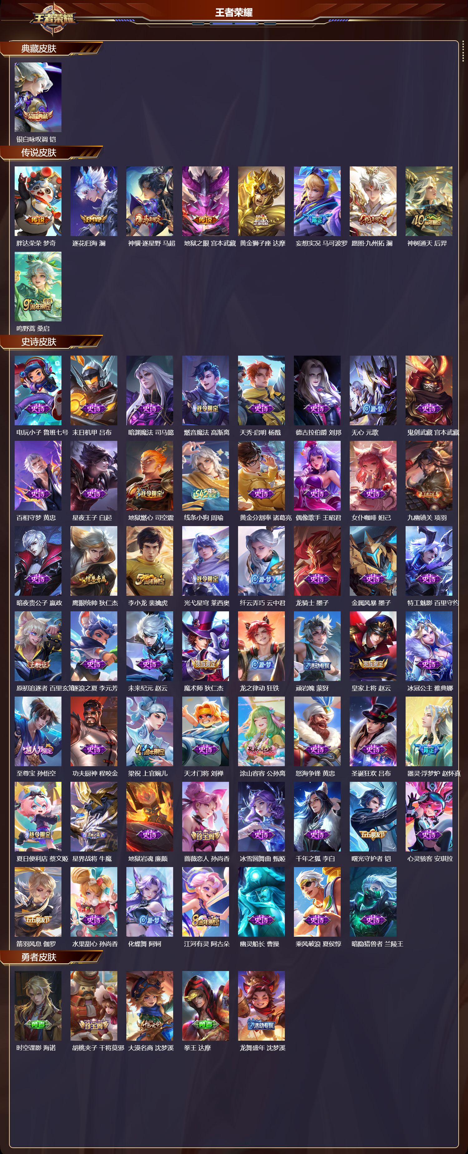 【55,史诗皮肤】电玩小子,鲁班七号,末日机甲,吕布,暗渊魔法,司马懿,燃音魔法,高渐离,天秀·启明,杨戬,德古拉伯爵,刘邦,无心,元歌,鬼剑武藏,宫本武藏,百相守梦,黄忠,星夜王子,白起,地狱燃心,司空震,线条小狗,周瑜,黄金分割率,诸葛亮,偶像歌手,王昭君,女仆咖啡,妲己,九幽镇关,项羽,暗夜贵公子,嬴政,鹰眼统帅,狄仁杰,李小龙,裴擒虎,光弋星穹,莱西奥,纤云弄巧,云中君,龙骑士,墨子,金属风暴,墨子,特工魅影,百里守约,原初追逐者,百里玄策,逐浪之夏,李元芳,未来纪元,赵云,魔术师,狄仁杰,龙之律动,狂铁,顽岩魄,蒙犽,皇家上将,赵云,冰冠公主,雅典娜,至尊宝,孙悟空,功夫厨神,程咬金,梁祝,上官婉儿,天才门将,刘禅,涂山容容,公孙离,怒海争锋,黄忠,圣诞狂欢,吕布,器灵·浮梦炉,赵怀真,夏日便利店,蔡文姬,星界战将,牛魔,地狱岩魂,廉颇,蔷薇恋人,孙尚香,冰雪圆舞曲,甄姬,千年之狐,李白,曙光守护者,铠,心灵骇客,安琪拉,箭羽风息,伽罗,水果甜心,孙尚香,化蝶舞,阿轲,江河有灵,阿古朵,幽灵船长,曹操,乘风破浪,夏侯惇,暗隐猎兽者,兰陵王,