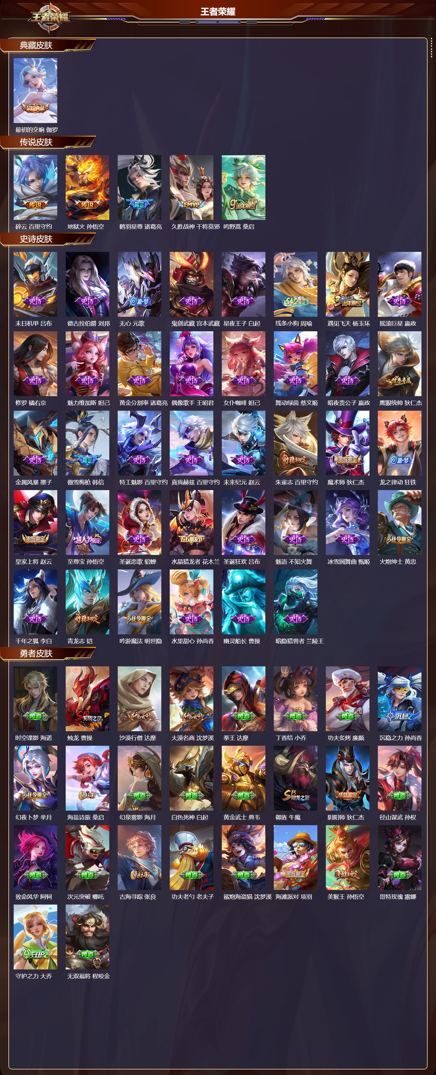 【94,勇者皮肤】时空谍影,海诺,烛龙,曹操,沙漠行僧,达摩,大漠名商,沈梦溪,拳王,达摩,丁香结,小乔,功夫炙烤,廉颇,沉稳之力,孙尚香,幻夜卜梦,芈月,海盐诗旅,桑启,幻泉雾影,海月,白色死神,白起,黄金武士,典韦,御旌,牛魔,阴阳师,狄仁杰,径山谋武,孙权,致命风华,阿轲,次元突破,哪吒,古海寻踪,张良,功夫老勺,老夫子,鲨炮海盗猫,沈梦溪,海滩派对,项羽,美猴王,孙悟空,哥特玫瑰,露娜,守护之力,大乔,无双福将,程咬金,瓷语鉴心,露娜,百相守梦,影,潮玩探月行,猪八戒,鸿运当头,亚瑟,天穹祈灯,鬼谷子,疑决卦,明世隐,如懿,安琪拉,化身博士,扁鹊,阿尔法小队,后羿,无尽旅途,扁鹊,五福同心,张飞,夜都怪侠,白起,幻乐之宴,鬼谷子,霸王丸,宫本武藏,虹云星官,明世隐,潮玩牛仔,马可波罗,救世之瞳,扁鹊,死亡骑士,亚瑟,玩偶对对碰,安琪拉,掌控之力,诸葛亮,海滩丽影,钟无艳,忍·炎影,赵云,重明,芈月,坚韧之力,苏烈,万事如意,刘备,逐霄战戟,吕布,乓乓大师,鲁班大师,溯影追猎,虞姬,极光幻客,蚩奼,探海日志,鲁班大师,天使之翼,孙膑,雾都夜雨,干将莫邪,玩趣恶龙,高渐离,龙腾万里,关羽,金庭之子,兰陵王,千军破阵,苏烈,花好人间,甄姬,万象初新,宫本武藏,御銮,盾山,秘密基地,刘禅,穷奇,典韦,教廷特使,韩信,街头霸王,韩信,云中旅人,李元芳,妄想特派,李元芳,西部大镖客,孙悟空,少女阿狸,妲己,混沌棋,弈星,御霄,米莱狄,契约魔法,米莱狄,绒语心约,大乔,幻想奇妙夜,王昭君,灵野札记,张良,御狮,狂铁,白执事,赵云,饕餮,太乙真人,剑破天穹,刘邦,铁骨偃魂,典韦,熔金海岸,周瑜,苍林狼骑,苍,天穹之誓,姜子牙,魅影绮裳,影,星梦巡礼,姜子牙,谧流熔炉,太乙真人,经纬探寻者,盘古,暗都幽影,大司命,线条小狗,周瑜,噬灭天穹,东皇太一,