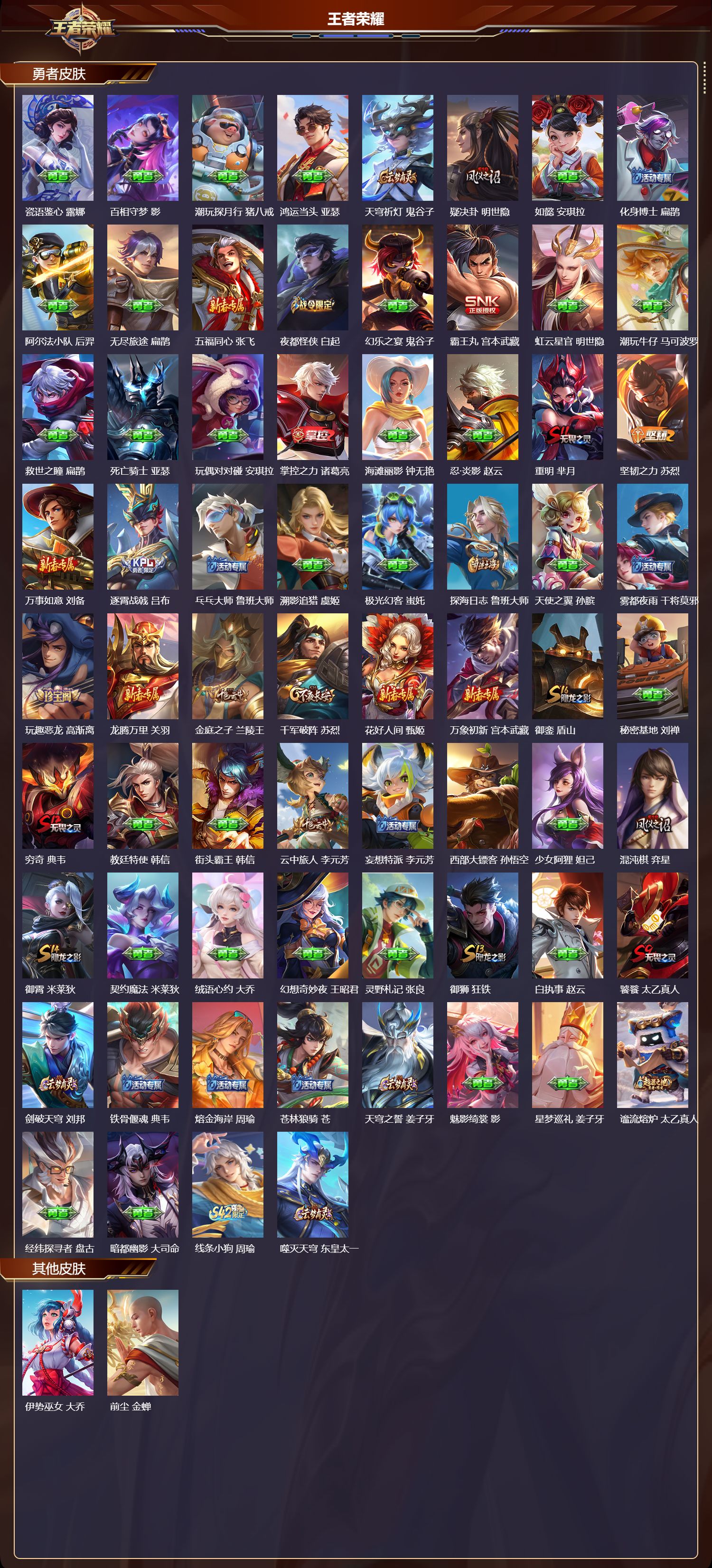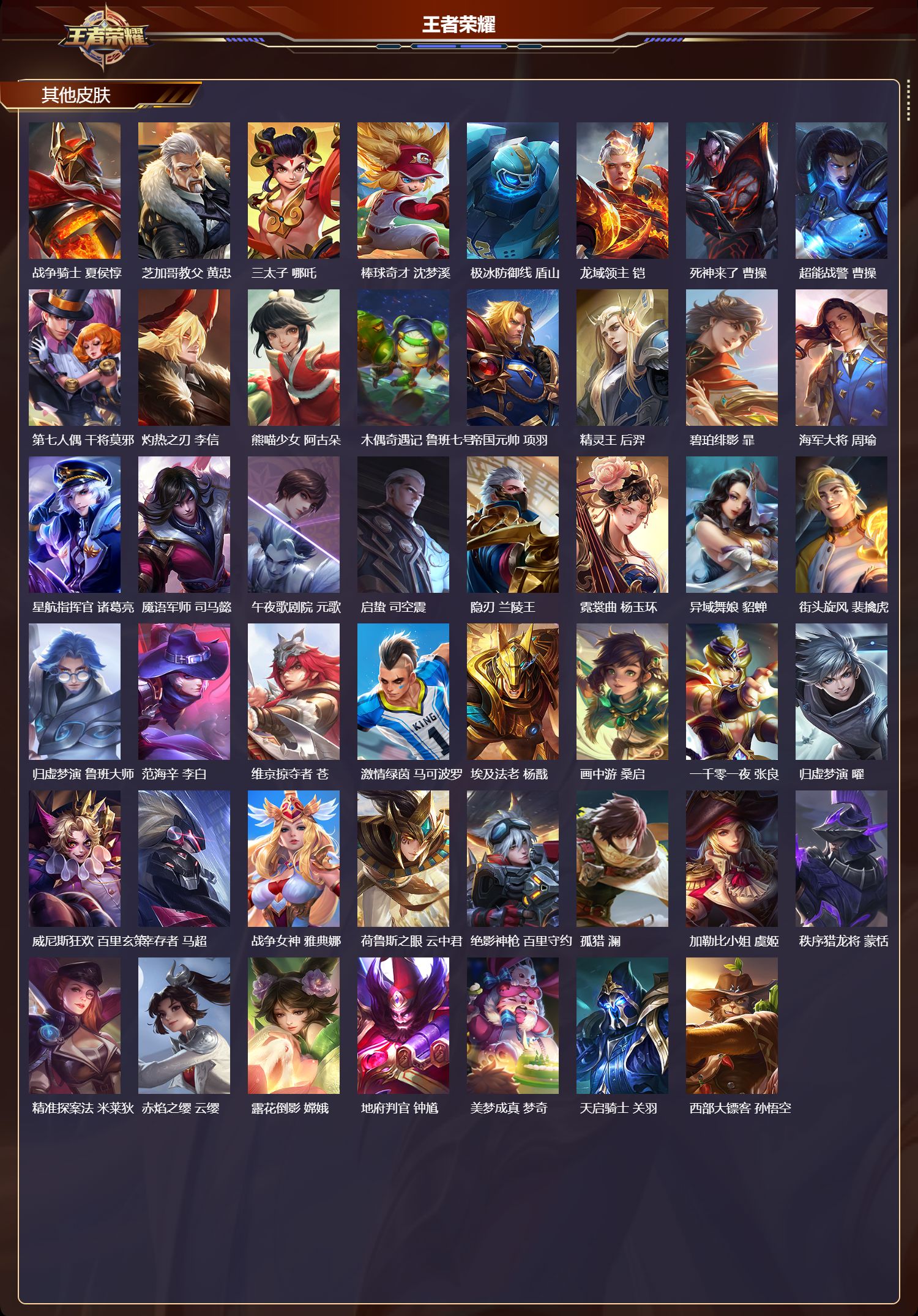 【49,其他皮肤】伊势巫女,大乔,前尘,金蝉,战争骑士,夏侯惇,芝加哥教父,黄忠,三太子,哪吒,棒球奇才,沈梦溪,极冰防御线,盾山,龙域领主,铠,死神来了,曹操,超能战警,曹操,第七人偶,干将莫邪,灼热之刃,李信,熊喵少女,阿古朵,木偶奇遇记,鲁班七号,帝国元帅,项羽,精灵王,后羿,碧珀绯影,暃,海军大将,周瑜,星航指挥官,诸葛亮,魇语军师,司马懿,午夜歌剧院,元歌,启蛰,司空震,隐刃,兰陵王,霓裳曲,杨玉环,异域舞娘,貂蝉,街头旋风,裴擒虎,归虚梦演,鲁班大师,范海辛,李白,维京掠夺者,苍,激情绿茵,马可波罗,埃及法老,杨戬,画中游,桑启,一千零一夜,张良,归虚梦演,曜,威尼斯狂欢,百里玄策,幸存者,马超,战争女神,雅典娜,荷鲁斯之眼,云中君,绝影神枪,百里守约,孤猎,澜,加勒比小姐,虞姬,秩序猎龙将,蒙恬,精准探案法,米莱狄,赤焰之缨,云缨,露花倒影,嫦娥,地府判官,钟馗,美梦成真,梦奇,天启骑士,关羽,西部大镖客,孙悟空,