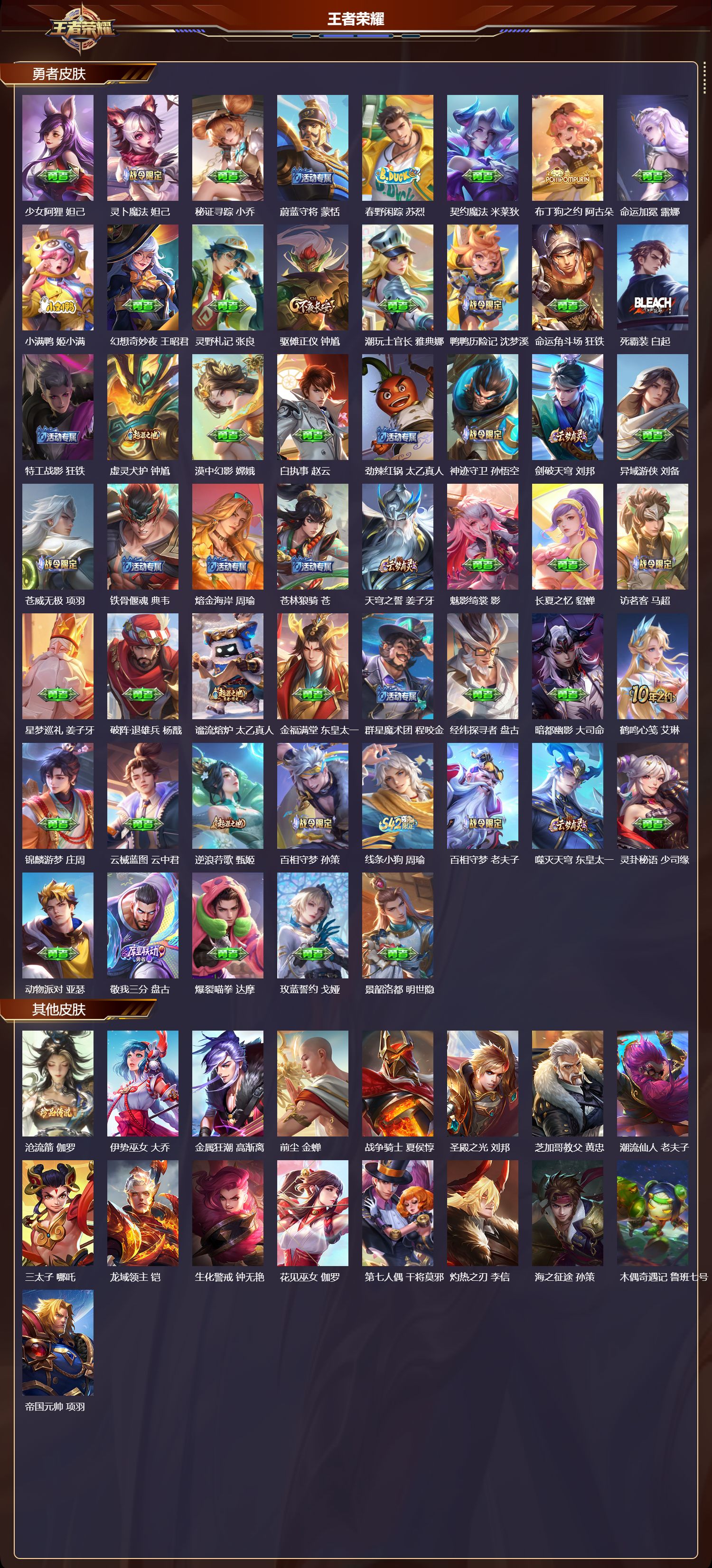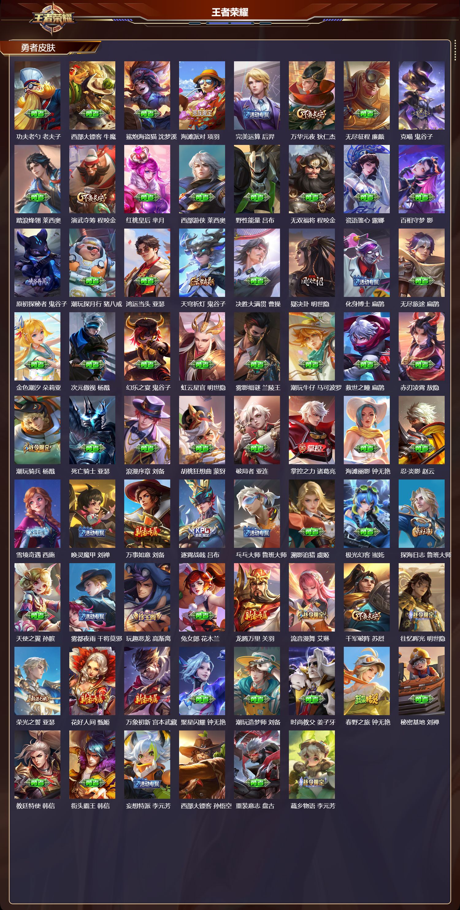 【142,勇者皮肤】时空谍影,海诺,圆桌骑士,盾山,爱心护理,阿轲,沙漠行僧,达摩,暖冬絮语,程咬金,纽约教父,刘备,龙舞盛年,沈梦溪,丁香结,小乔,功夫炙烤,廉颇,铁甲之心,典韦,醍醐杖,老夫子,白色死神,白起,黑桃队长,鲁班七号,黄金武士,典韦,阴阳师,狄仁杰,径山谋武,孙权,次元突破,哪吒,古海寻踪,张良,戏梦巡演,空空儿,功夫老勺,老夫子,西部大镖客,牛魔,鲨炮海盗猫,沈梦溪,海滩派对,项羽,完美运算,后羿,万华元夜,狄仁杰,无尽征程,廉颇,克喵,鬼谷子,踏浪烽翎,莱西奥,演武夺筹,程咬金,红桃皇后,芈月,西部游侠,莱西奥,野性能量,吕布,无双福将,程咬金,瓷语鉴心,露娜,百相守梦,影,原初探秘者,鬼谷子,潮玩探月行,猪八戒,鸿运当头,亚瑟,天穹祈灯,鬼谷子,决胜大满贯,曹操,疑决卦,明世隐,化身博士,扁鹊,无尽旅途,扁鹊,金色潮汐,朵莉亚,次元傲视,杨戬,幻乐之宴,鬼谷子,虹云星官,明世隐,雾影缉谜,兰陵王,潮玩牛仔,马可波罗,救世之瞳,扁鹊,赤刃凌霄,敖隐,潮玩骑兵,杨戬,死亡骑士,亚瑟,浪漫序章,刘备,胡桃狂想曲,蒙犽,破局者,亚连,掌控之力,诸葛亮,海滩丽影,钟无艳,忍·炎影,赵云,雪境奇遇,西施,唤灵魔甲,刘禅,万事如意,刘备,逐霄战戟,吕布,乓乓大师,鲁班大师,溯影追猎,虞姬,极光幻客,蚩奼,探海日志,鲁班大师,天使之翼,孙膑,雾都夜雨,干将莫邪,玩趣恶龙,高渐离,兔女郎,花木兰,龙腾万里,关羽,流音漫舞,艾琳,千军破阵,苏烈,往忆晖光,明世隐,荣光之誓,亚瑟,花好人间,甄姬,万象初新,宫本武藏,聚星闪耀,钟无艳,潮玩造梦师,刘备,时尚教父,姜子牙,春野之旅,钟无艳,秘密基地,刘禅,教廷特使,韩信,街头霸王,韩信,妄想特派,李元芳,西部大镖客,孙悟空,重装意志,盘古,蔬乡物语,李元芳,少女阿狸,妲己,灵卜魔法,妲己,秘证寻踪,小乔,蔚蓝守将,蒙恬,春野闲踪,苏烈,契约魔法,米莱狄,布丁狗之约,阿古朵,命运加冕,露娜,小满鸭,姬小满,幻想奇妙夜,王昭君,灵野札记,张良,驱傩正仪,钟馗,潮玩士官长,雅典娜,鸭鸭历险记,沈梦溪,命运角斗场,狂铁,死霸装,白起,特工战影,狂铁,虚灵犬护,钟馗,漠中幻影,嫦娥,白执事,赵云,劲辣红锅,太乙真人,神迹守卫,孙悟空,剑破天穹,刘邦,异域游侠,刘备,苍威无极,项羽,铁骨偃魂,典韦,熔金海岸,周瑜,苍林狼骑,苍,天穹之誓,姜子牙,魅影绮裳,影,长夏之忆,貂蝉,访茗客,马超,星梦巡礼,姜子牙,破阵·退雄兵,杨戬,谧流熔炉,太乙真人,金福满堂,东皇太一,群星魔术团,程咬金,经纬探寻者,盘古,暗都幽影,大司命,鹤鸣心笺,艾琳,锦麟游梦,庄周,云械蓝图,云中君,逆浪荇歌,甄姬,百相守梦,孙策,线条小狗,周瑜,百相守梦,老夫子,噬灭天穹,东皇太一,灵卦秘语,少司缘,动物派对,亚瑟,敬我三分,盘古,爆裂喵拳,达摩,玫蓝誓约,戈娅,景韶洛都,明世隐,