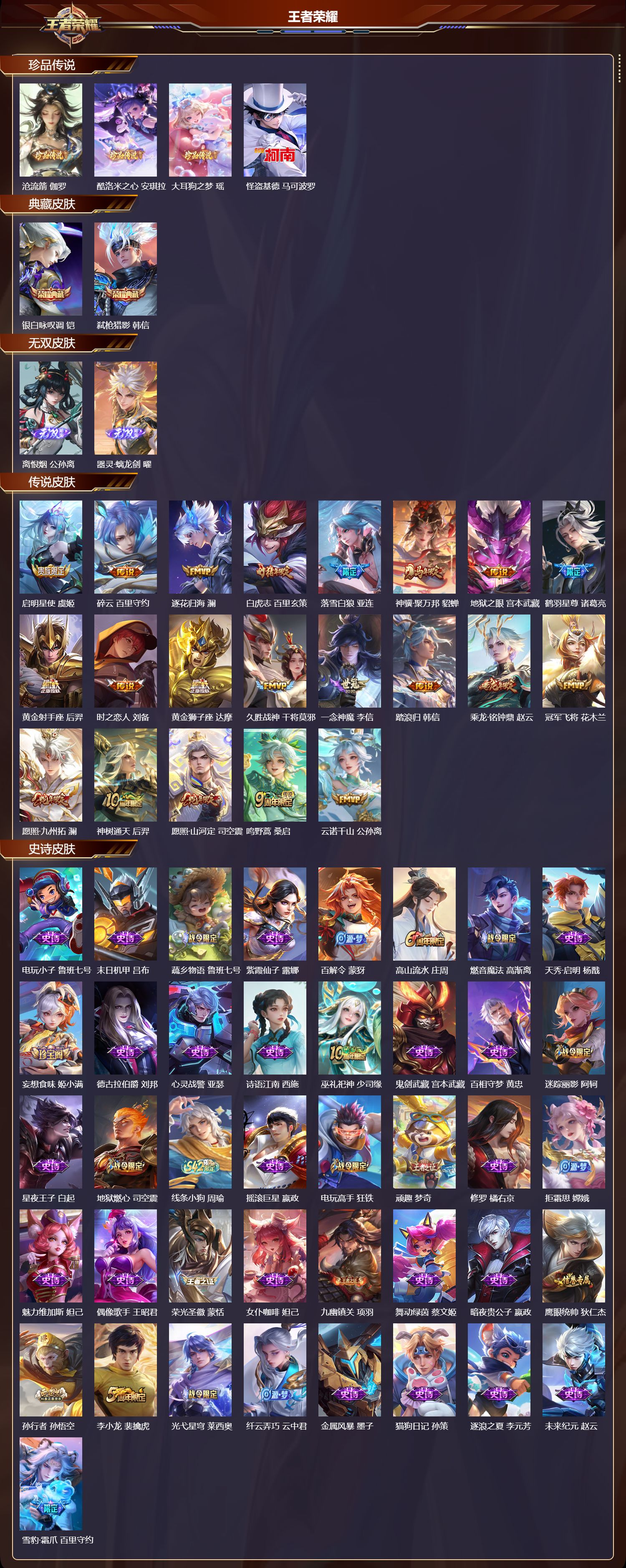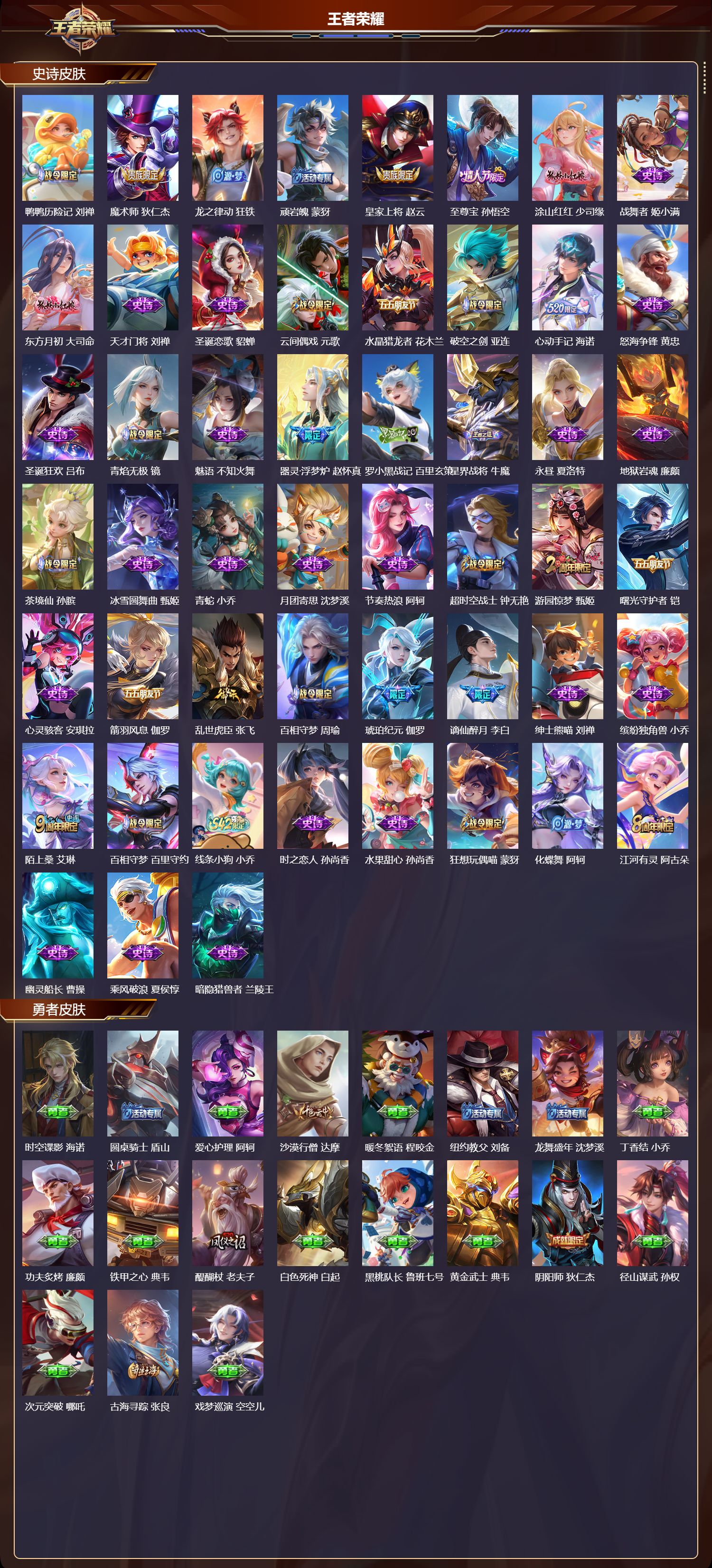 【92,史诗皮肤】电玩小子,鲁班七号,末日机甲,吕布,蔬乡物语,鲁班七号,紫霞仙子,露娜,百解令,蒙犽,高山流水,庄周,燃音魔法,高渐离,天秀·启明,杨戬,妄想食味,姬小满,德古拉伯爵,刘邦,心灵战警,亚瑟,诗语江南,西施,巫礼祀神,少司缘,鬼剑武藏,宫本武藏,百相守梦,黄忠,迷踪丽影,阿轲,星夜王子,白起,地狱燃心,司空震,线条小狗,周瑜,摇滚巨星,嬴政,电玩高手,狂铁,顽趣,梦奇,修罗,橘右京,拒霜思,嫦娥,魅力维加斯,妲己,偶像歌手,王昭君,荣光圣徽,蒙恬,女仆咖啡,妲己,九幽镇关,项羽,舞动绿茵,蔡文姬,暗夜贵公子,嬴政,鹰眼统帅,狄仁杰,孙行者,孙悟空,李小龙,裴擒虎,光弋星穹,莱西奥,纤云弄巧,云中君,金属风暴,墨子,猫狗日记,孙策,逐浪之夏,李元芳,未来纪元,赵云,雪豹·霜爪,百里守约,鸭鸭历险记,刘禅,魔术师,狄仁杰,龙之律动,狂铁,顽岩魄,蒙犽,皇家上将,赵云,至尊宝,孙悟空,涂山红红,少司缘,战舞者,姬小满,东方月初,大司命,天才门将,刘禅,圣诞恋歌,貂蝉,云间偶戏,元歌,水晶猎龙者,花木兰,破空之剑,亚连,心动手记,海诺,怒海争锋,黄忠,圣诞狂欢,吕布,青焰无极,镜,魅语,不知火舞,器灵·浮梦炉,赵怀真,罗小黑战记,百里玄策,星界战将,牛魔,永昼,夏洛特,地狱岩魂,廉颇,茶境仙,孙膑,冰雪圆舞曲,甄姬,青蛇,小乔,月团寄思,沈梦溪,节奏热浪,阿轲,超时空战士,钟无艳,游园惊梦,甄姬,曙光守护者,铠,心灵骇客,安琪拉,箭羽风息,伽罗,乱世虎臣,张飞,百相守梦,周瑜,琥珀纪元,伽罗,谪仙醉月,李白,绅士熊喵,刘禅,缤纷独角兽,小乔,陌上桑,艾琳,百相守梦,百里守约,线条小狗,小乔,时之恋人,孙尚香,水果甜心,孙尚香,狂想玩偶喵,蒙犽,化蝶舞,阿轲,江河有灵,阿古朵,幽灵船长,曹操,乘风破浪,夏侯惇,暗隐猎兽者,兰陵王,